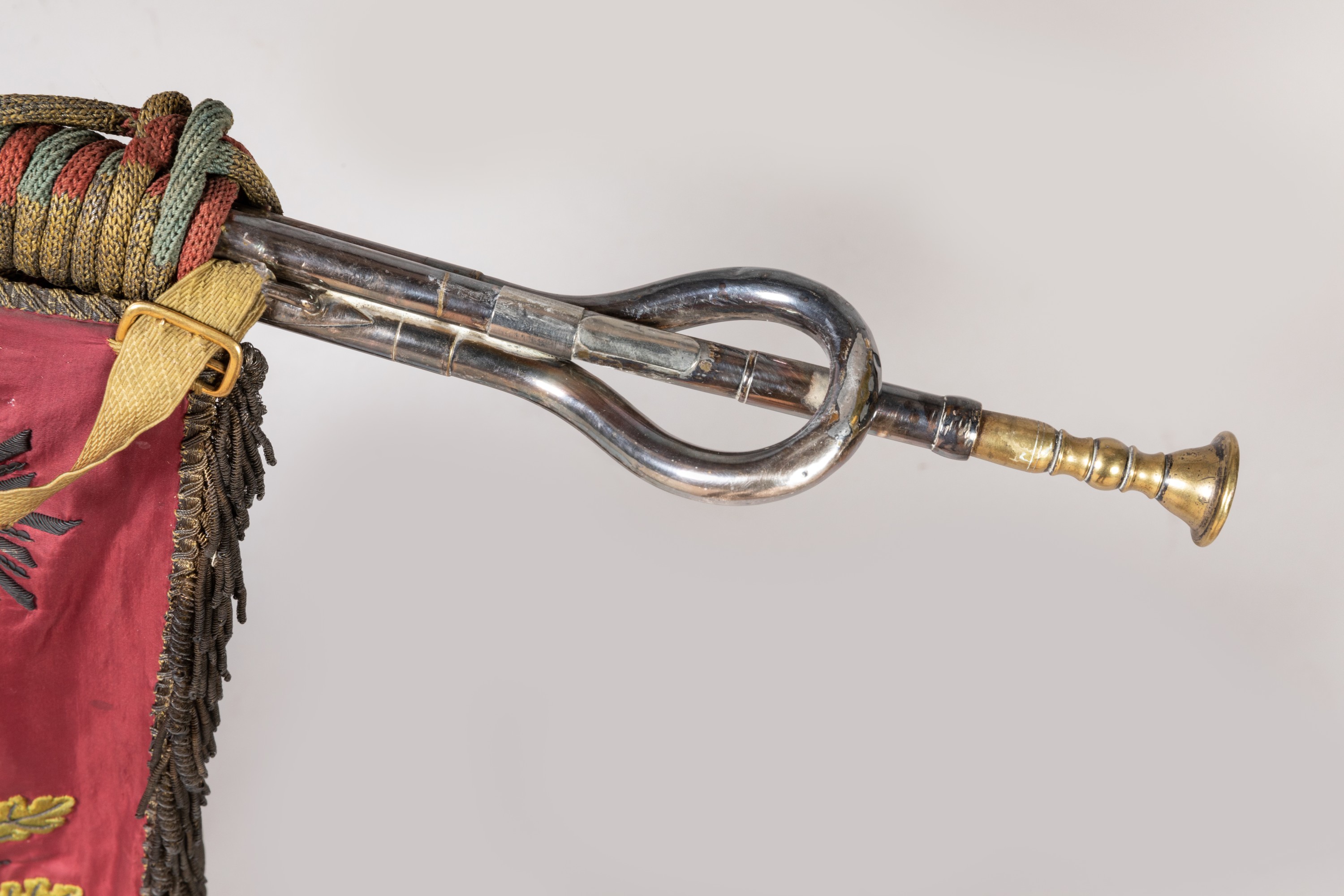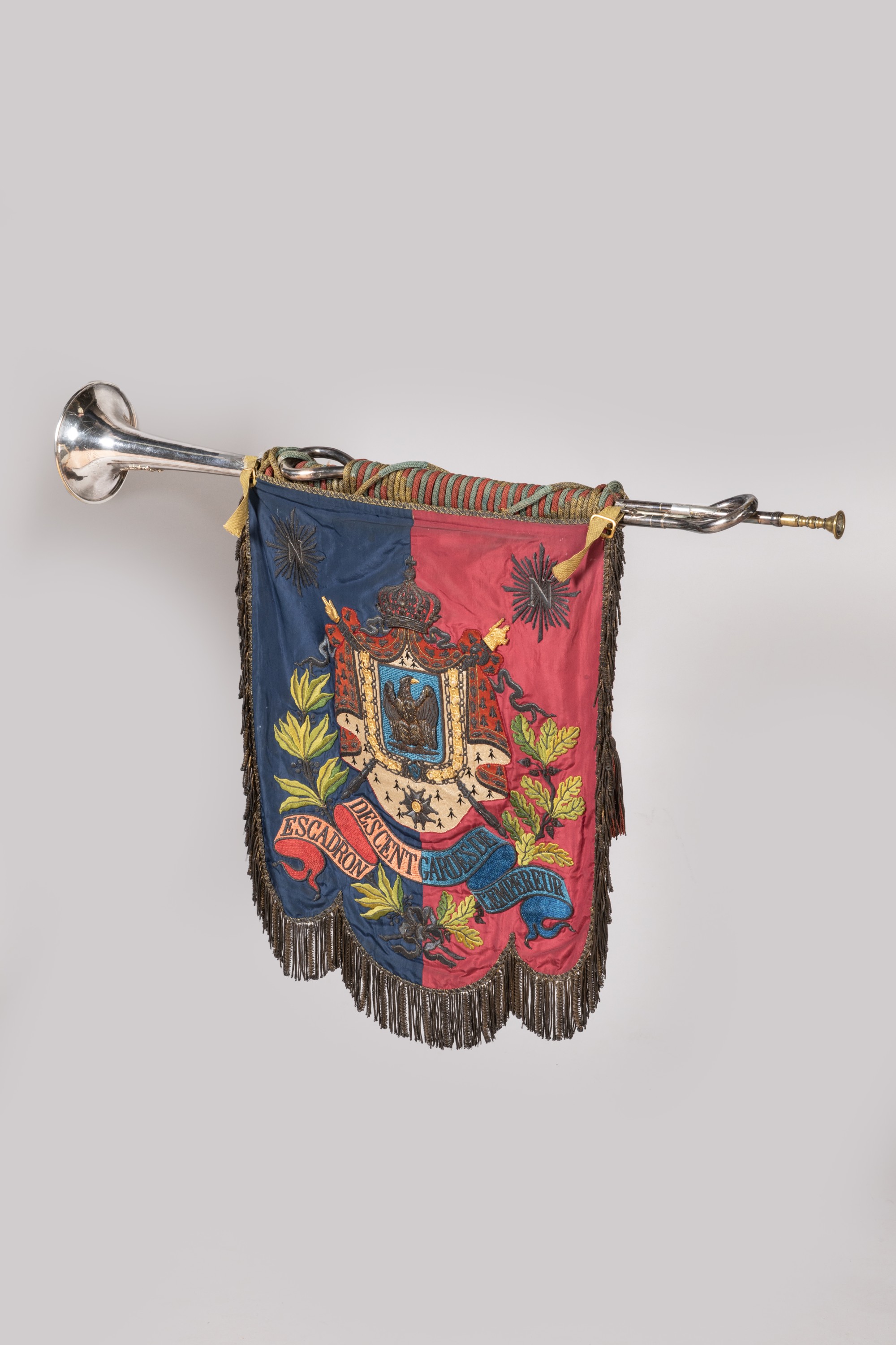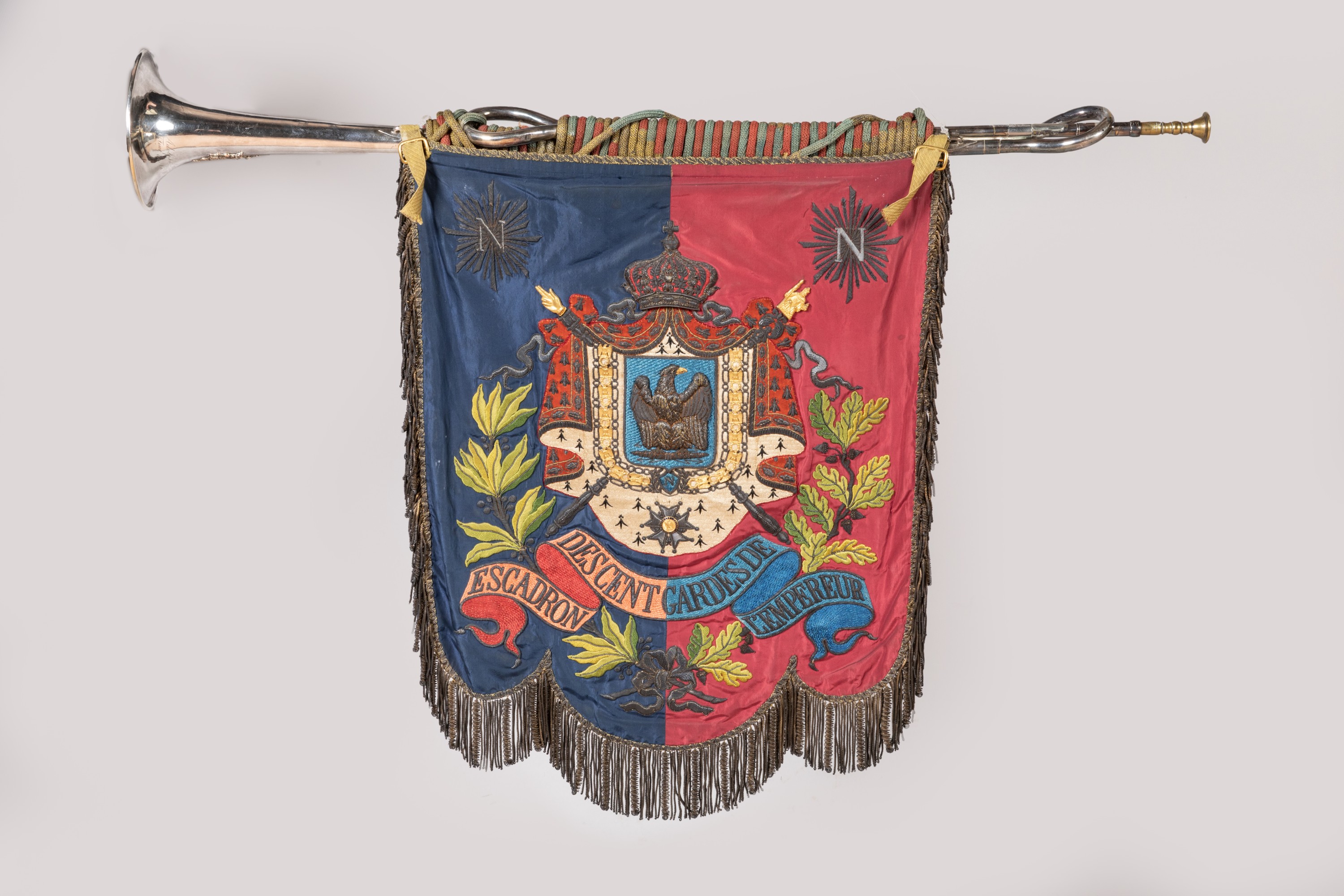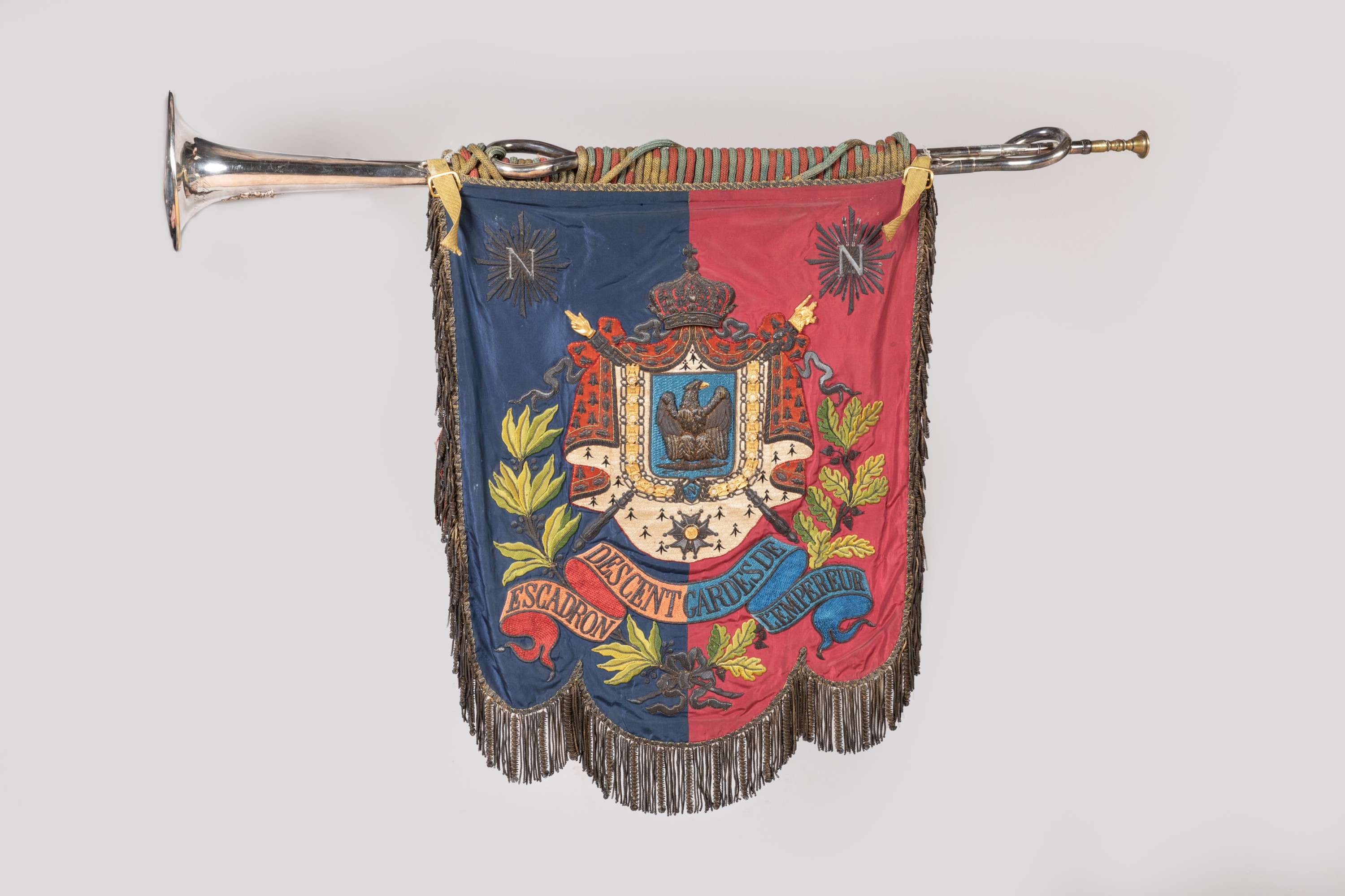 Extremely rare and exceptionally well-preserved ceremonial trumpet, banner and case having belonged to the Cent-gardes squadron, an elite cavalry squadron of the Second French Empire primarily responsible for protecting the person and family of Emperor Napoleon III.