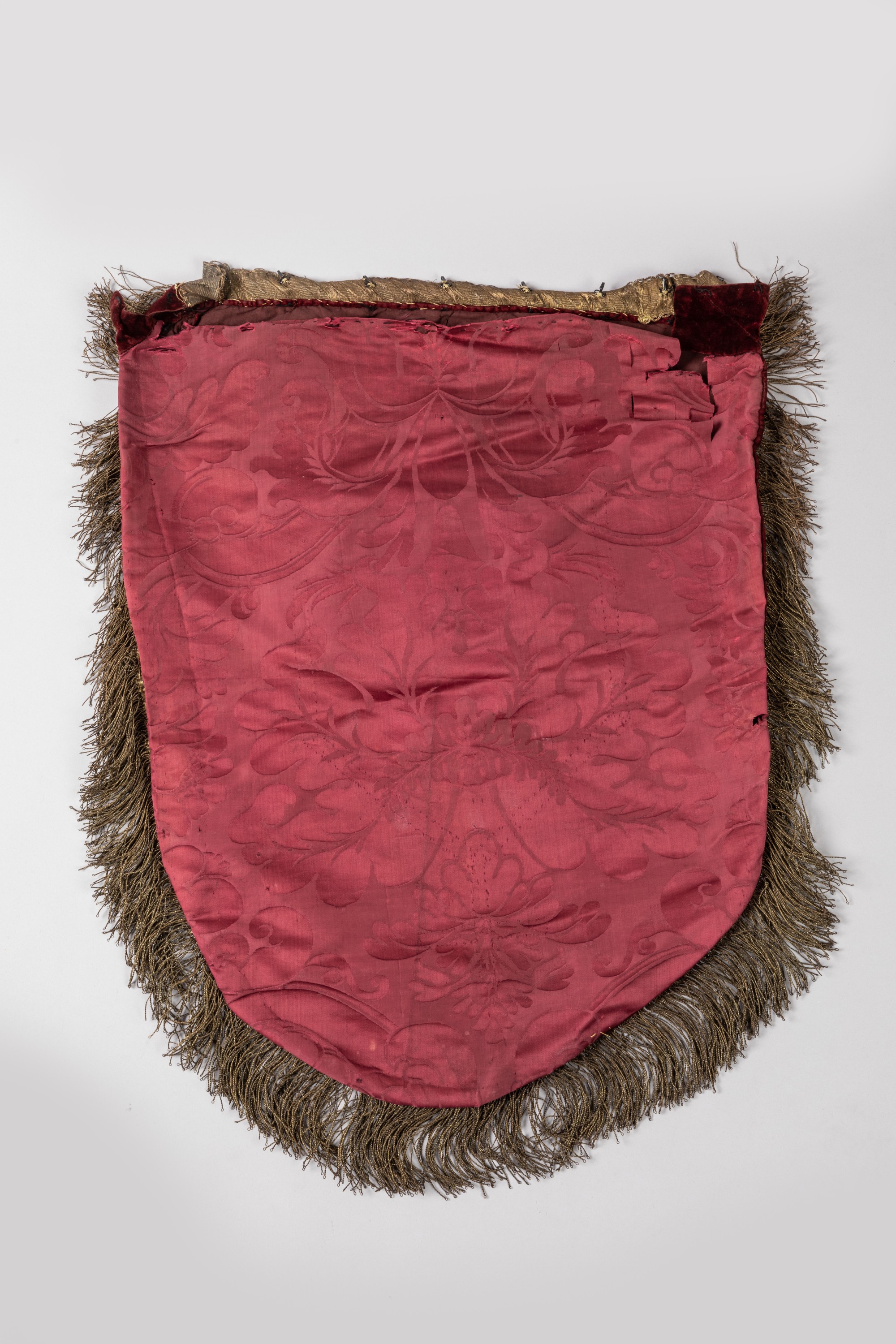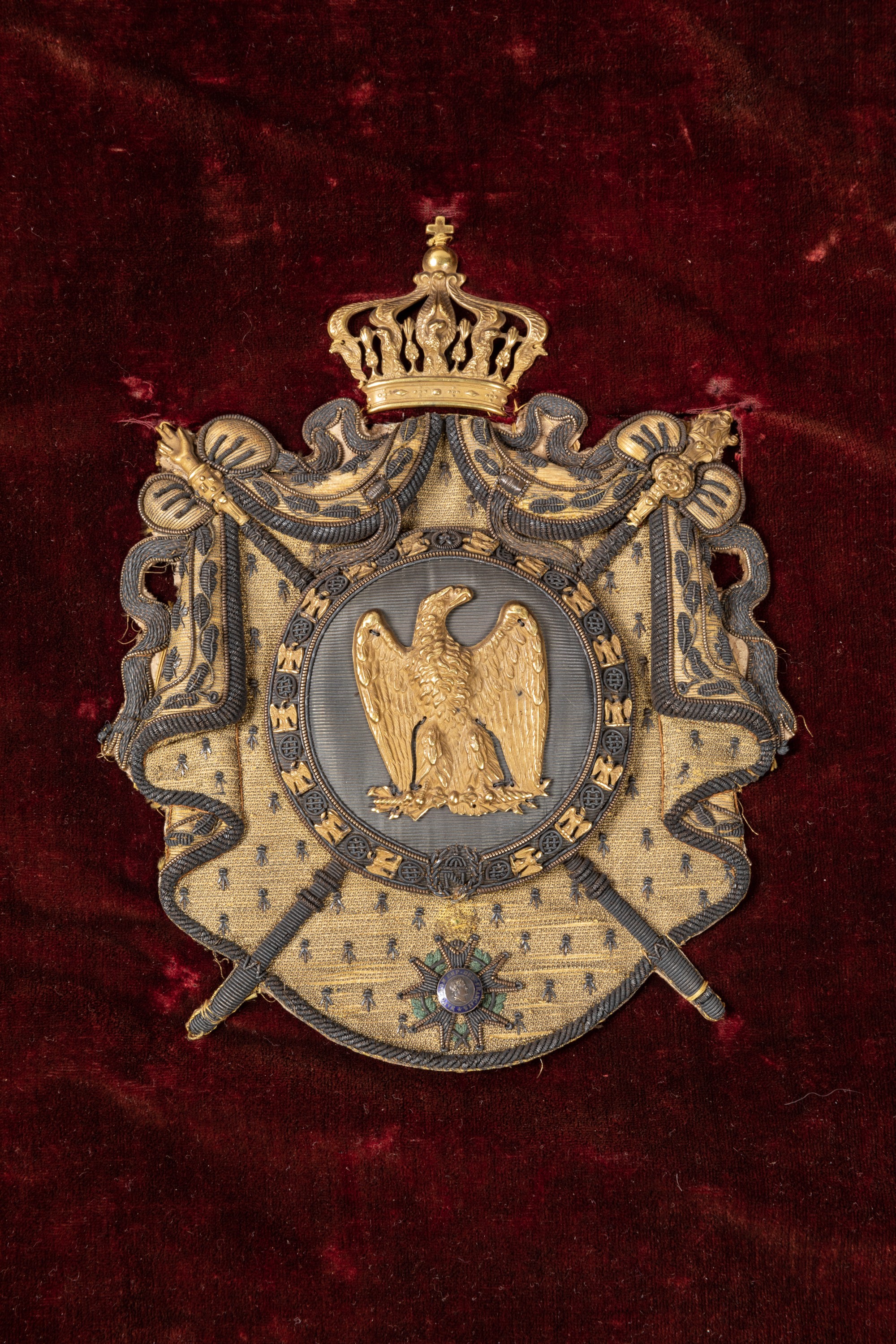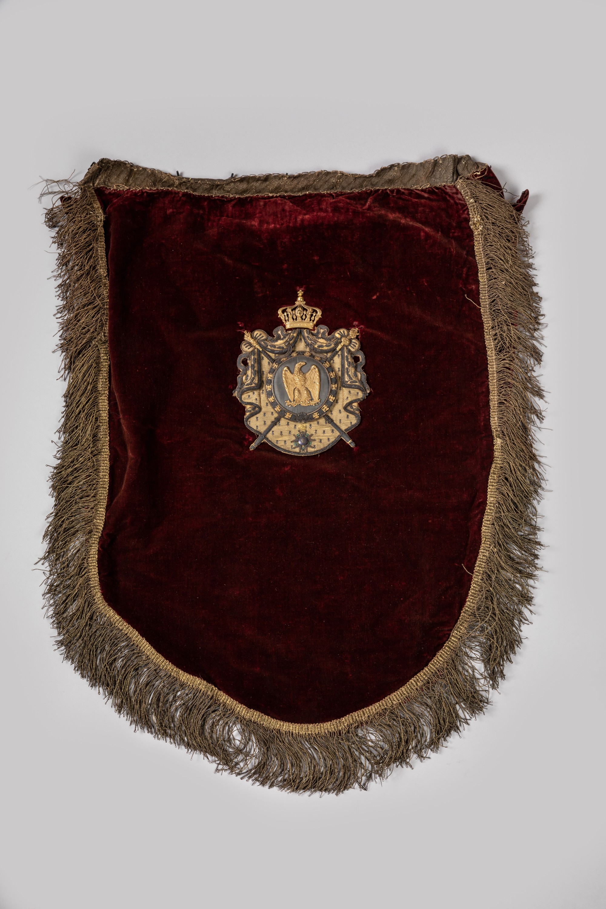 Motif central richement brodé en fort relief des grandes armes impériales en fils canetille, paillettes à couronne et attributs en laiton doré. Finition de franges dorées sur le pourtour.