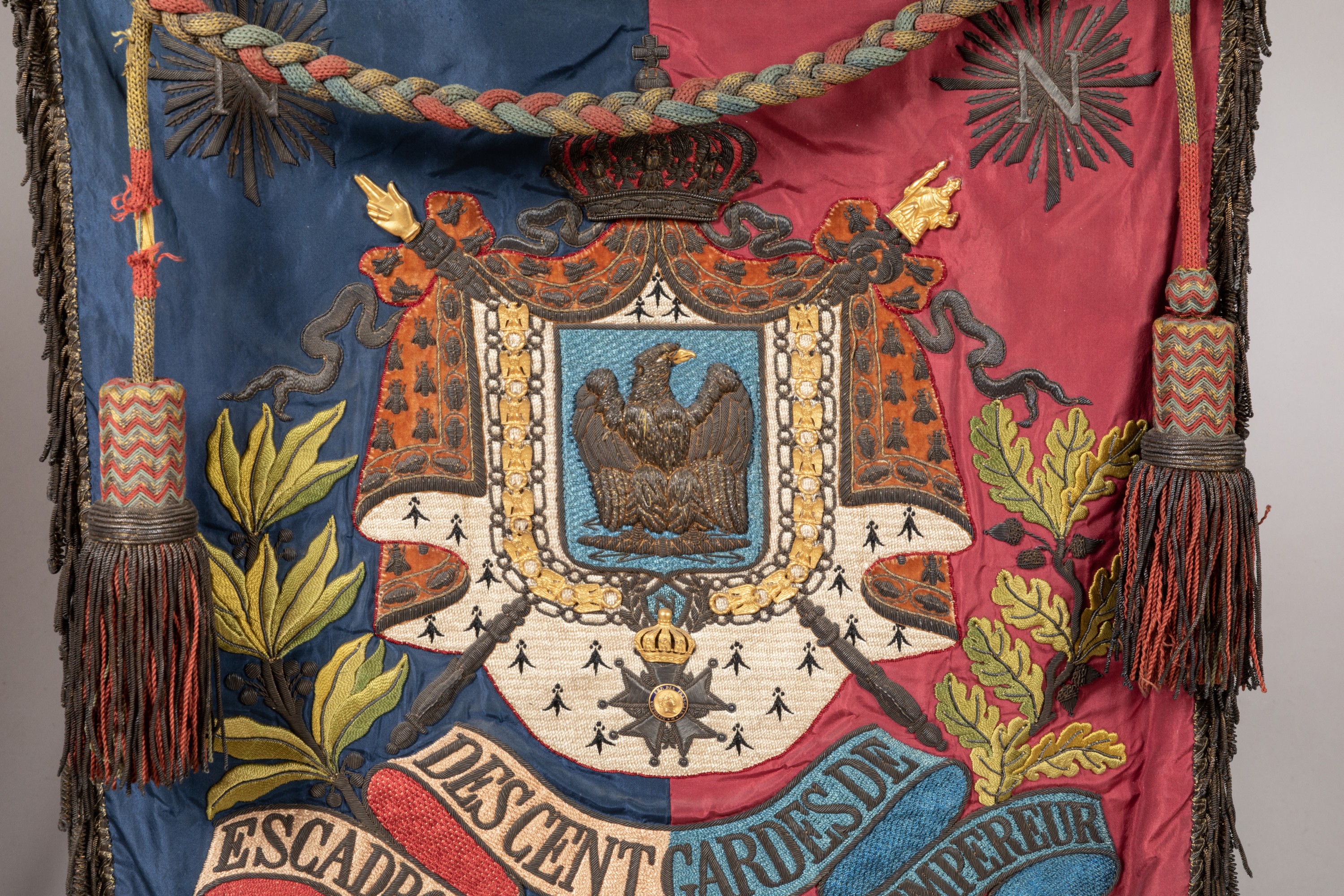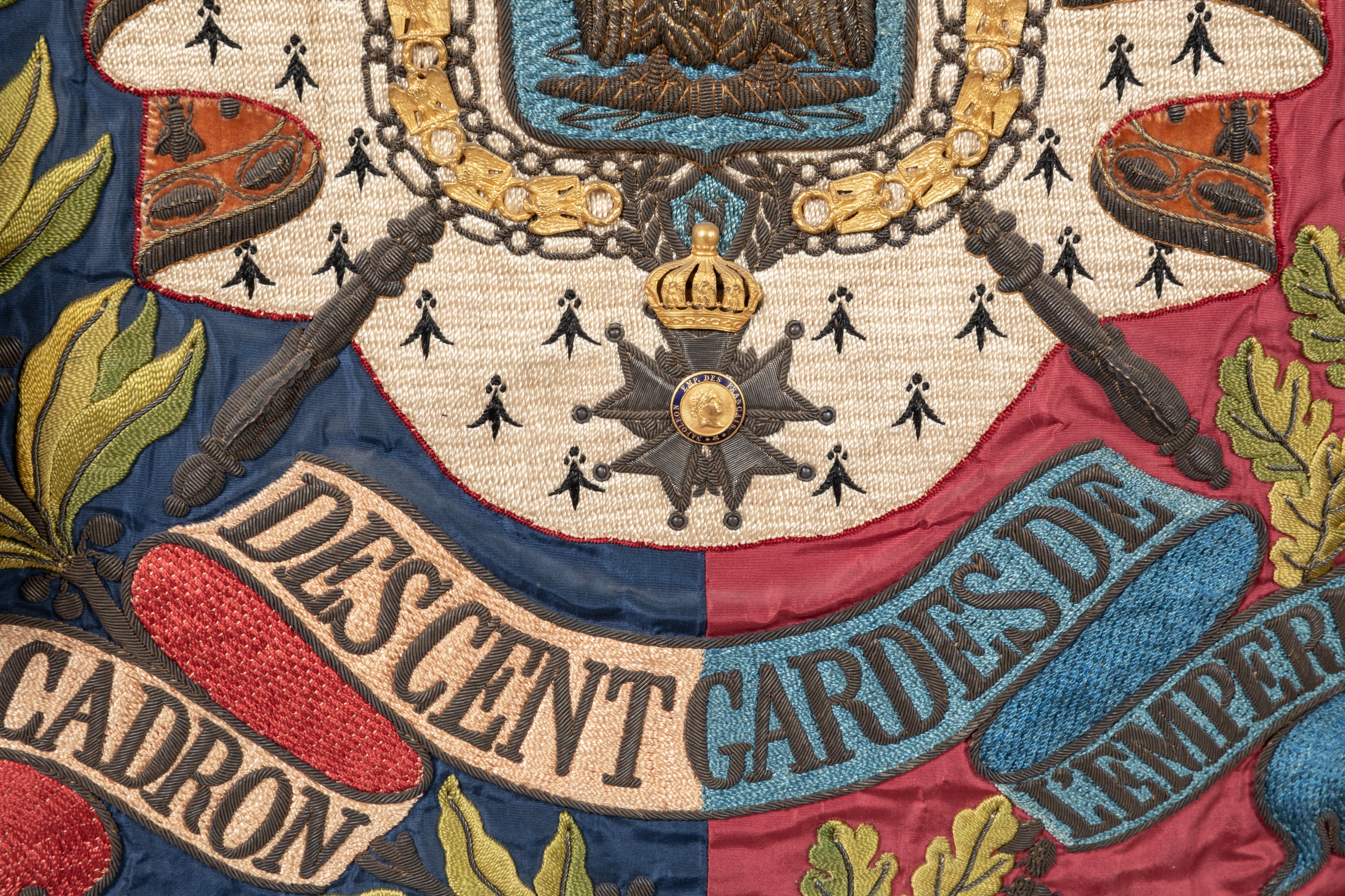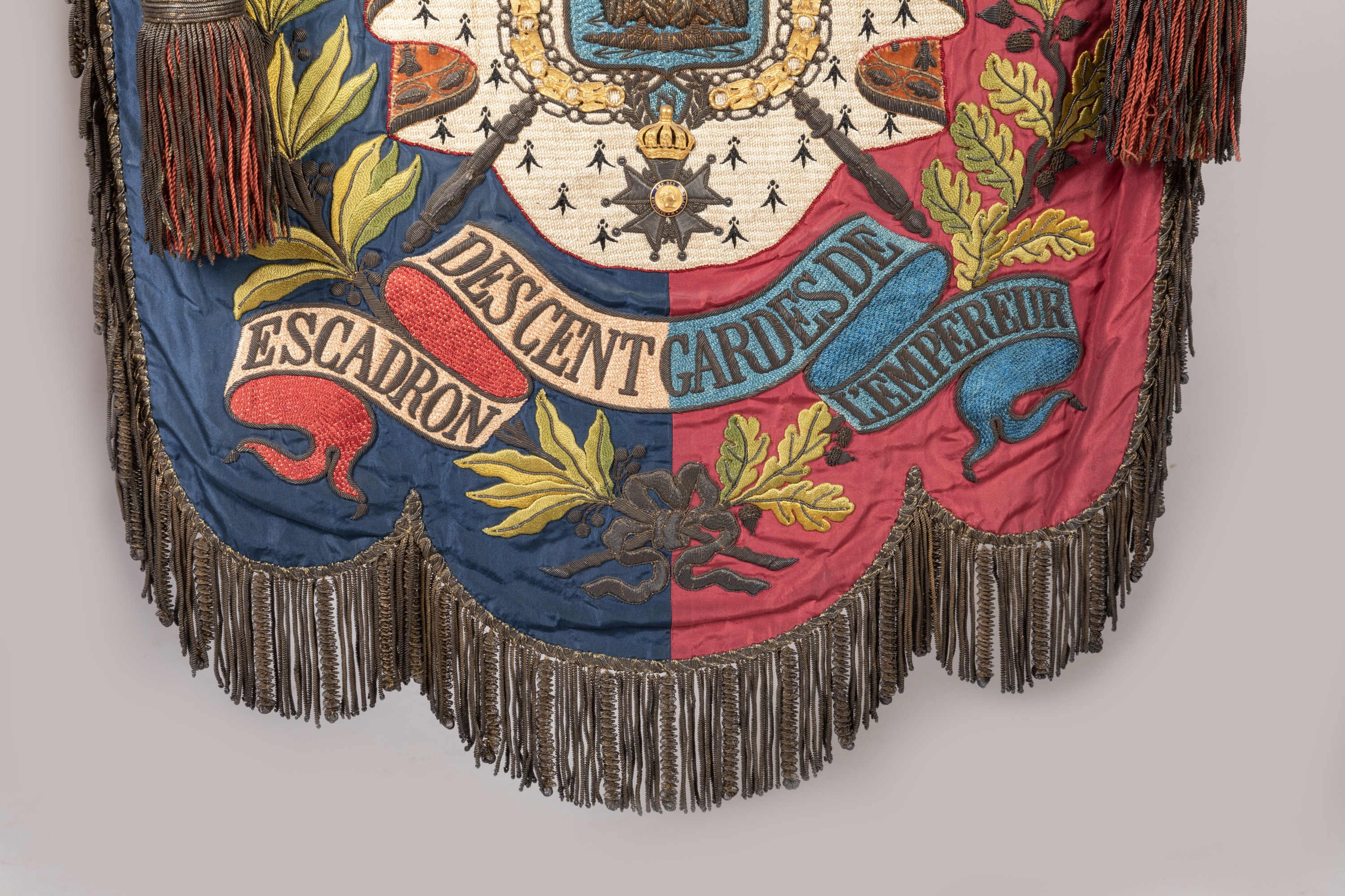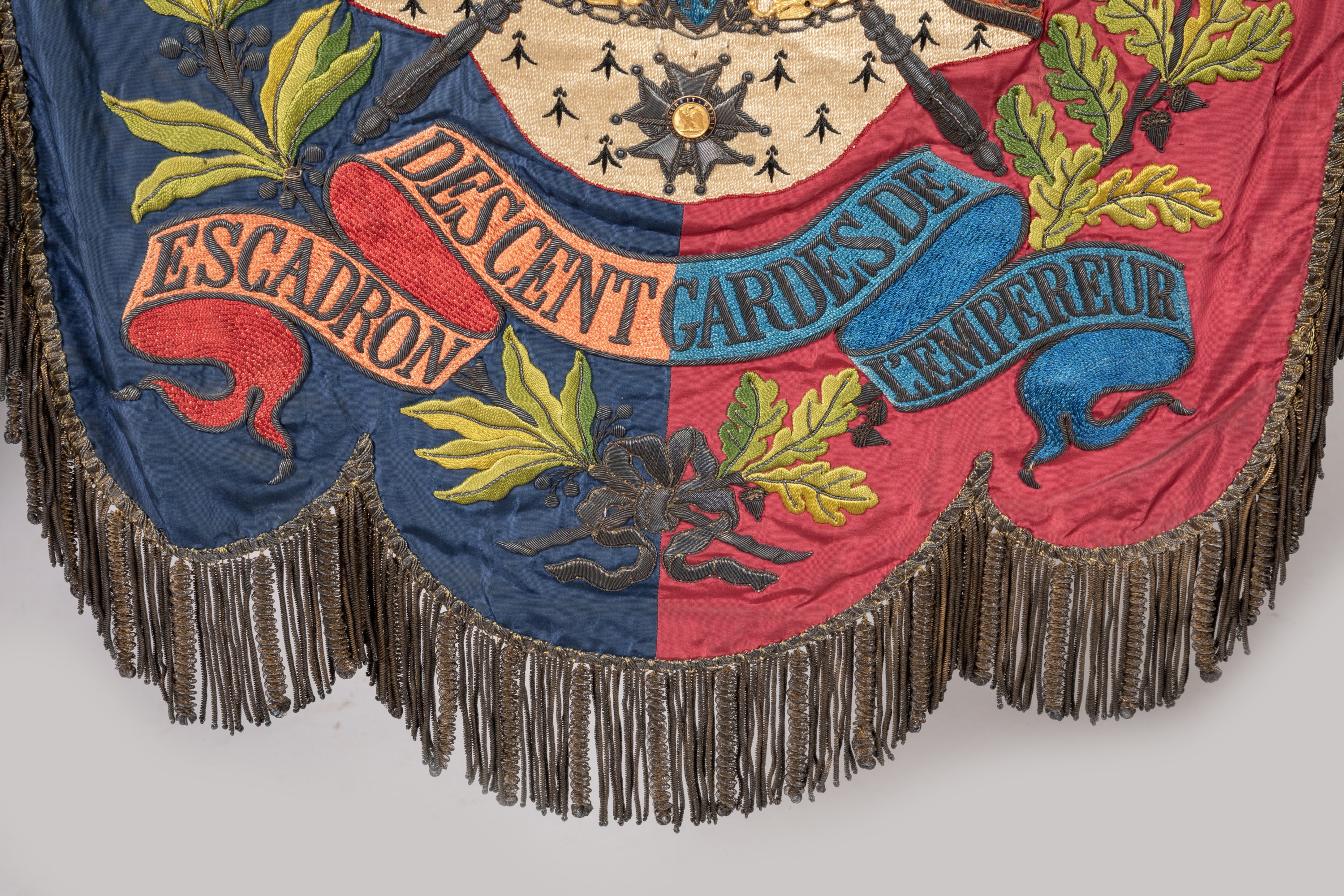 Banderole bicolore, brodée "Escadron des Cent-gardes de l'Empereur". Dans les coins supérieurs, "N" sur éclairs en fils argentés. Finition bordée de franges dorées sur le pourtour.