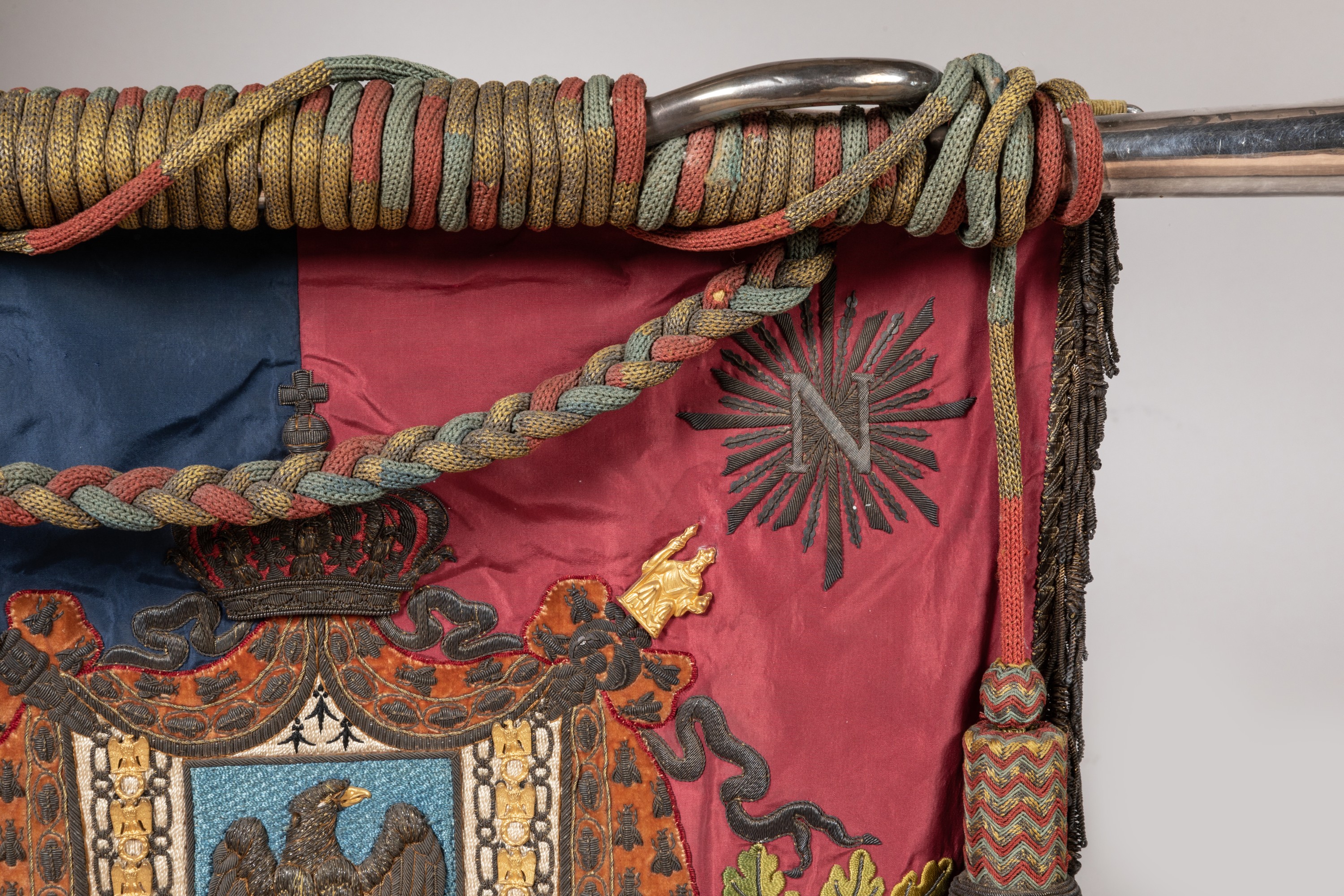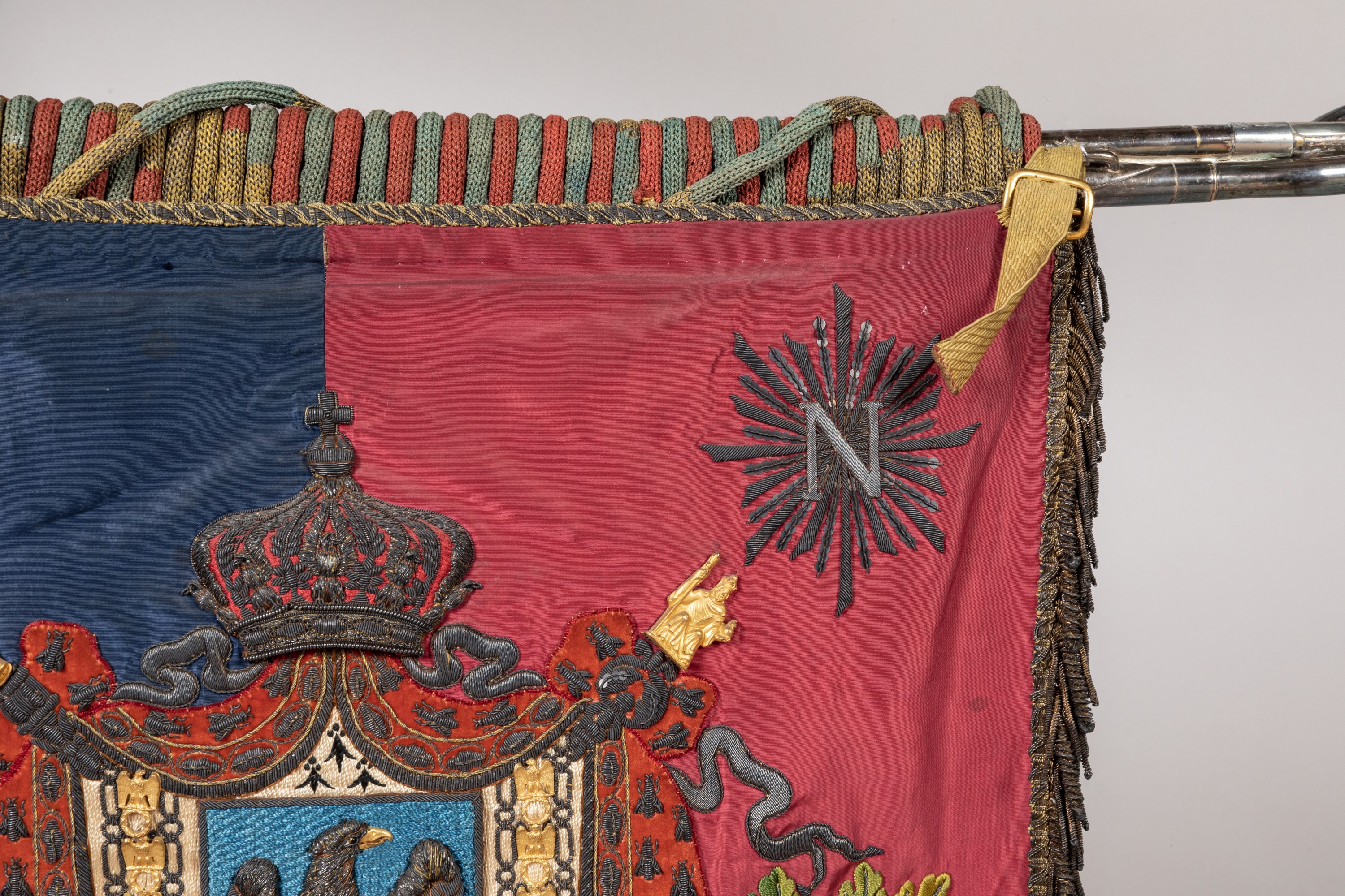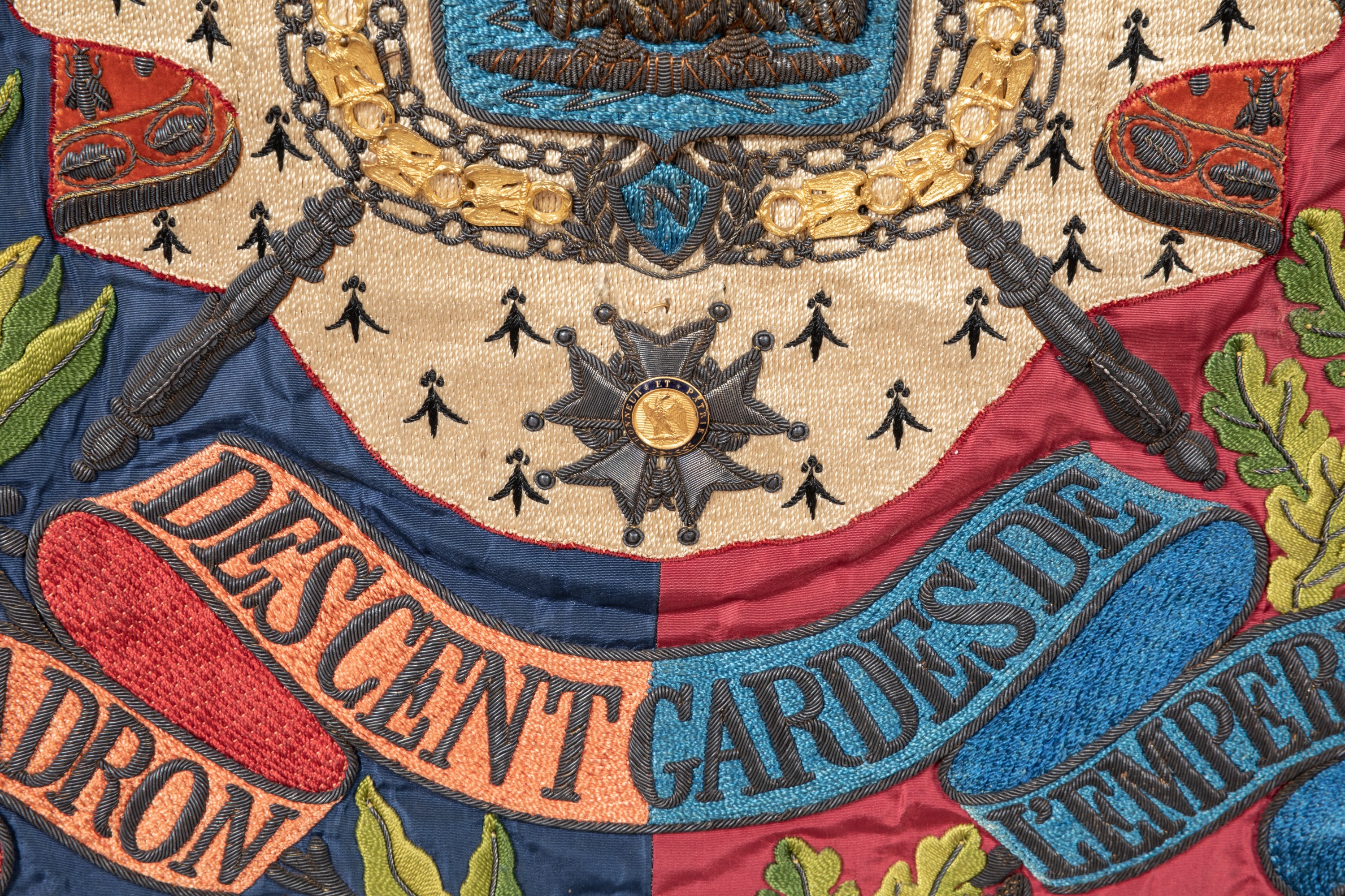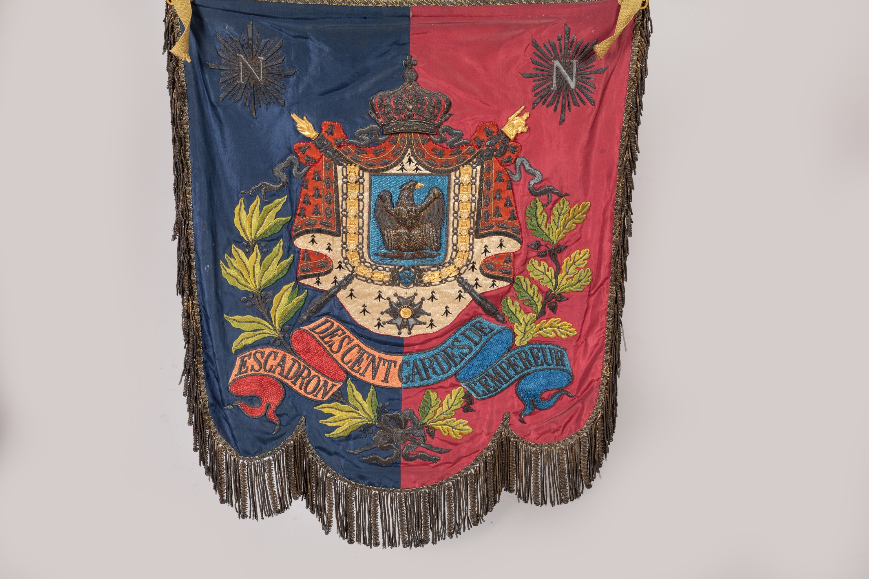 Banderole bicolore, brodée "Escadron des Cent-gardes de l'Empereur". Dans les coins supérieurs, "N" sur éclairs en fils argentés. Finition bordée de franges dorées sur le pourtour.