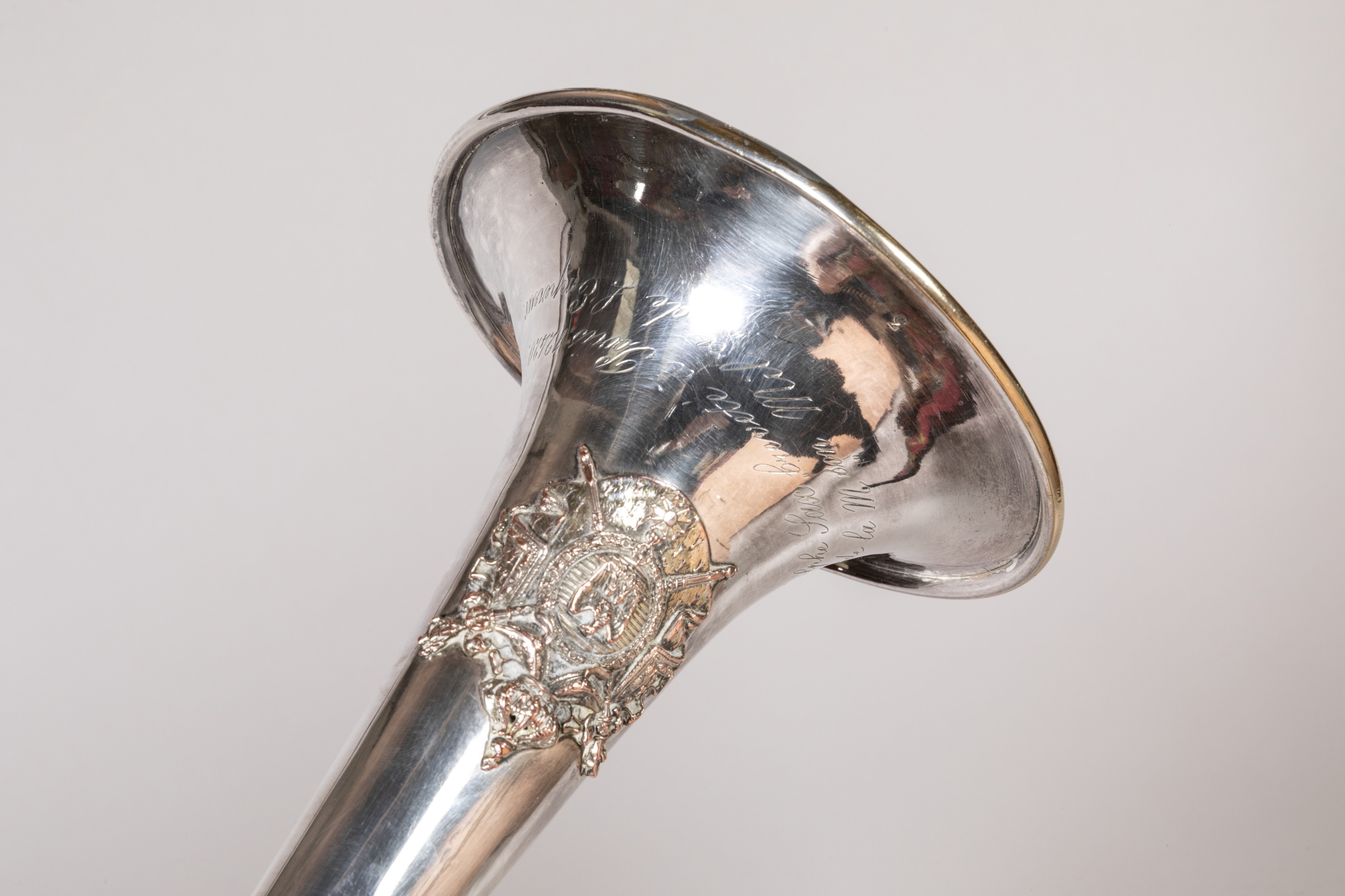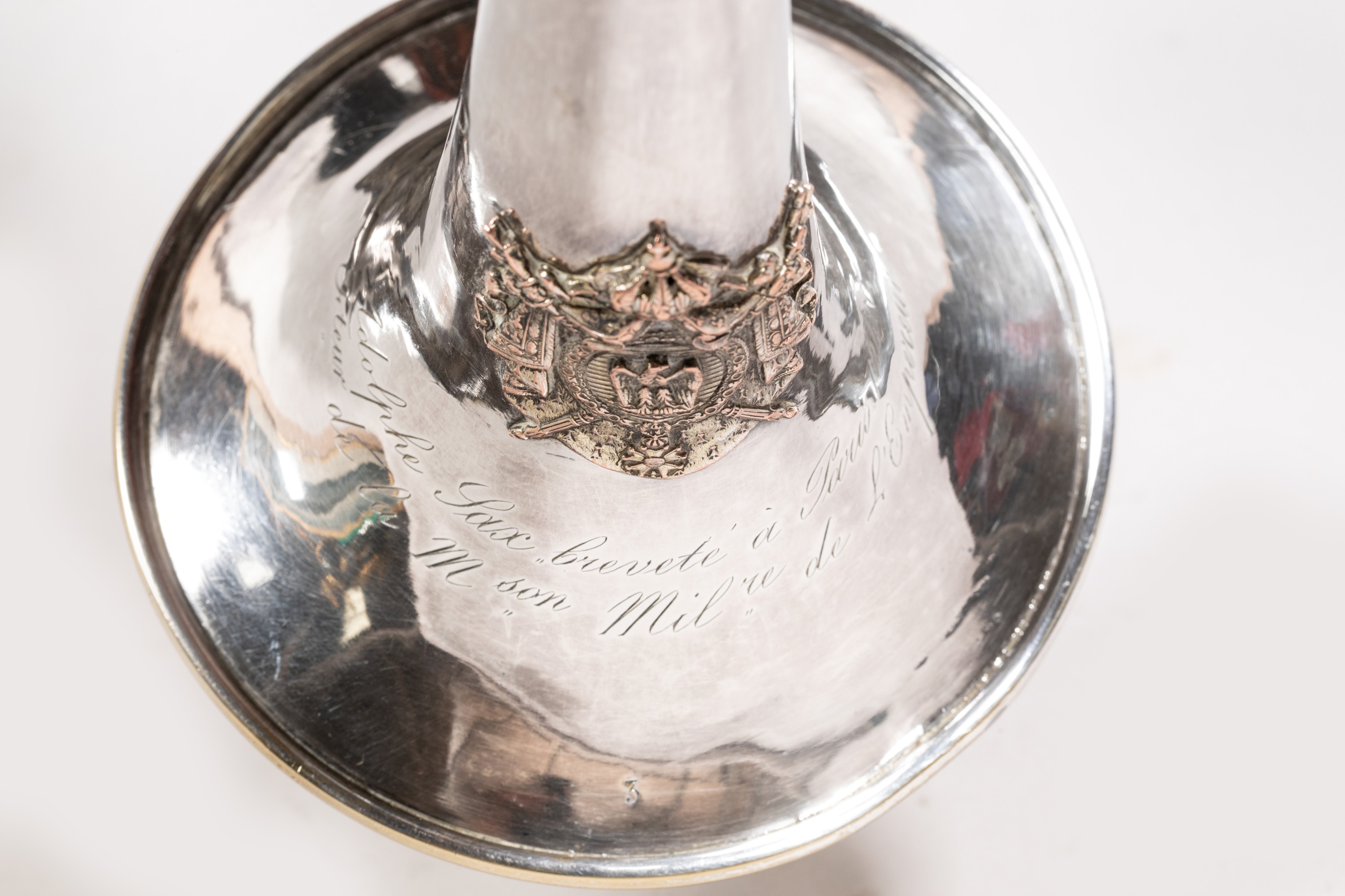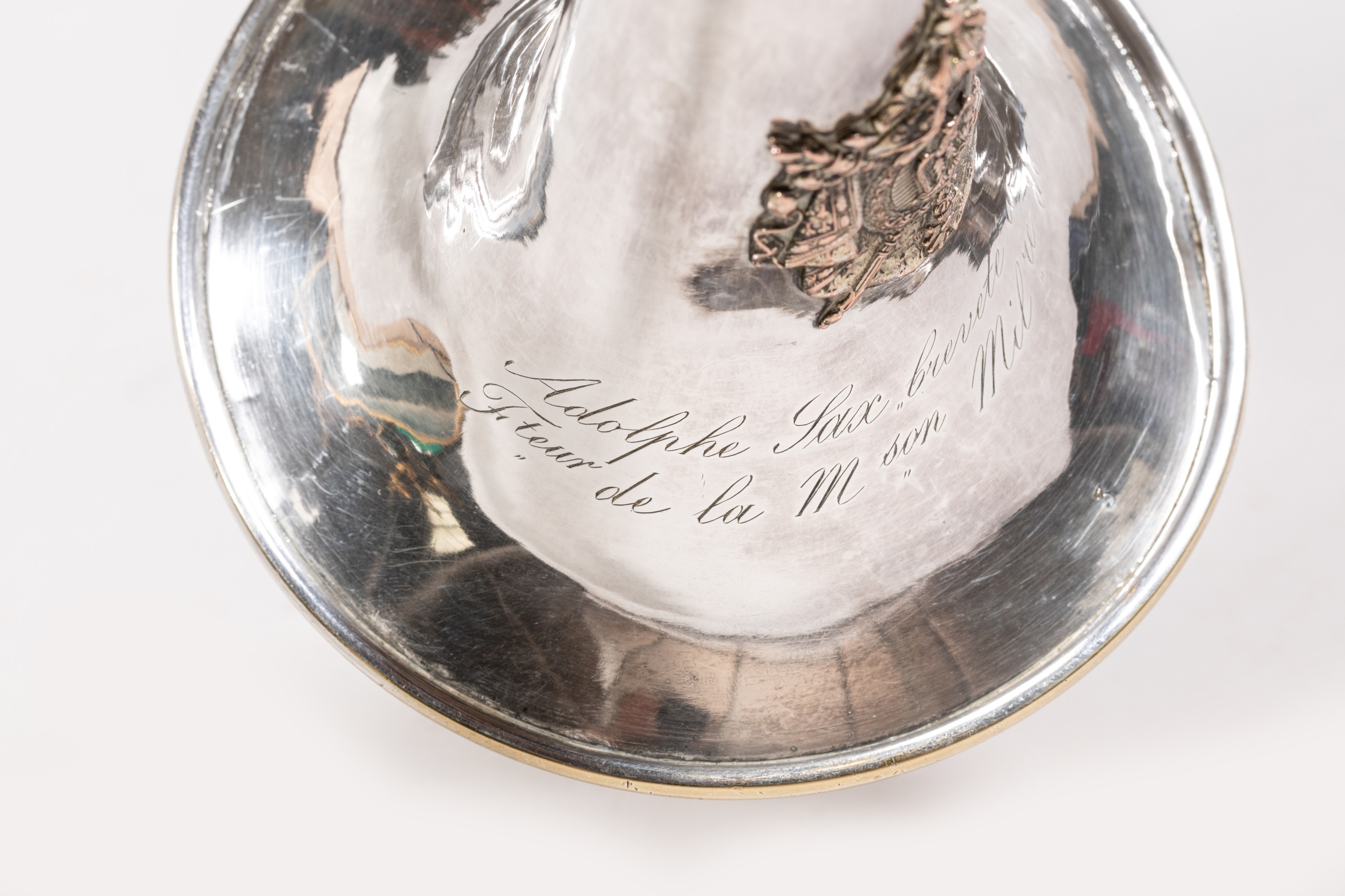 Magnifique trompette droite en cuivre argenté, signée sur le cornet "Adolphe Sax, breveté à Paris, 12 420, Fcant de Mson Milre de l'Empereur", et frappée du n° 3. Ornée d'un motif aux grandes armes impériales ciselées et dorées.