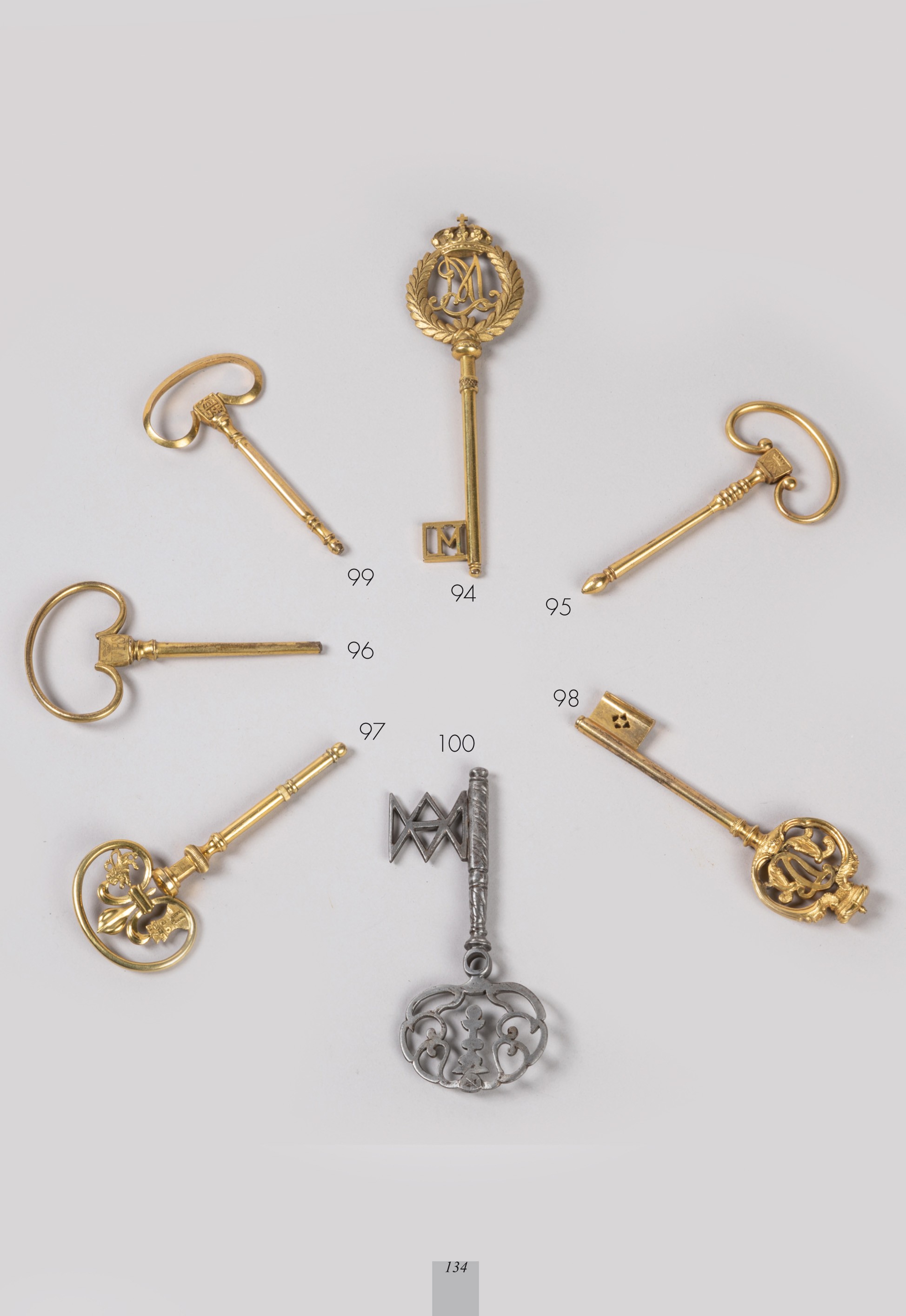 A European 18th-19th century metal chamberlain key bearing a "M A" monogram. Traces of gilding.