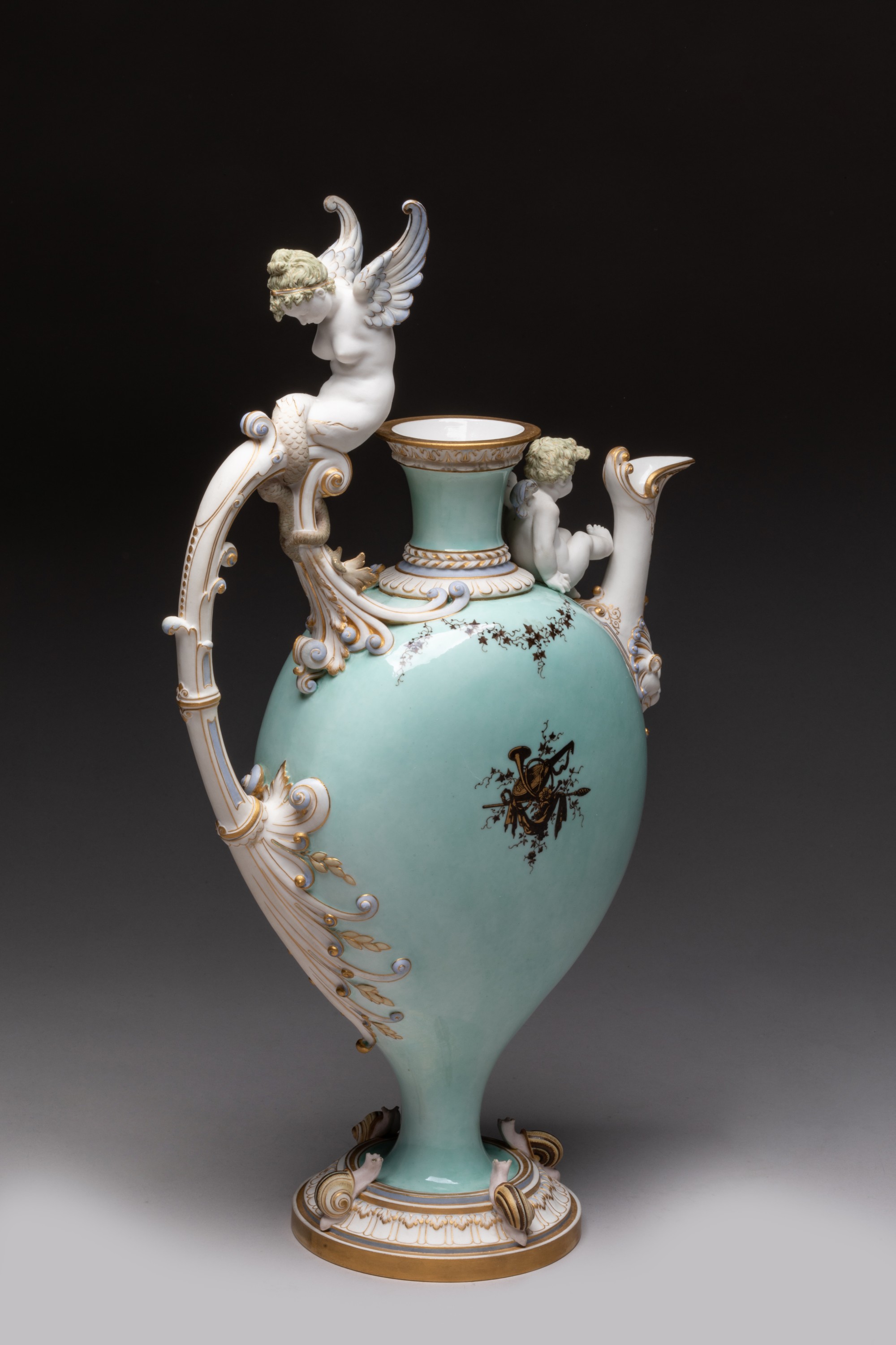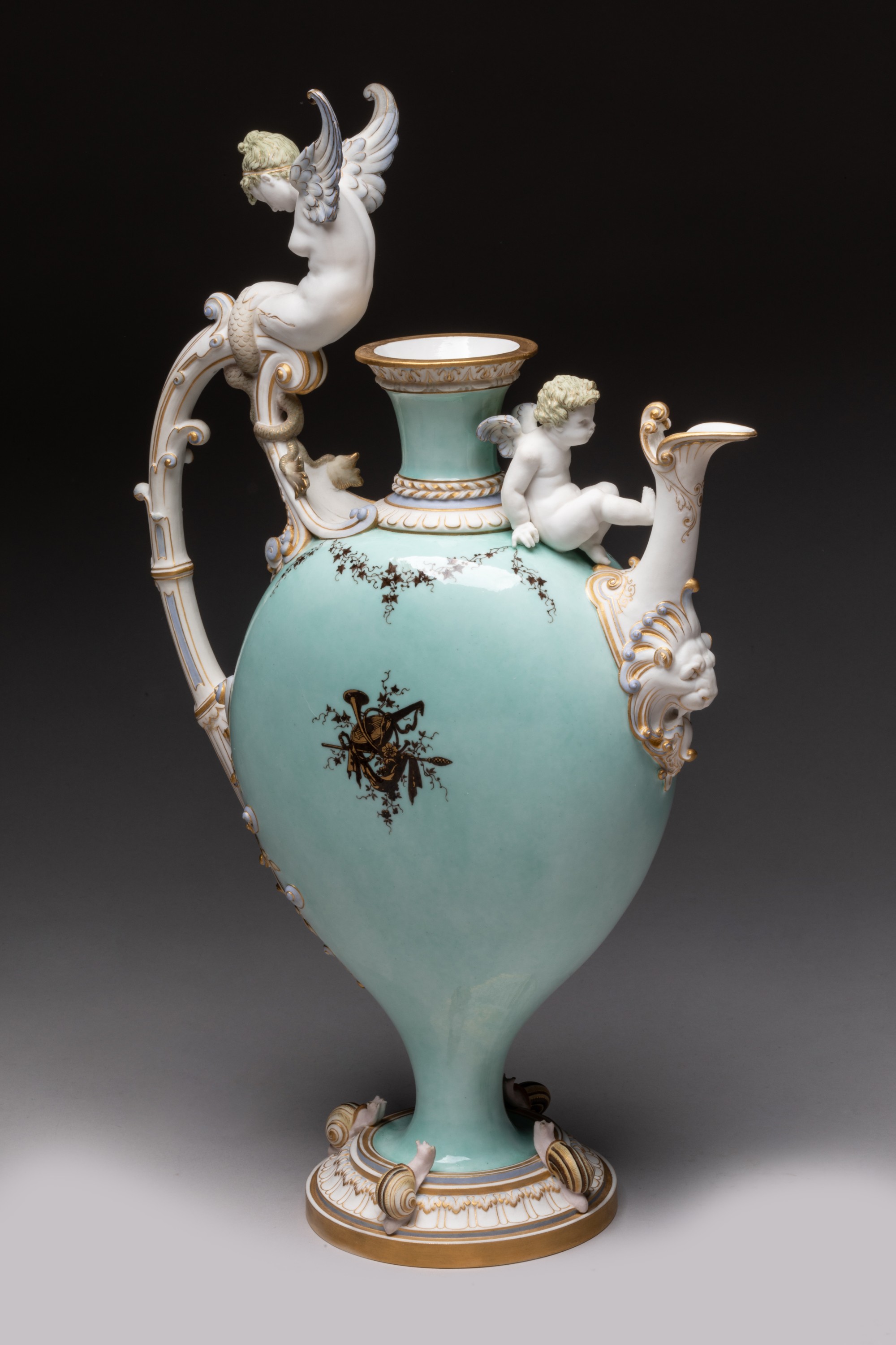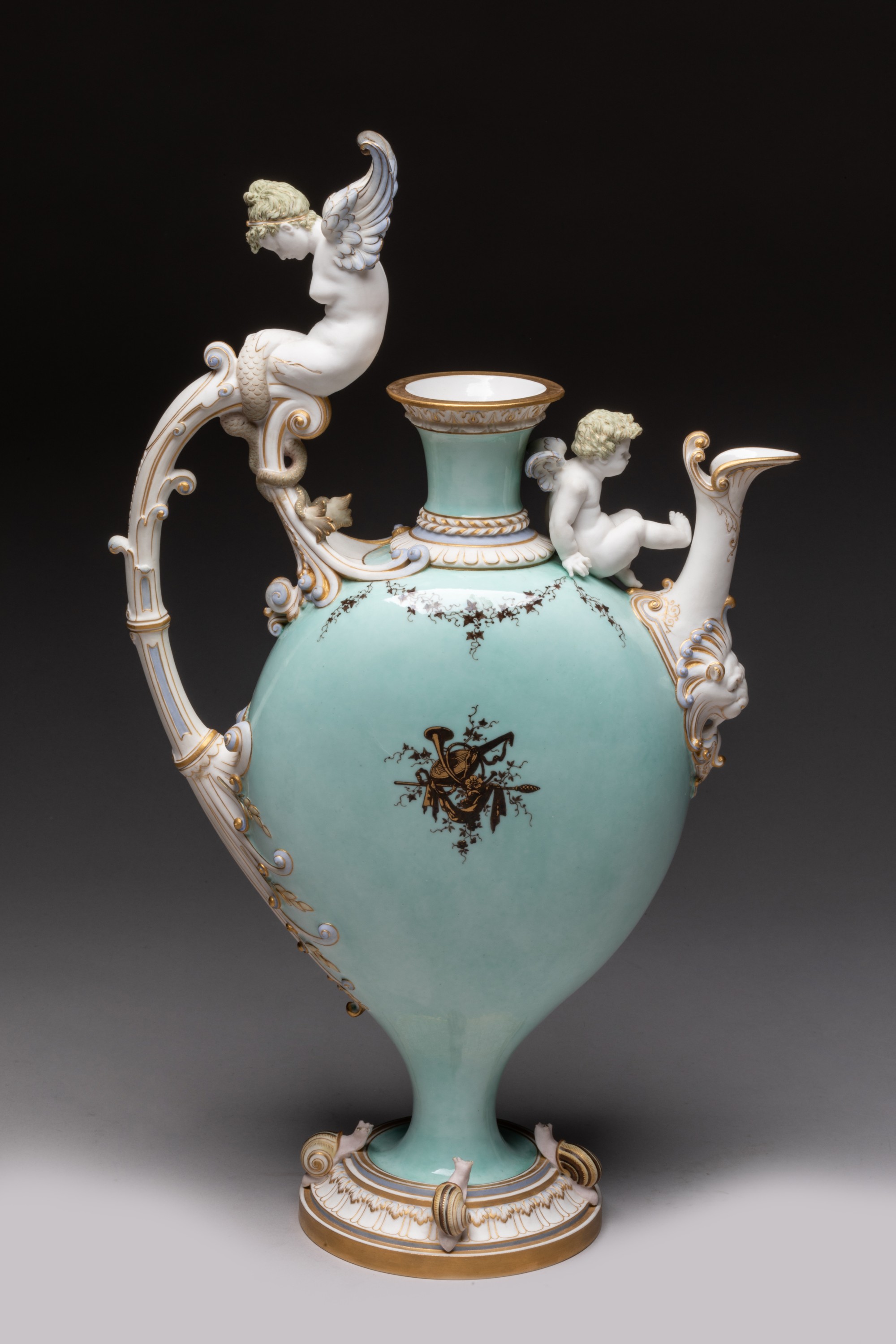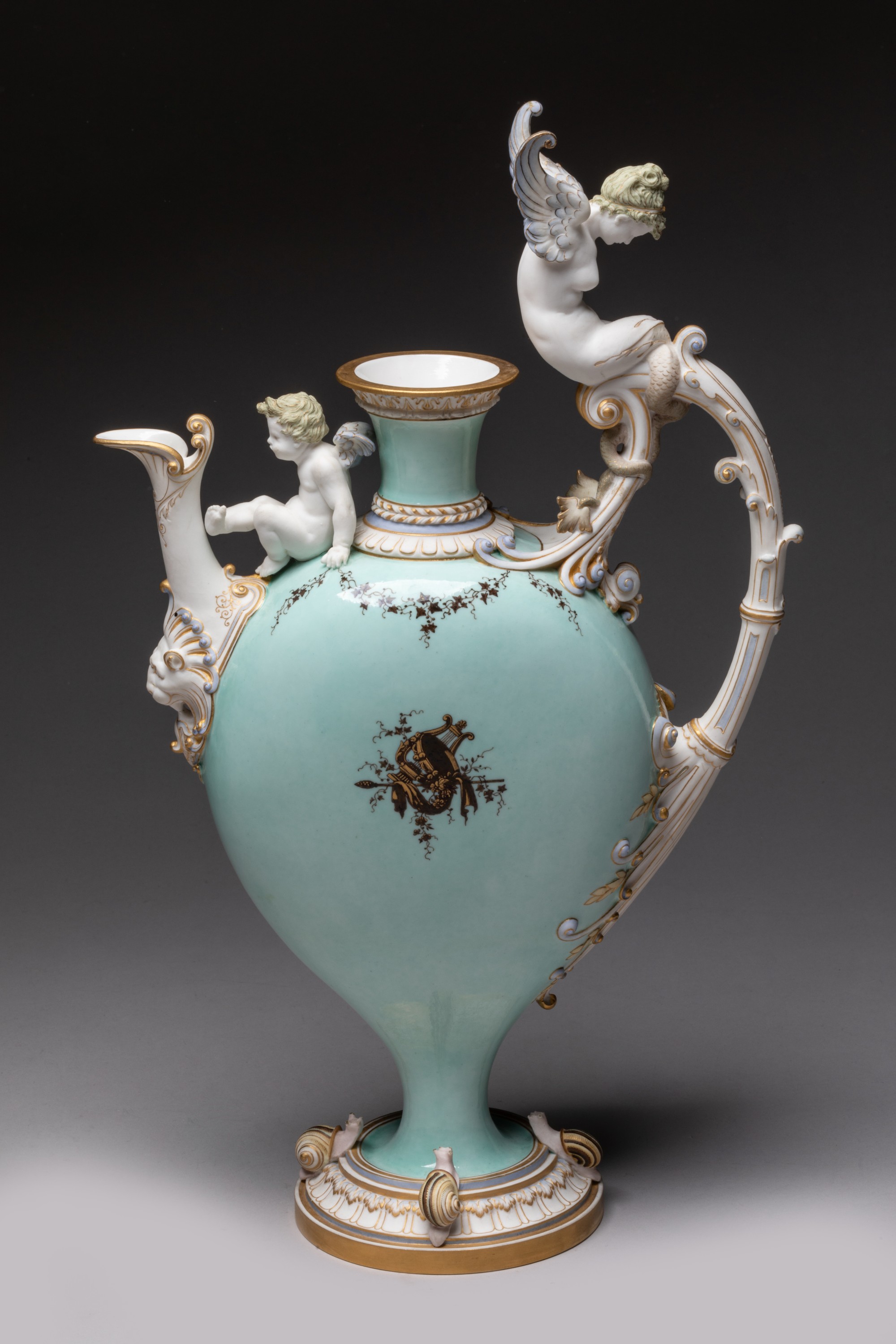Aiguière en porcelaine nouvelle de forme balustre à panse aplatie sur piédouche nommée buire de Blois, l'anse surmontée d'une sirène ailée et terminée par des feuilles d'acanthe en relief, le déversoir orné dun mufle de lion, un amour assis sur l'épaulement entre le déversoir et le col, quatre escargots sur le piédouche, décor en brun et or sur fond vert pâle de trophées de musique et draperies sur des deux faces de la panse et de guirlandes de lierre sur lépaulement, l'anse, le déversoir, la sirène et l'amour en biscuit rehaussés dor mat.