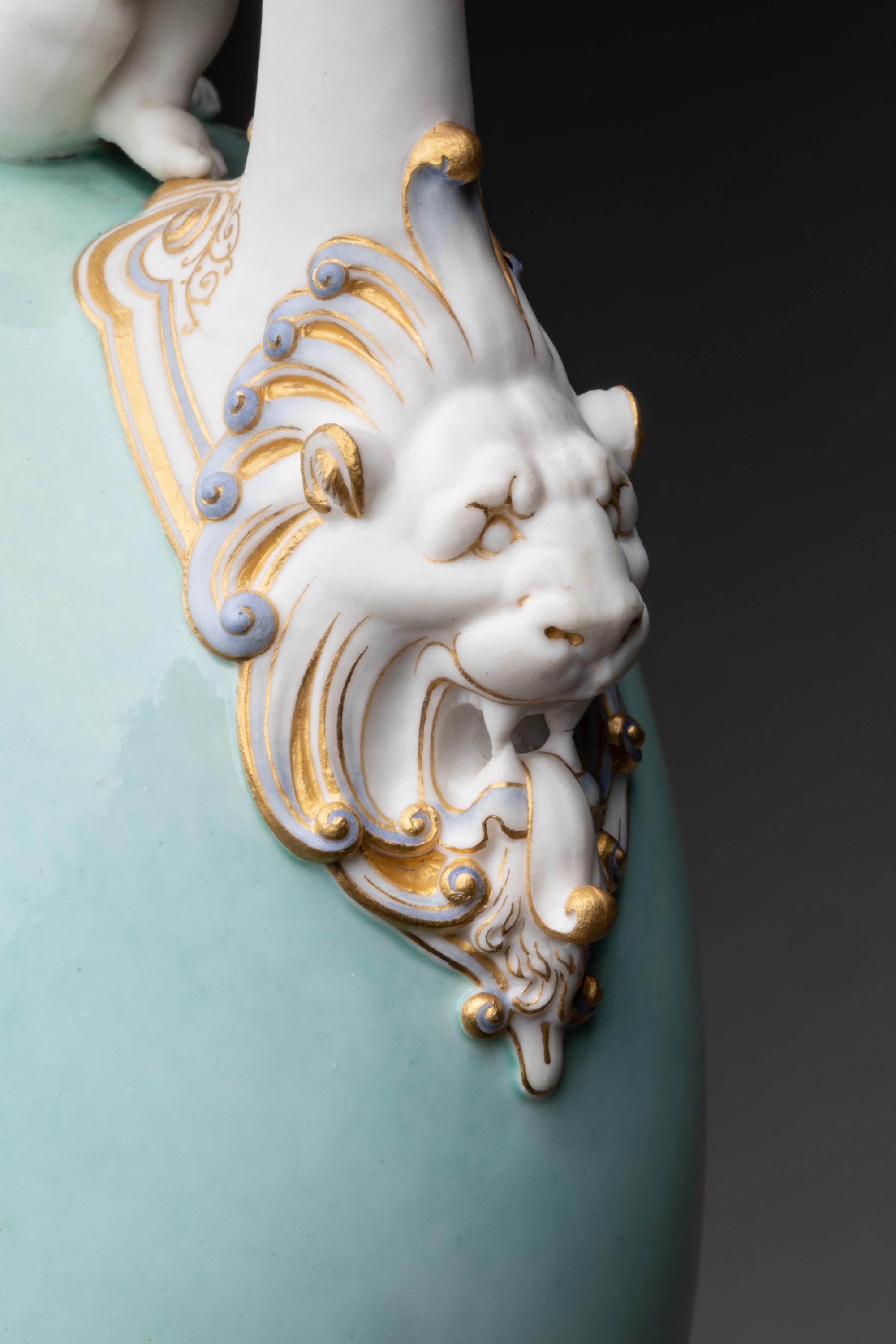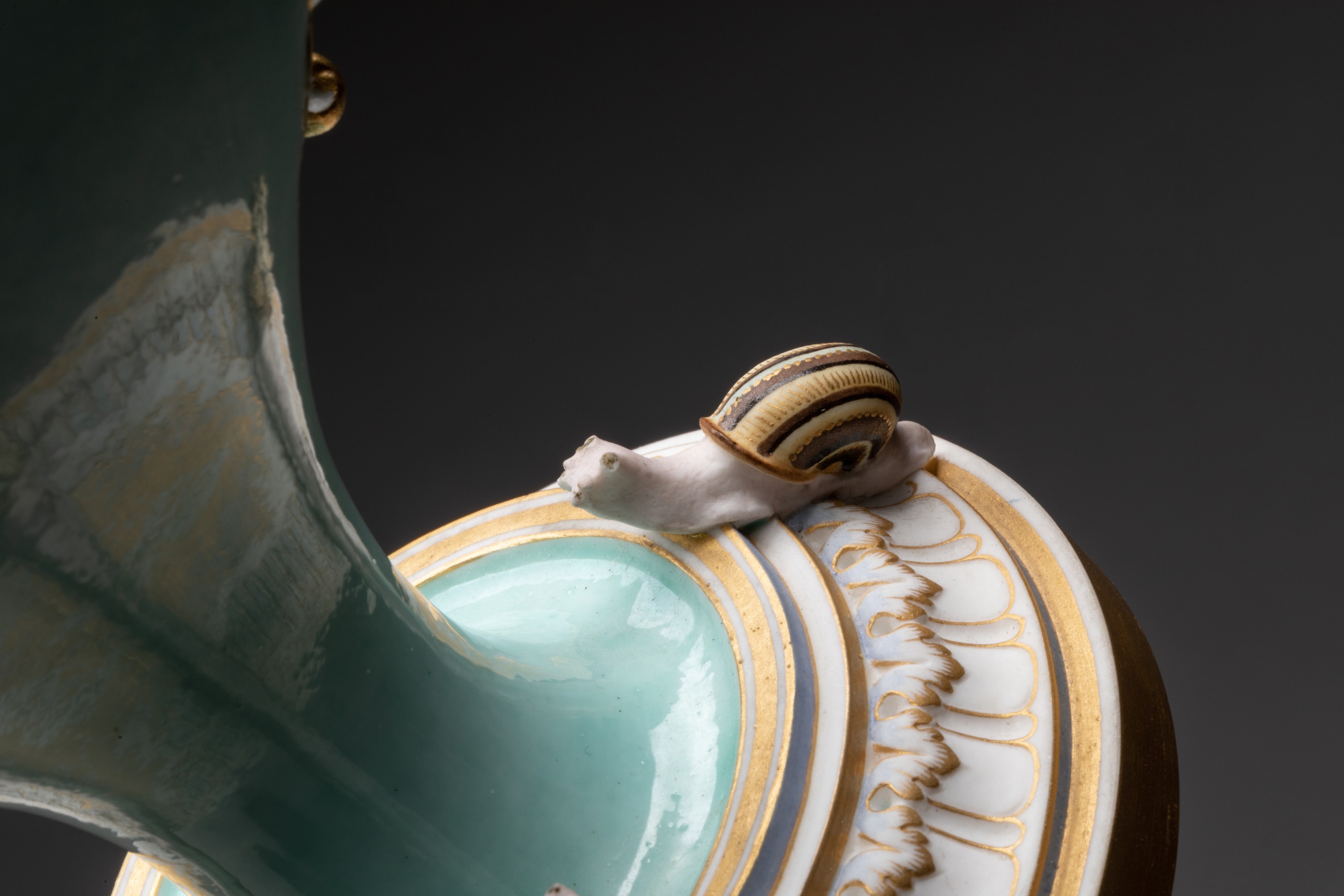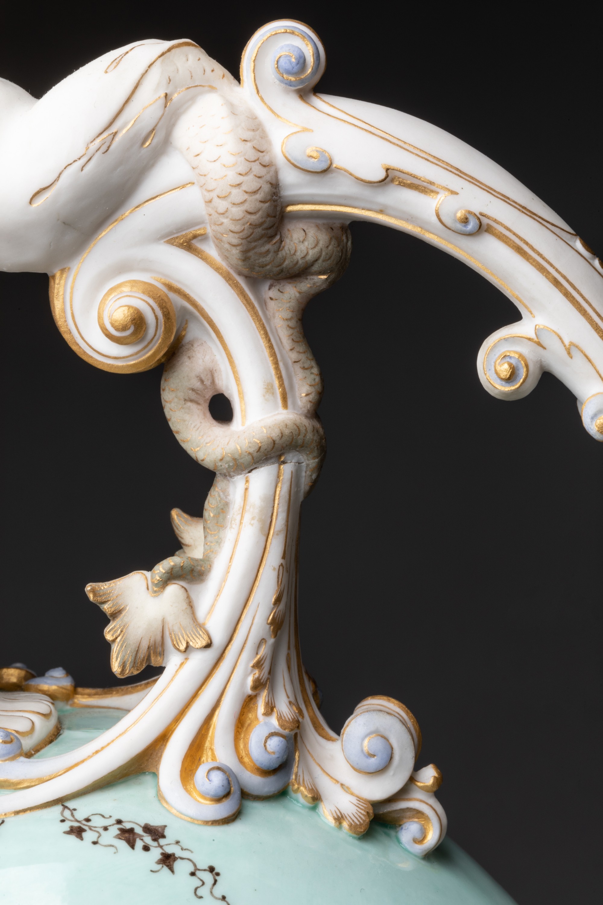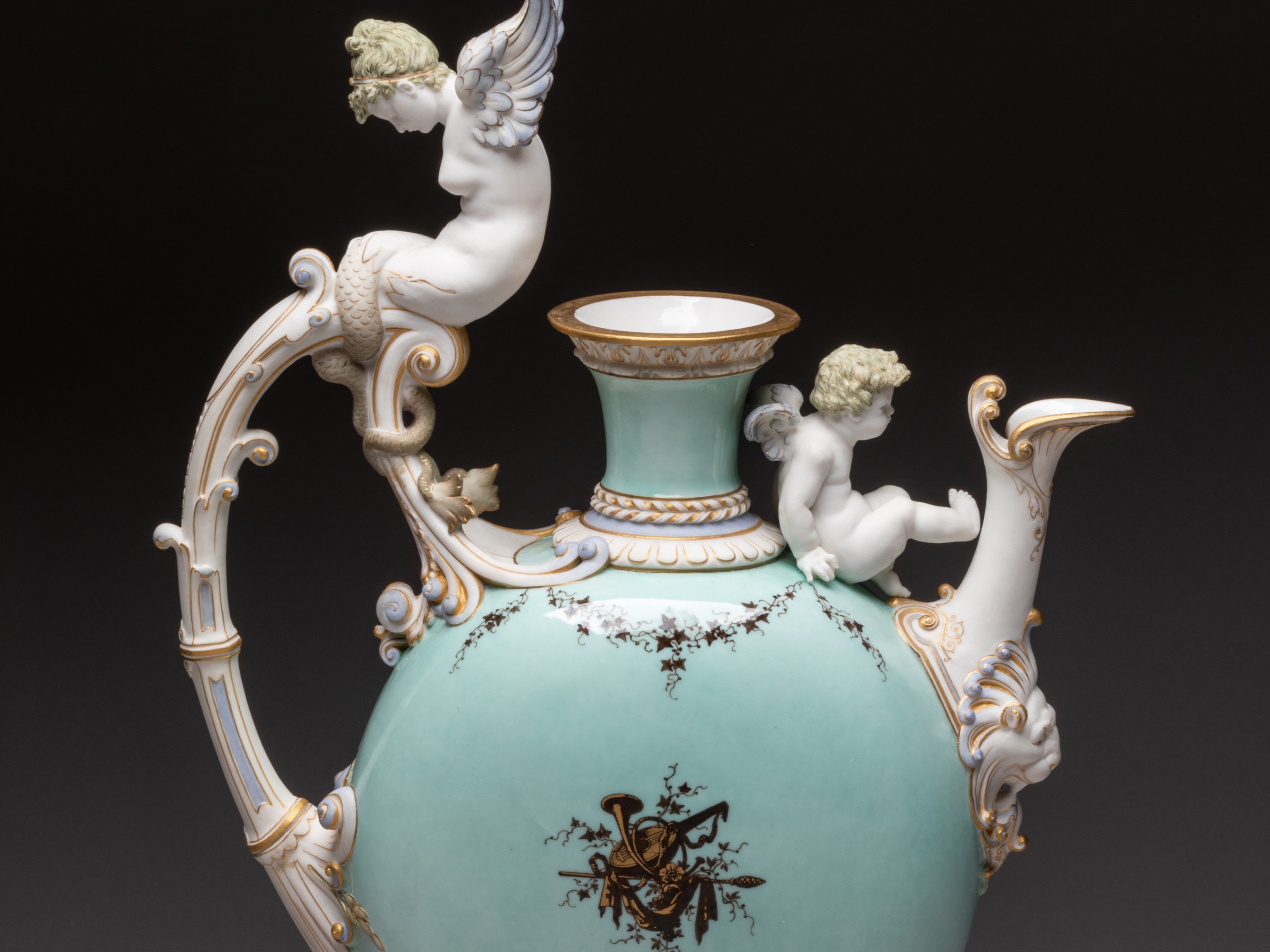 Aiguière en porcelaine nouvelle de forme balustre à panse aplatie sur piédouche nommée buire de Blois, l'anse surmontée d'une sirène ailée et terminée par des feuilles d'acanthe en relief, le déversoir orné dun mufle de lion, un amour assis sur l'épaulement entre le déversoir et le col, quatre escargots sur le piédouche, décor en brun et or sur fond vert pâle de trophées de musique et draperies sur des deux faces de la panse et de guirlandes de lierre sur lépaulement, l'anse, le déversoir, la sirène et l'amour en biscuit rehaussés dor mat.