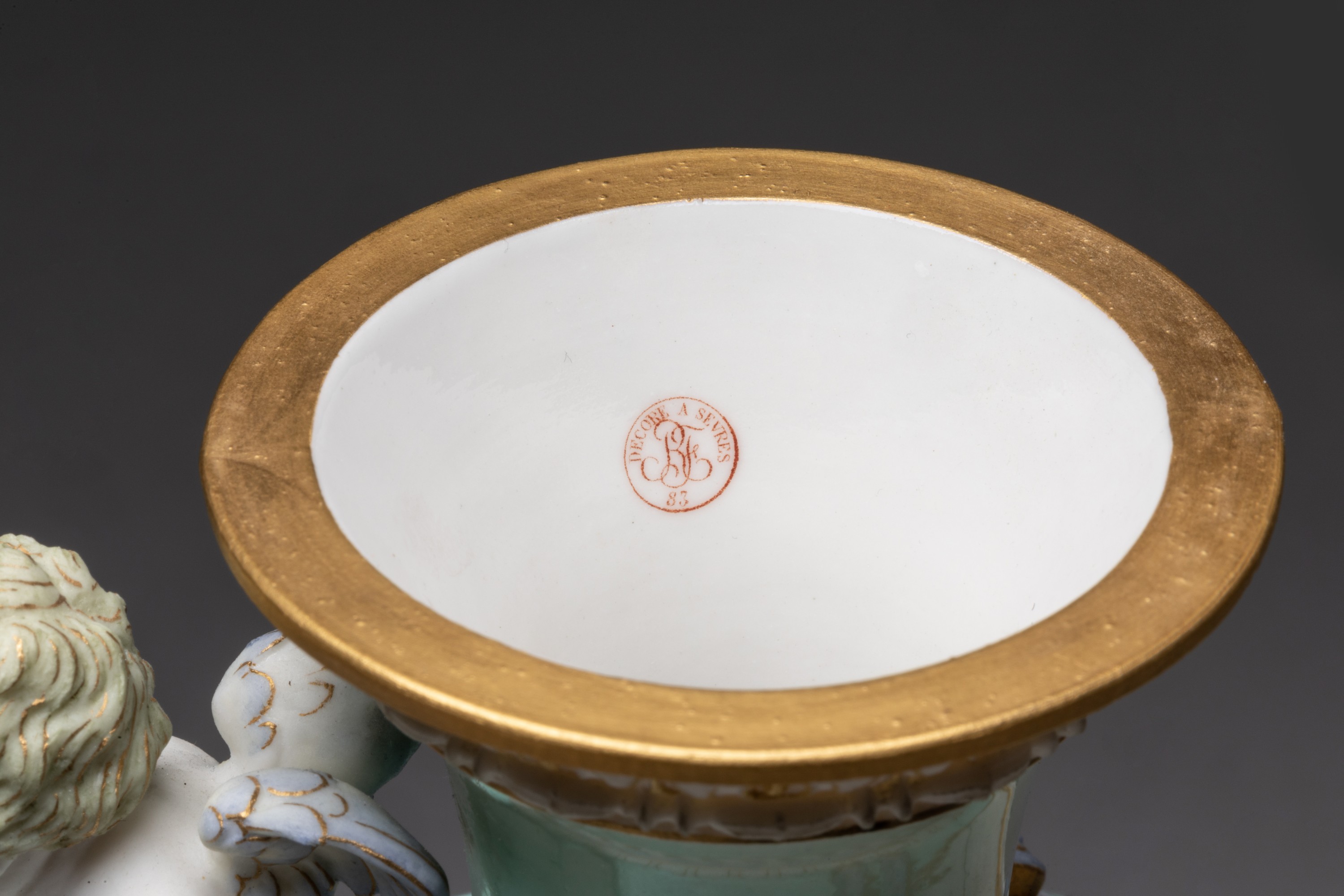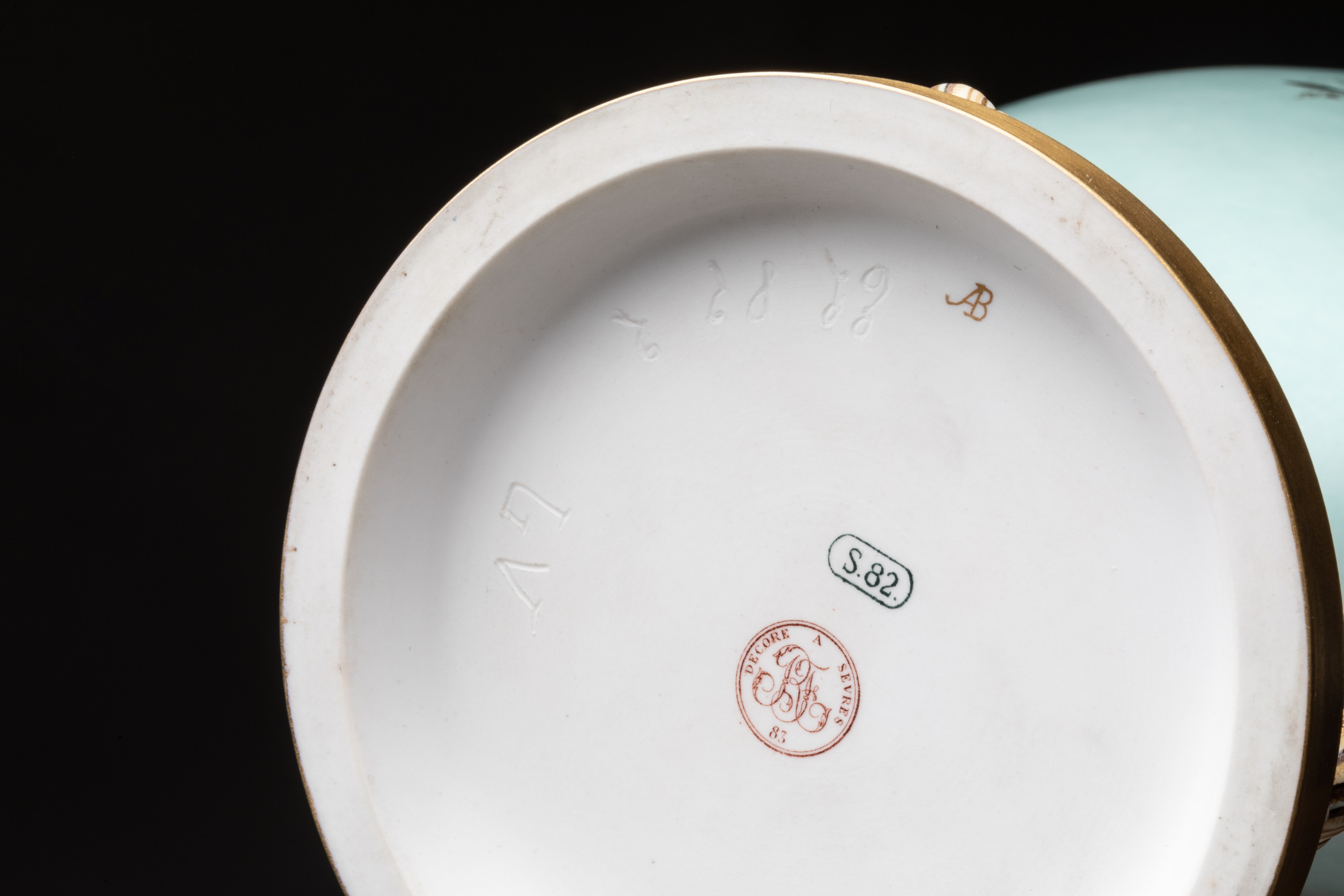 Marques: S. 82 en vert, cachet en rouge RF décoré à Sèvres 1883, marque en or AB pour Achille Bonnuit, marque en creux E L 82 2 LV pour Gervais Legré (tourneur) et pâte Lauth-Vogt (nouvelle porcelaine)