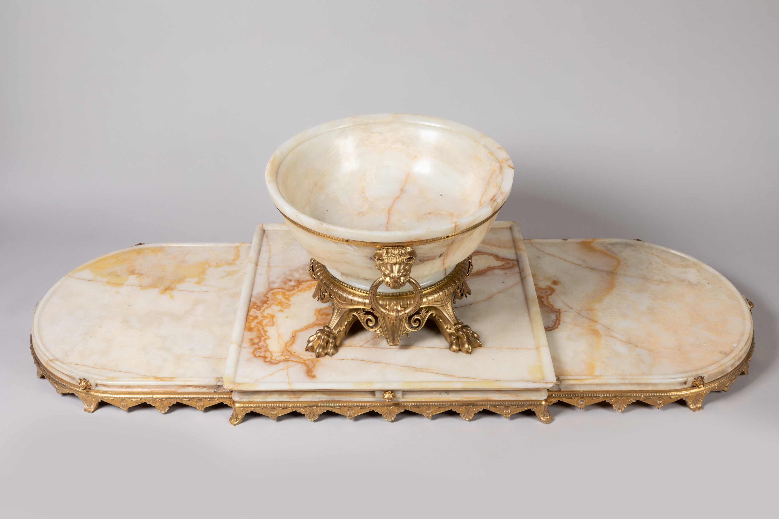 en marbre onyx d'Algérie et bronze doré comprenant une coupe posée sur un surtout en trois parties.