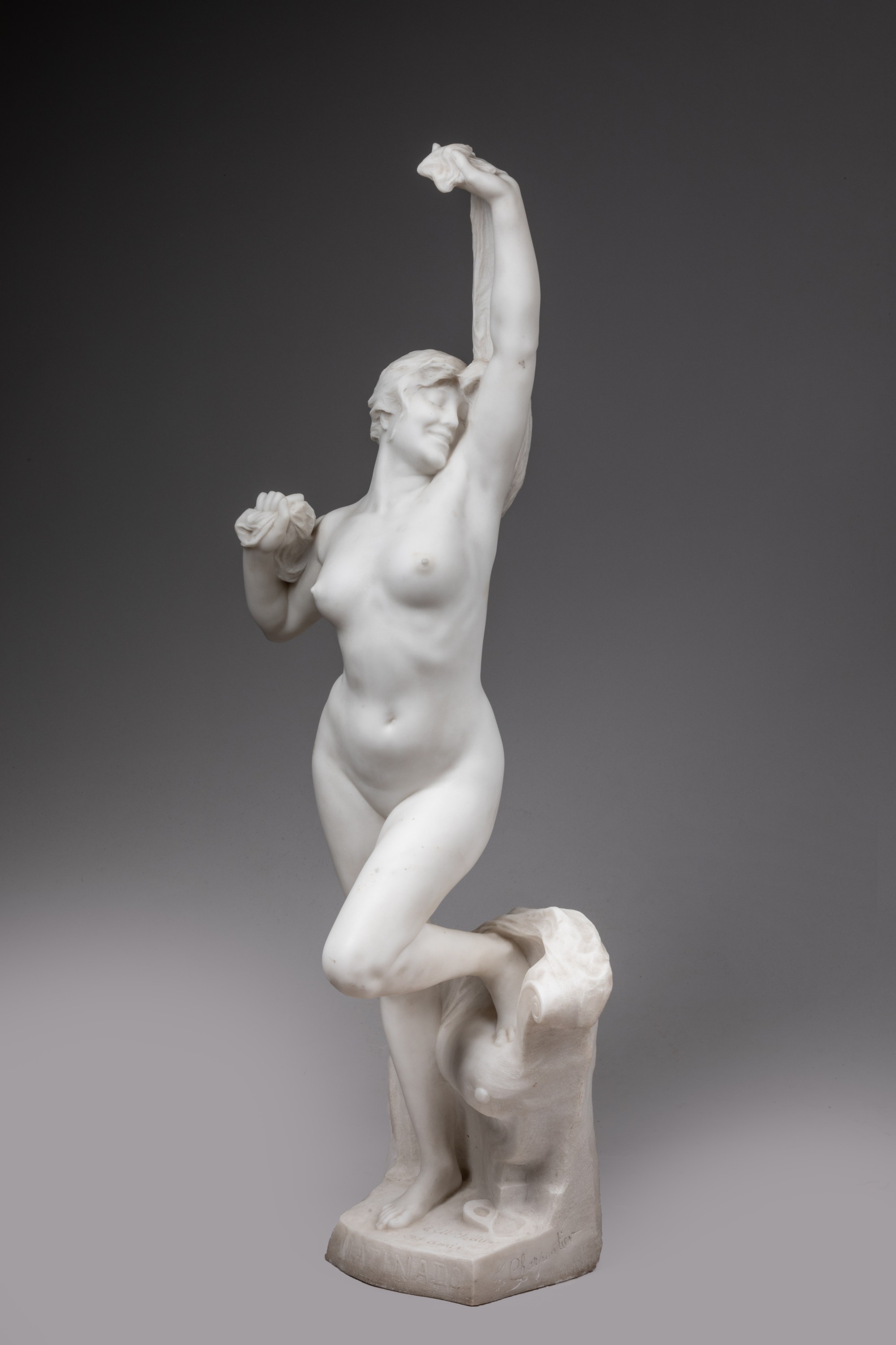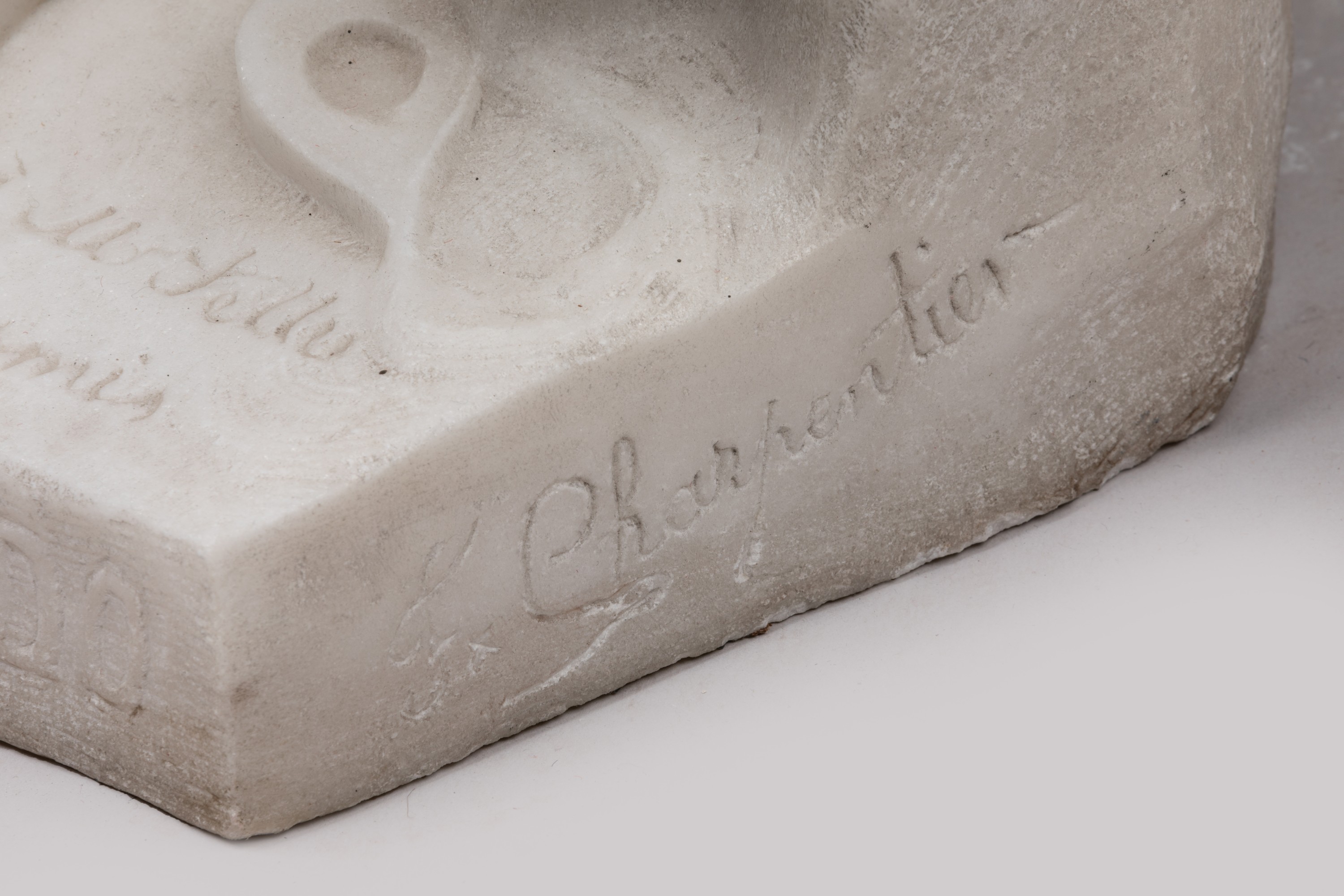 A marble statue by Charpentier entitled "Bello matinado", signed and dedicated to Mr Fettu (20th century French politician) by his friends.