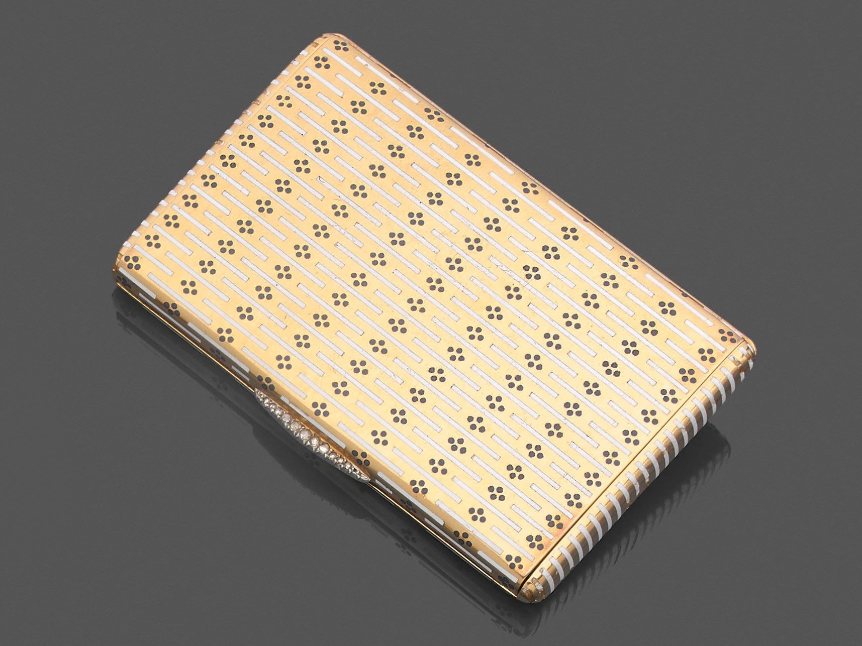 de forme rectangulaire en or jaune 750 millièmes entièrement émaillé de filets d'émail blanc et pastilles d'émail bleu, renfermant deux compartiments dont un avec un tube de rouge à lèvre, le couvercle formant miroir, le fermoir serti de diamants taillés en rose.