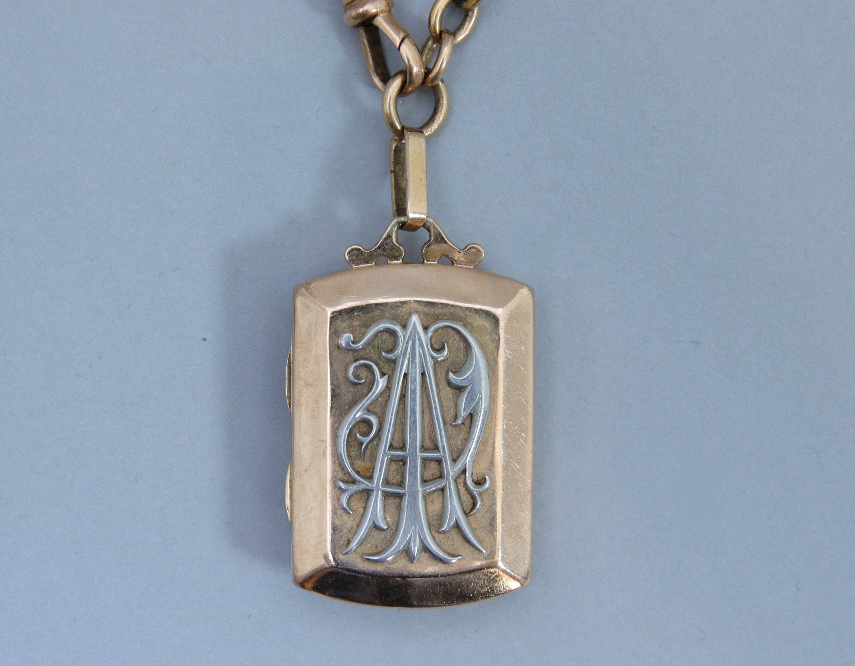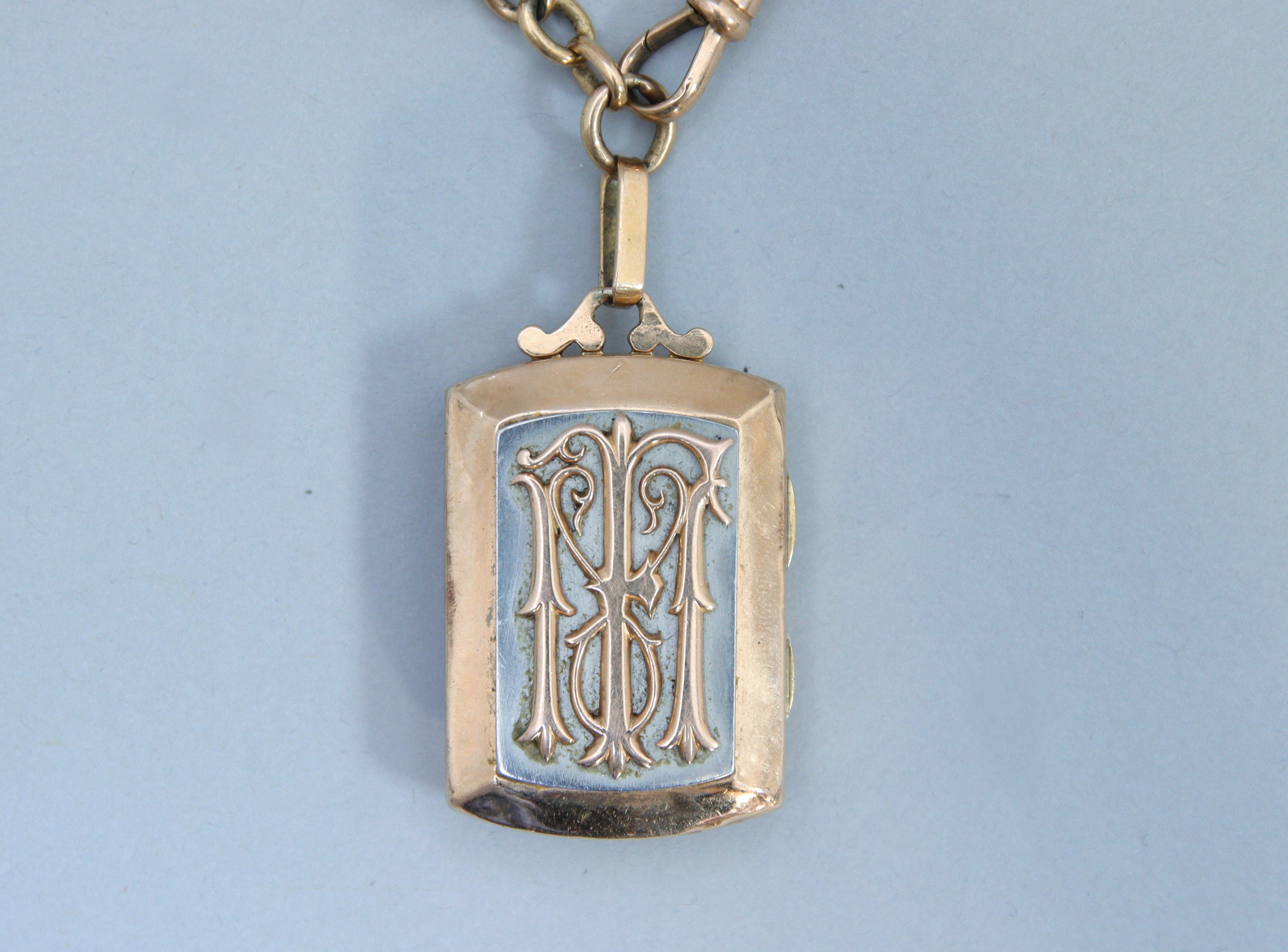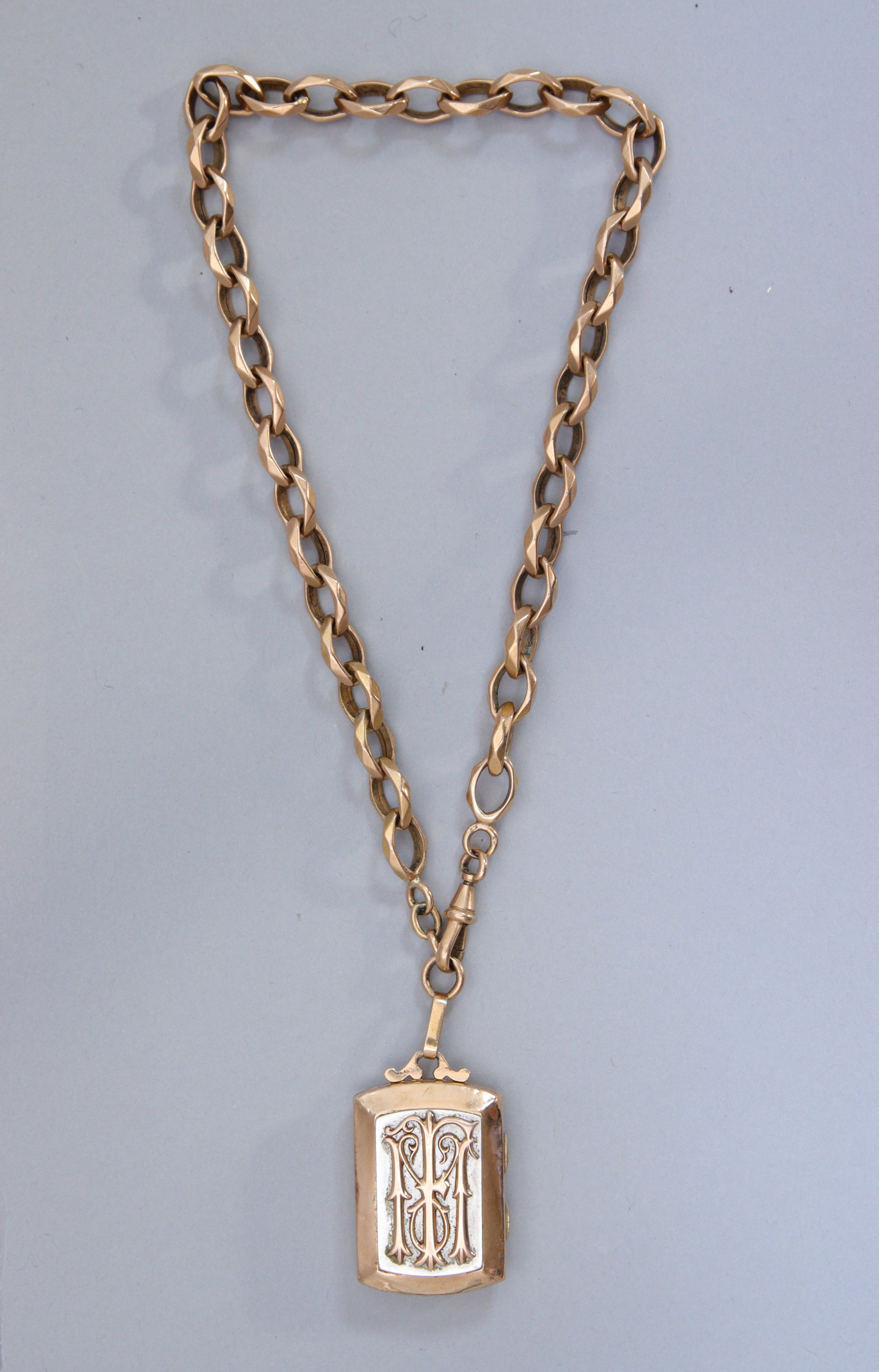 en or 750 millièmes, les maillons ajourés retenant en pendentif un médaillon ouvrant également en or jaune 750 millièmes, les deux faces appliquées d'un monogramme.