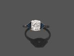 en platine 850 millièmes ornée au centre d'un diamant coussin de taille ancienne serti clos entre deux saphirs triangulaires.