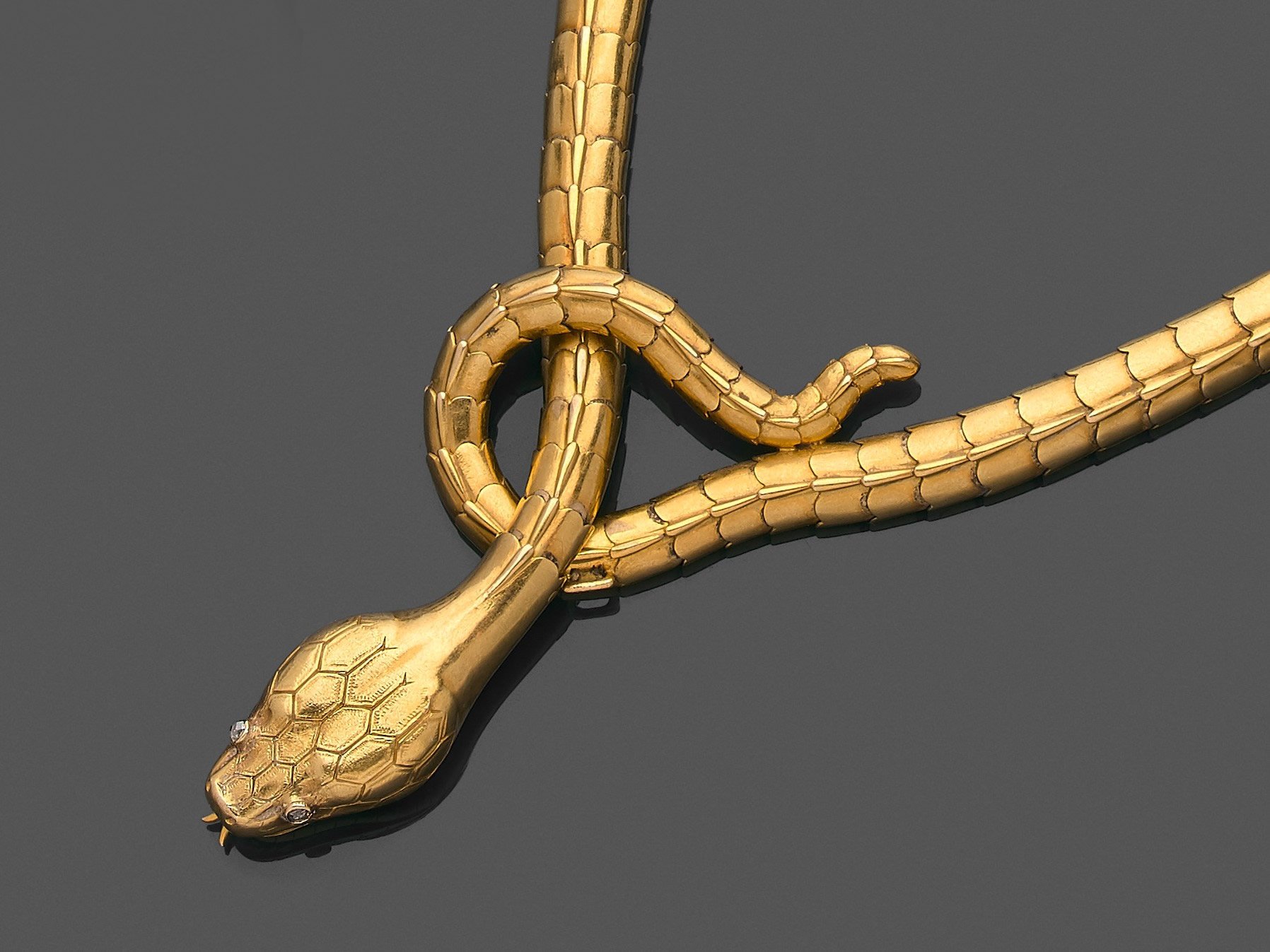 en or jaune 750 millièmes gravé figurant un serpent, la tête formant fermoir, les yeux ornés de diamants taillés en rose.