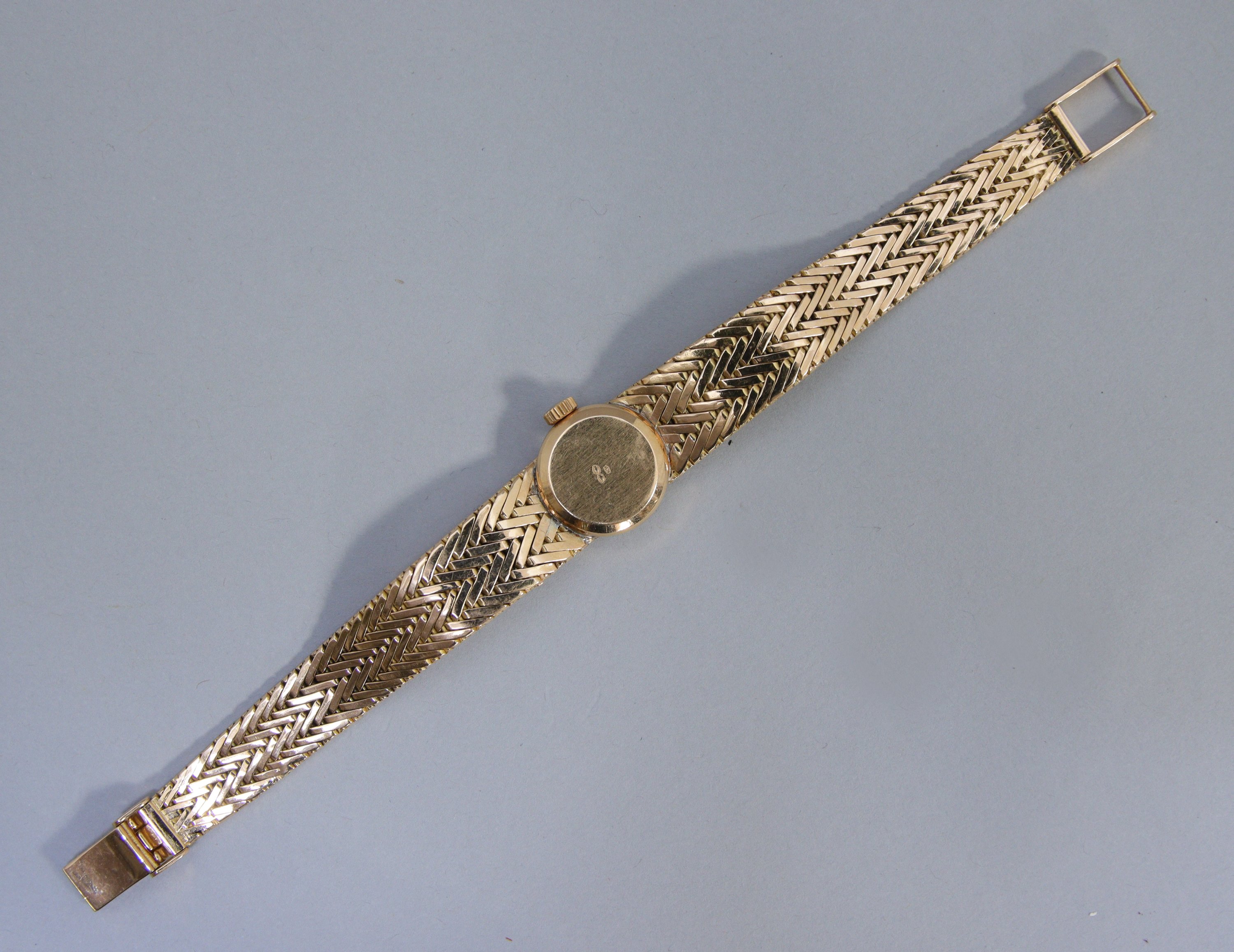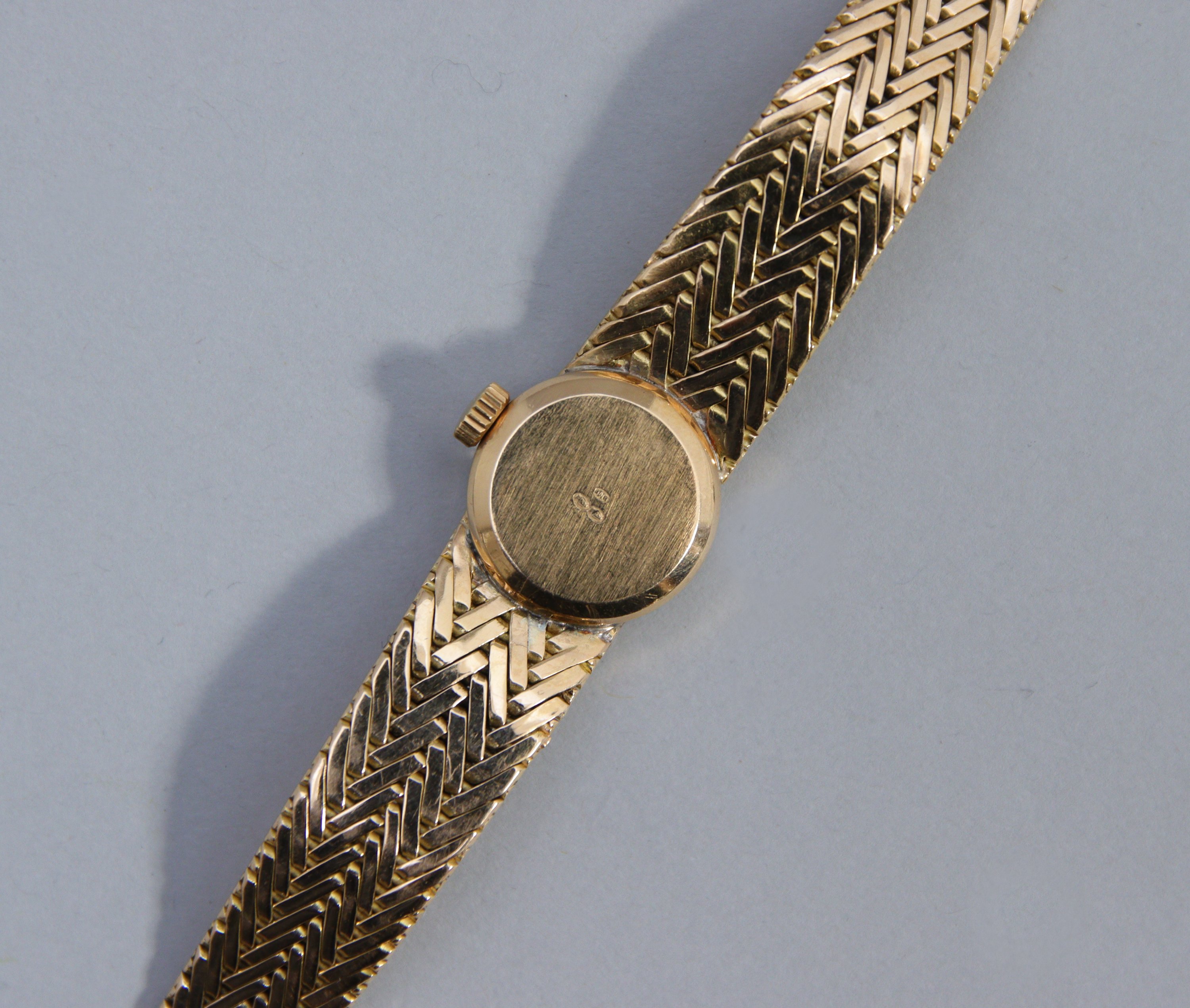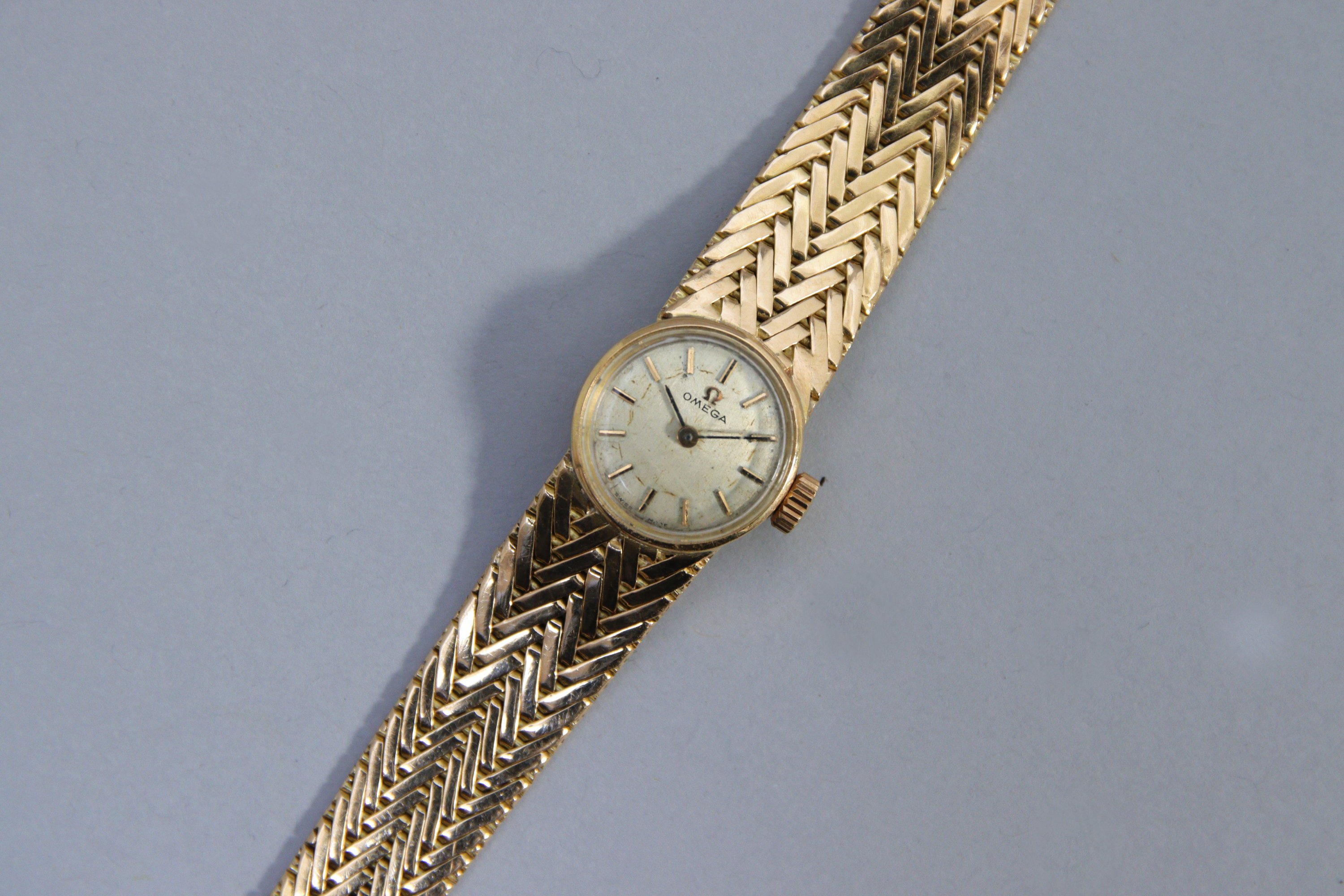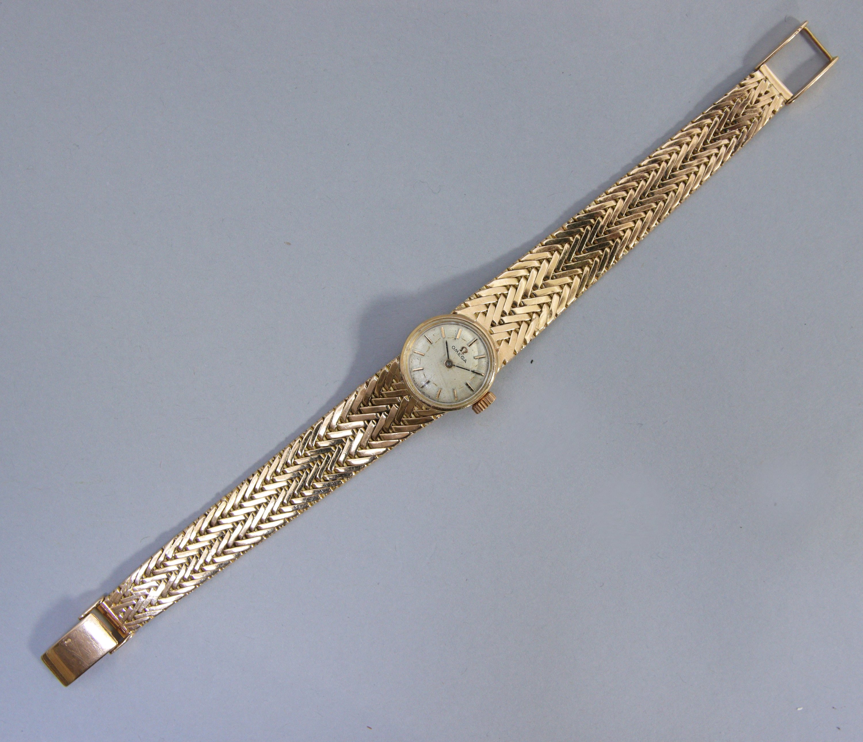 OMEGA. MONTRE-BRACELET DE DAME en or jaune 750 millièmes, la montre de forme ronde, cadran émaillé jaune, indexe pour les heures, bracelet souple tressé.
