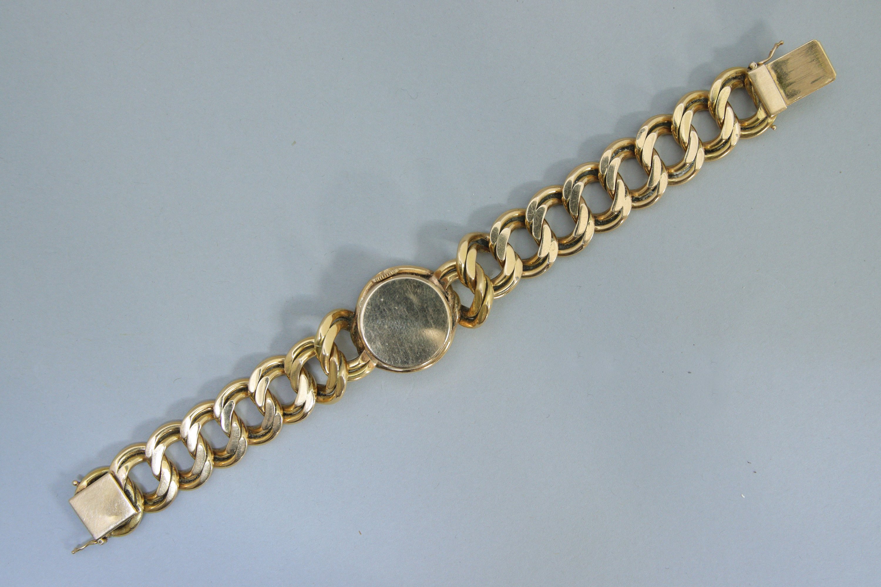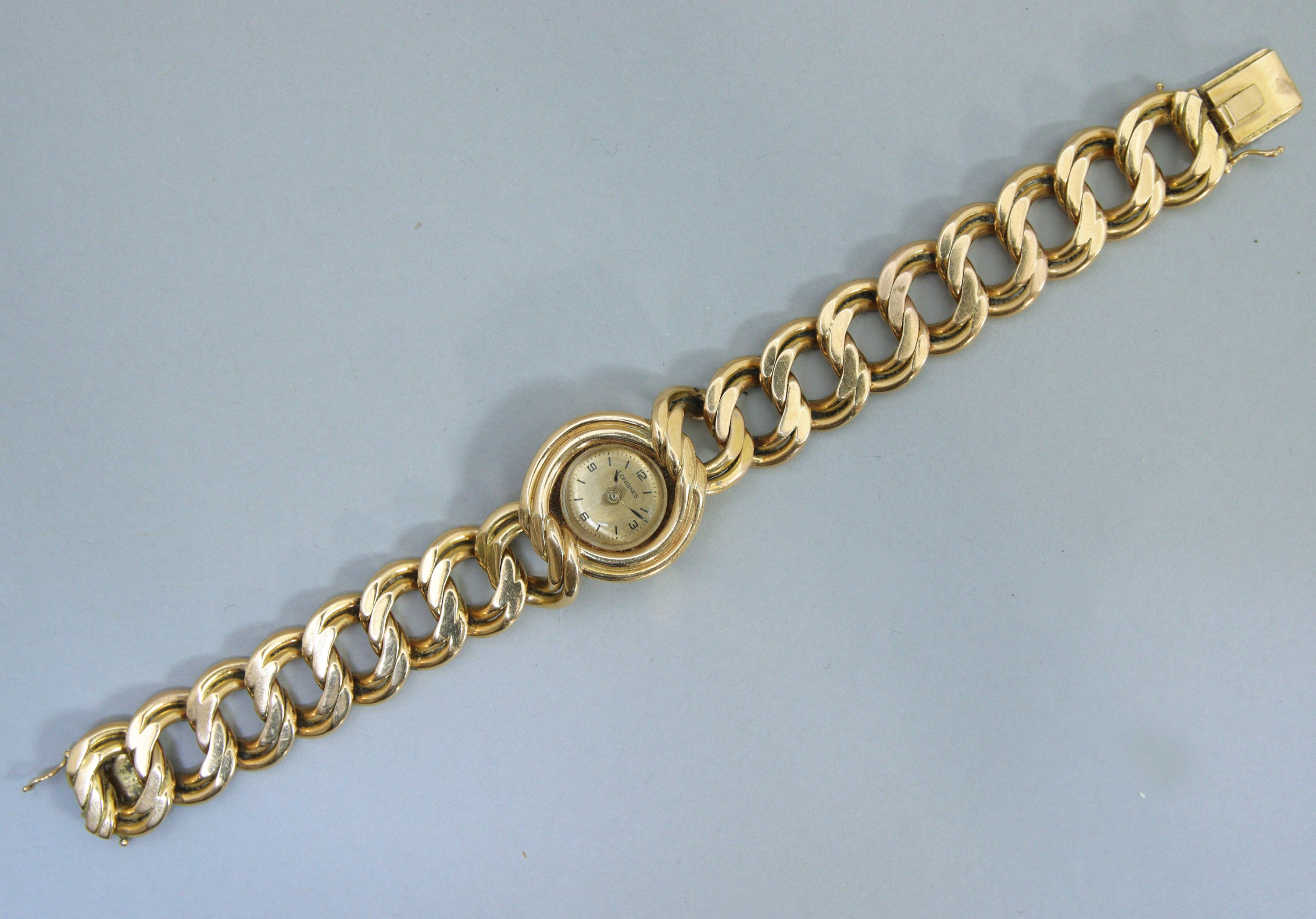 LONGINES. MONTRE-BRACELET DE DAME en or jaune 750 millièmes, la montre de forme ronde, cadran émaillé jaune, chiffres arabes pour les heures, bracelet articulé, les maillons double entrelacés.
