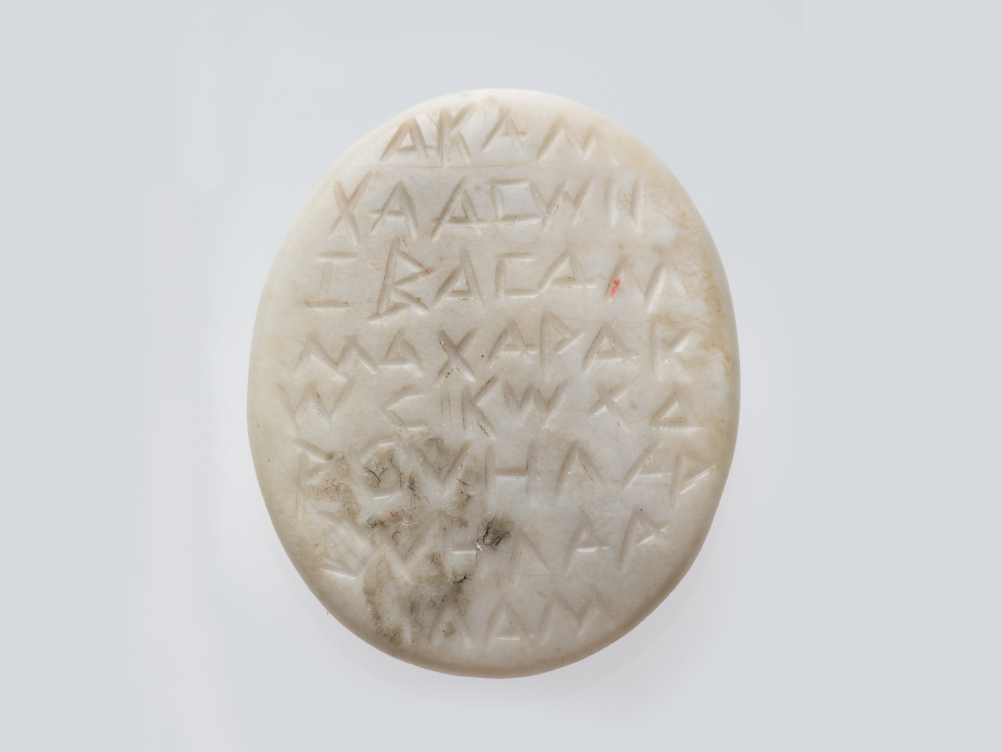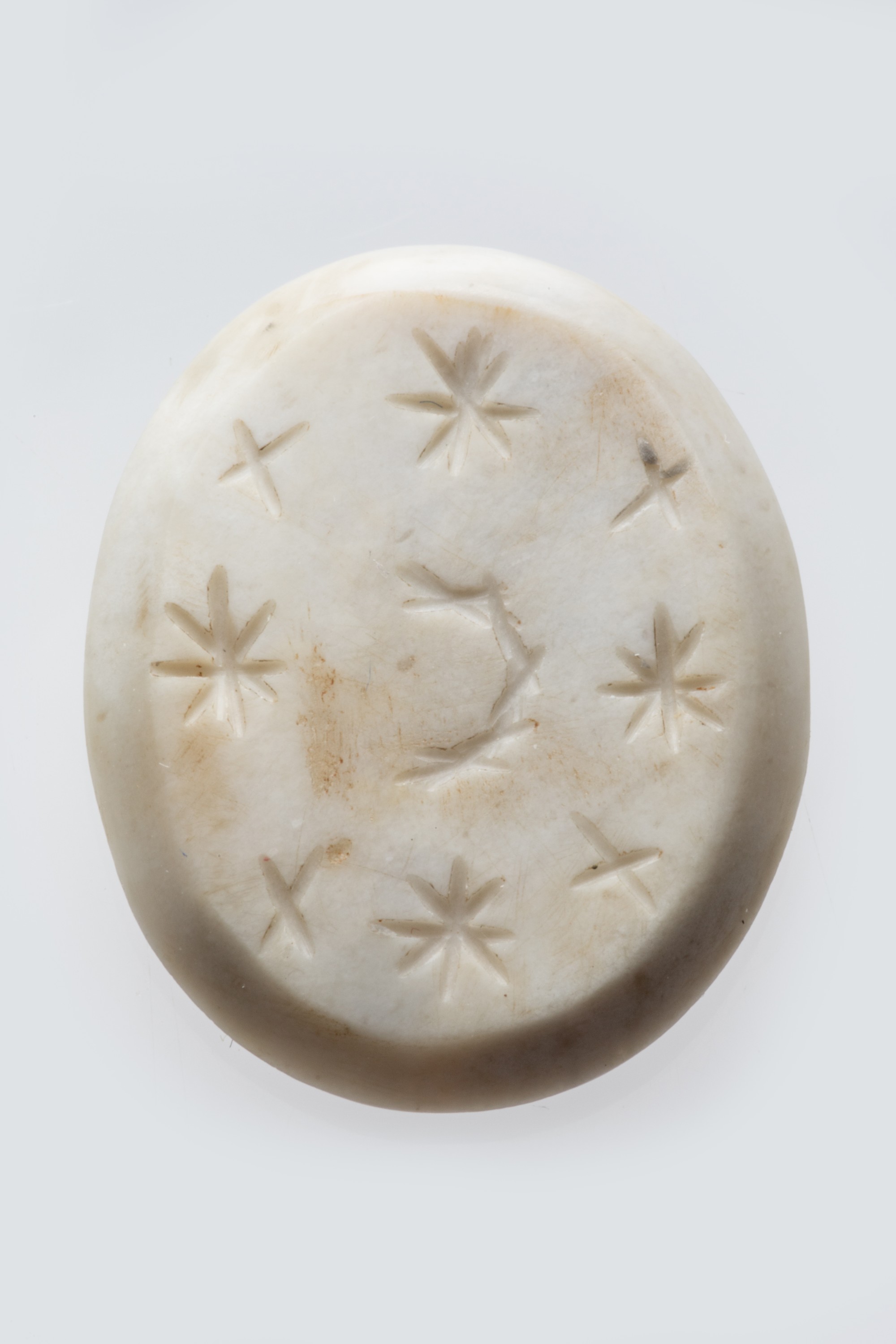 A Roman gnostic intaglio engraved with a C shape surrounded by crosses and stars. Magical inscriptions in Greek letters on the tailside. 1st-3rd century A.D.