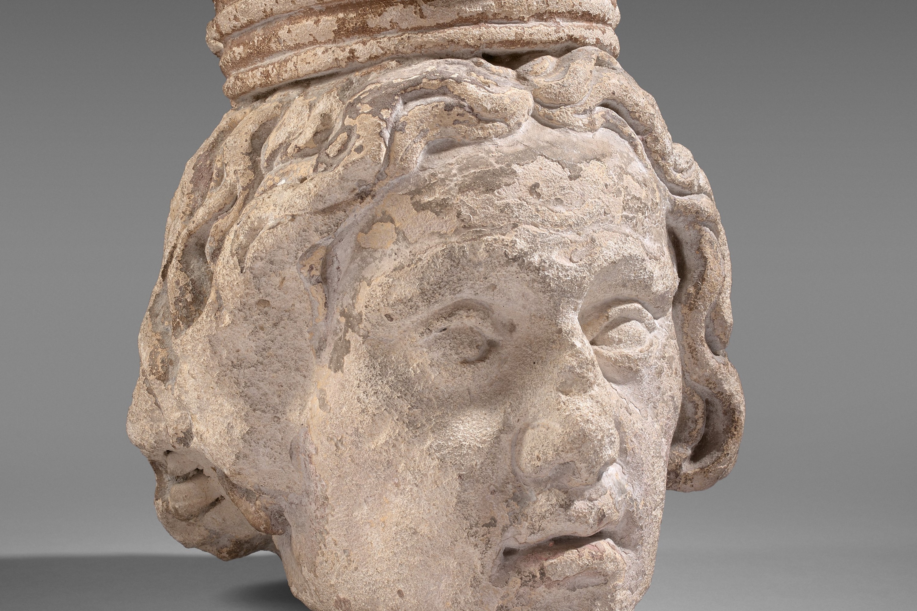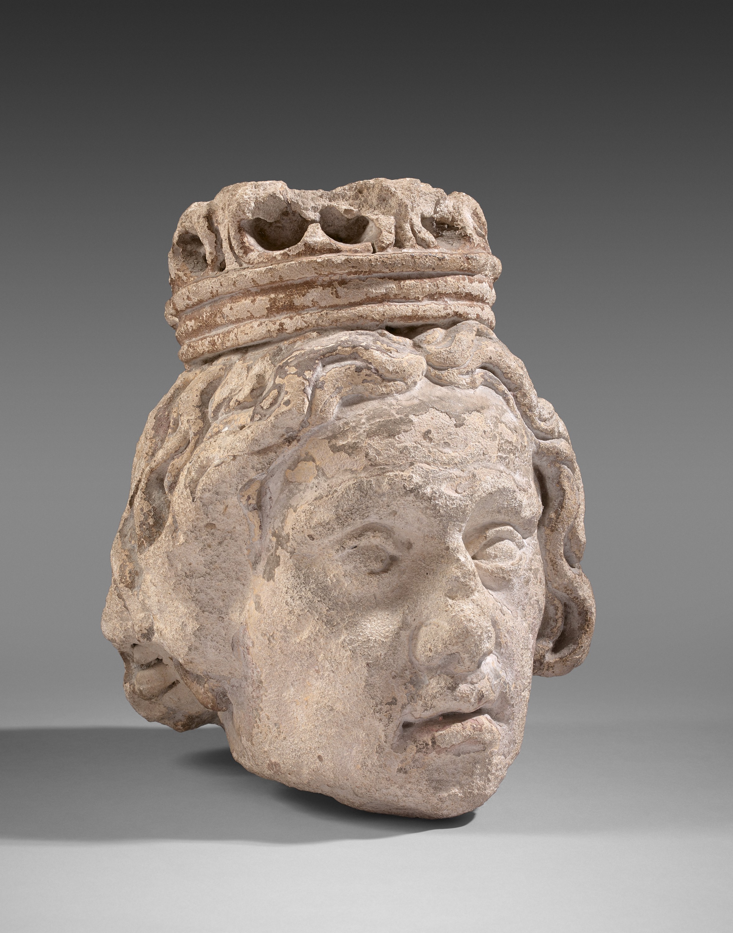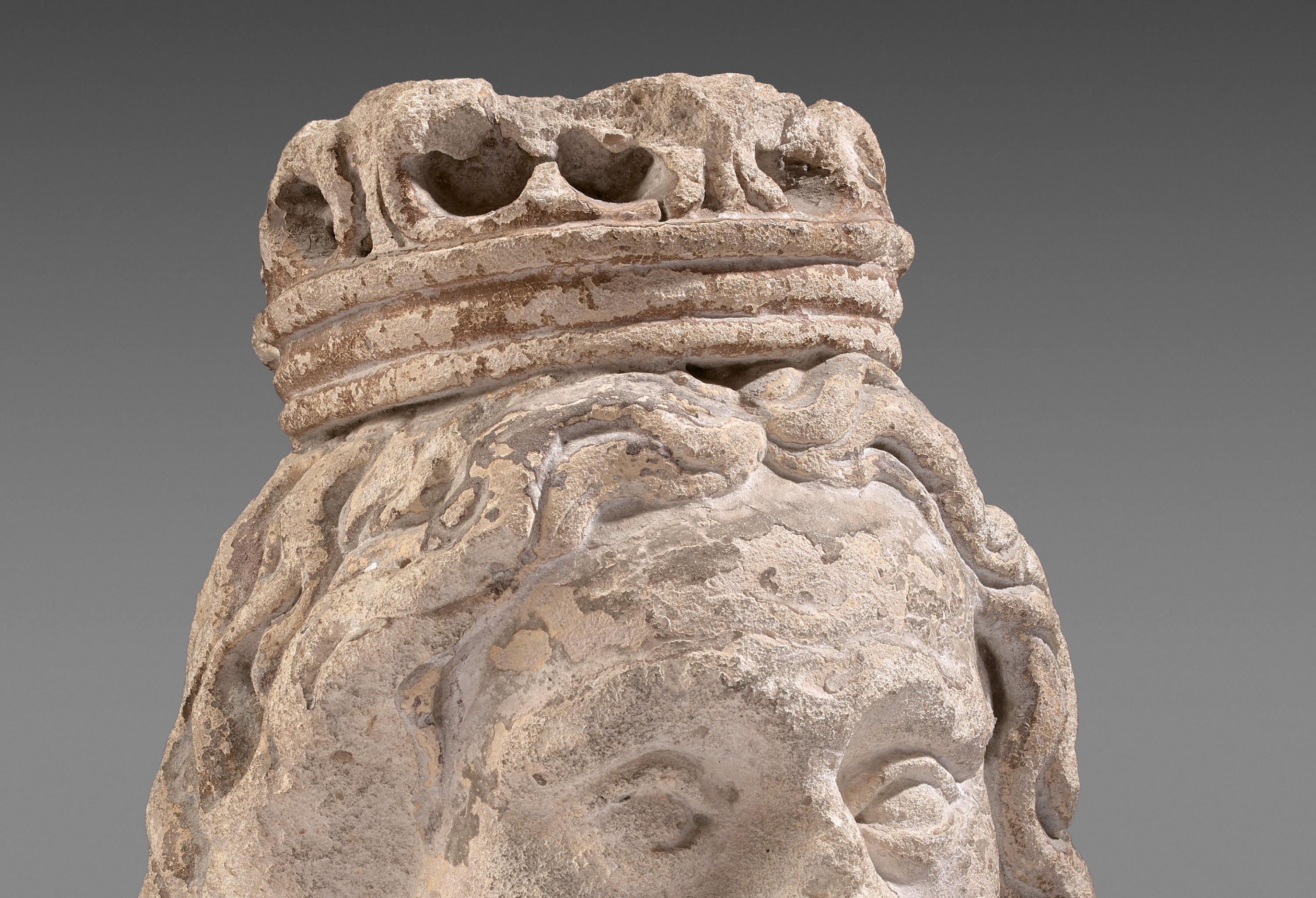 (Accidents, usures et manques à la couronne, ainsi qu'à la partie gauche de la chevelure).