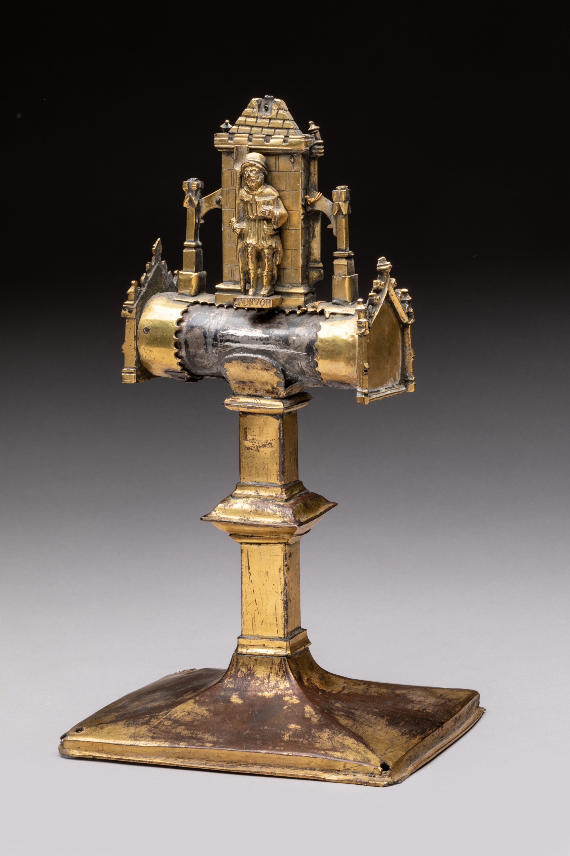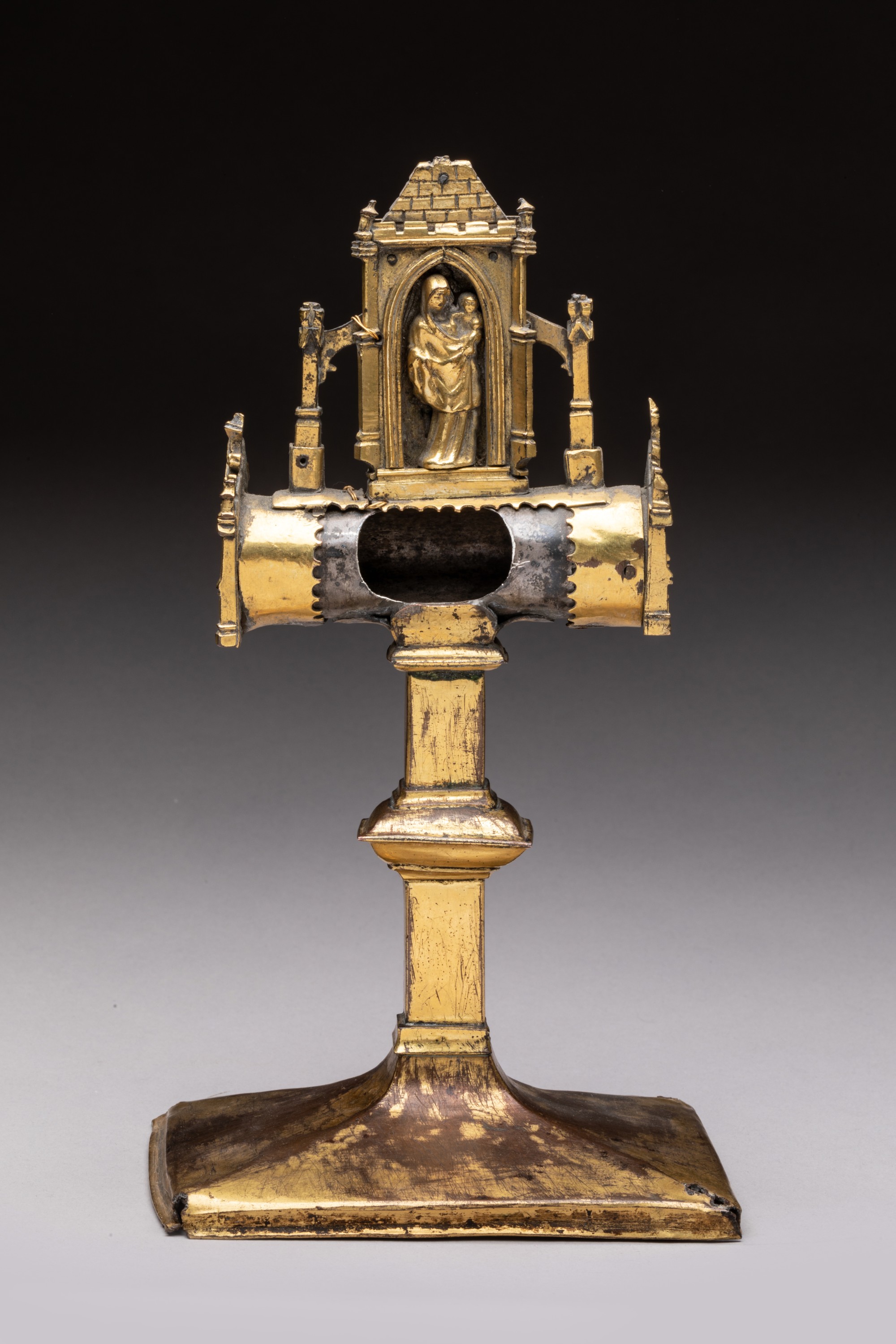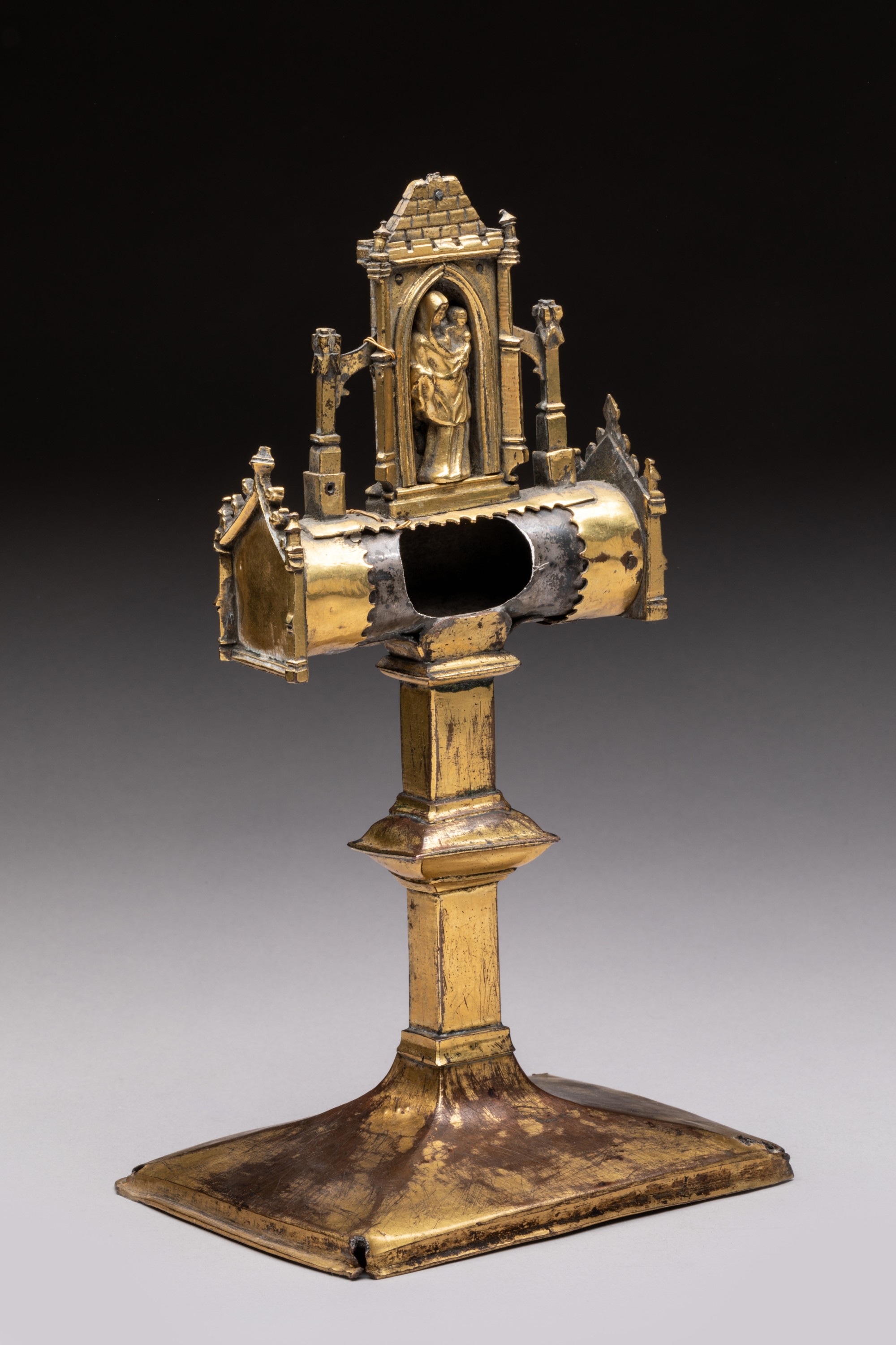 A gilded copper and silver? monstrance reliquary meant to house a relic of saint Druon of Sebourg. Northern France?, late 14th century.