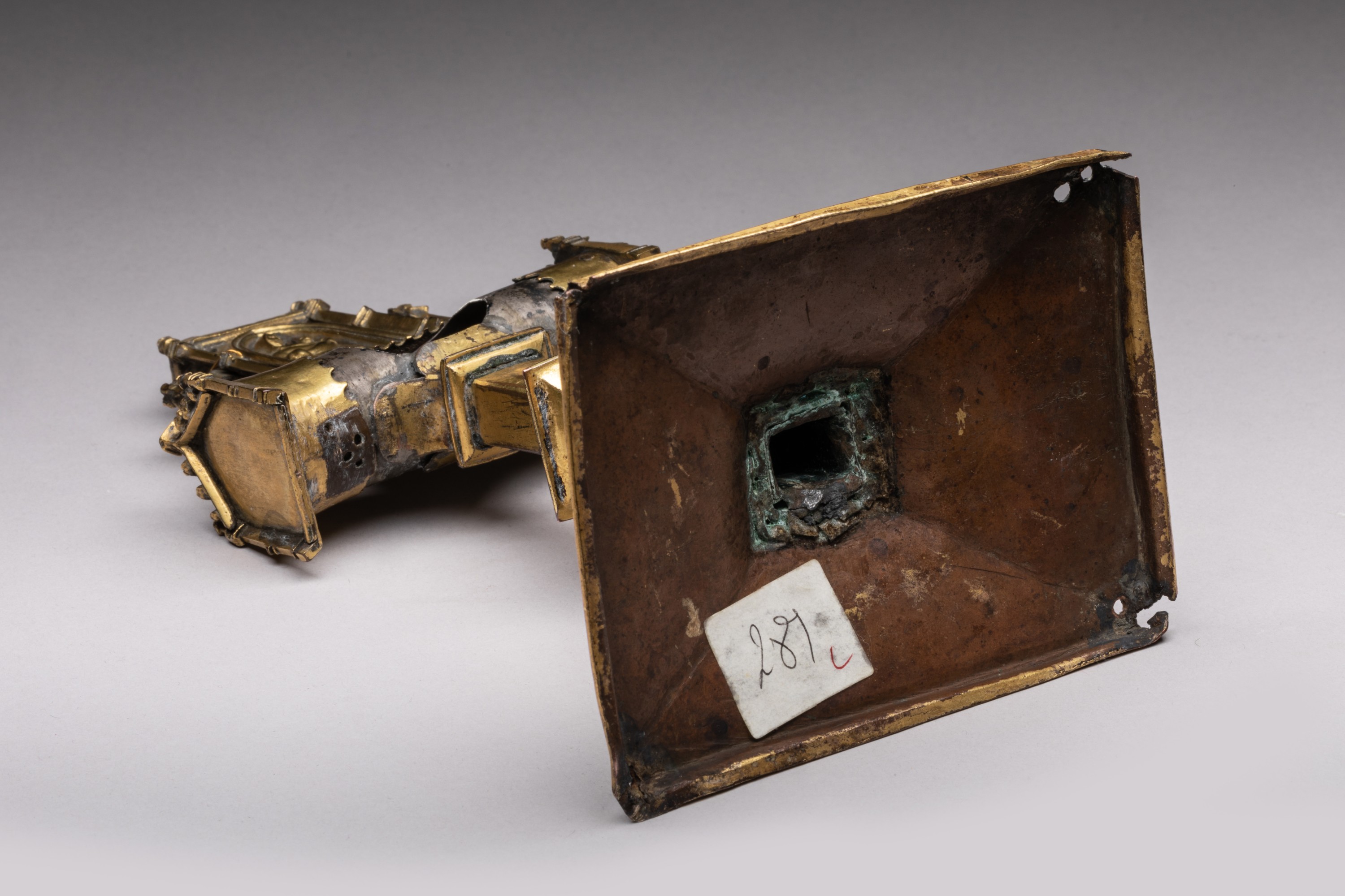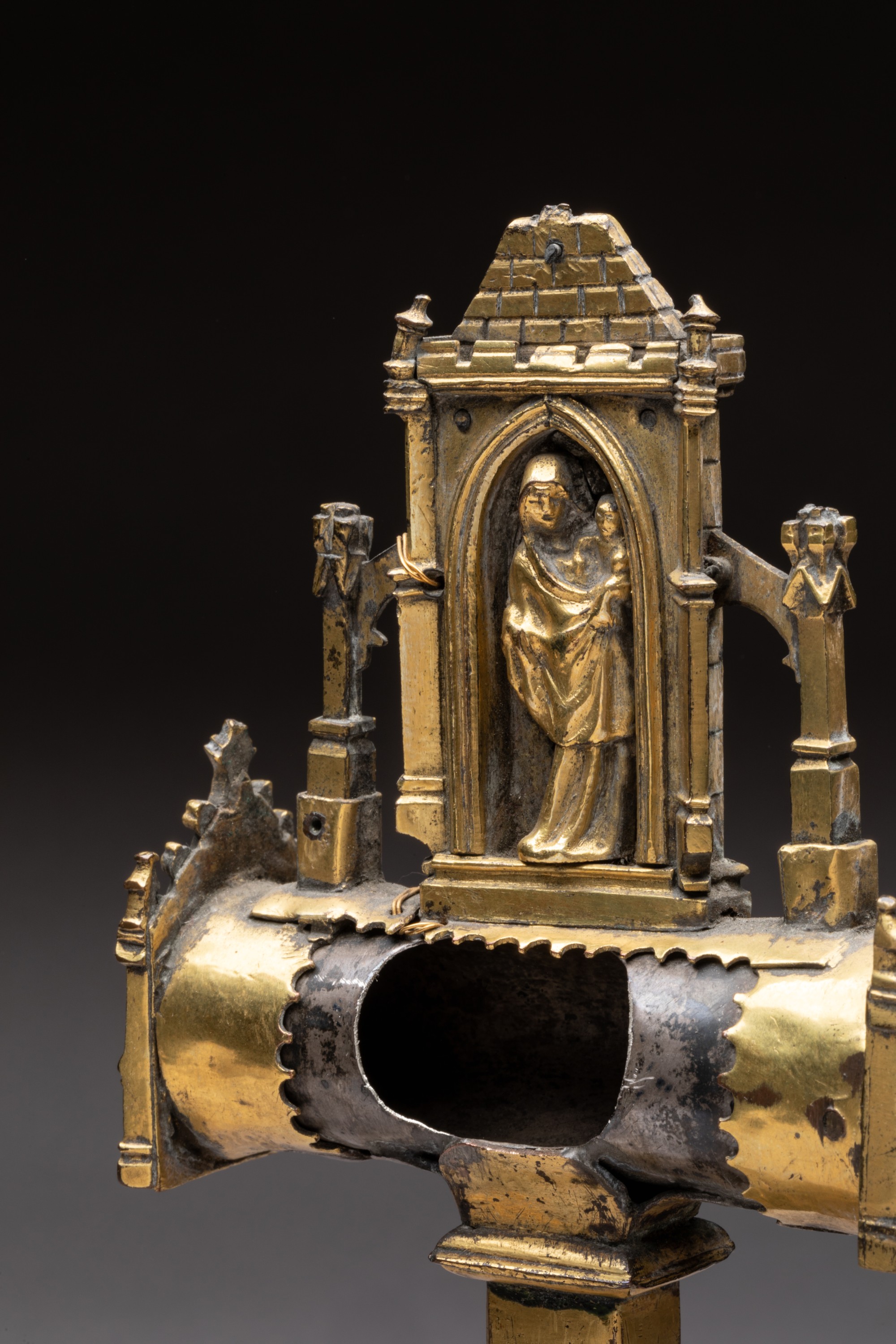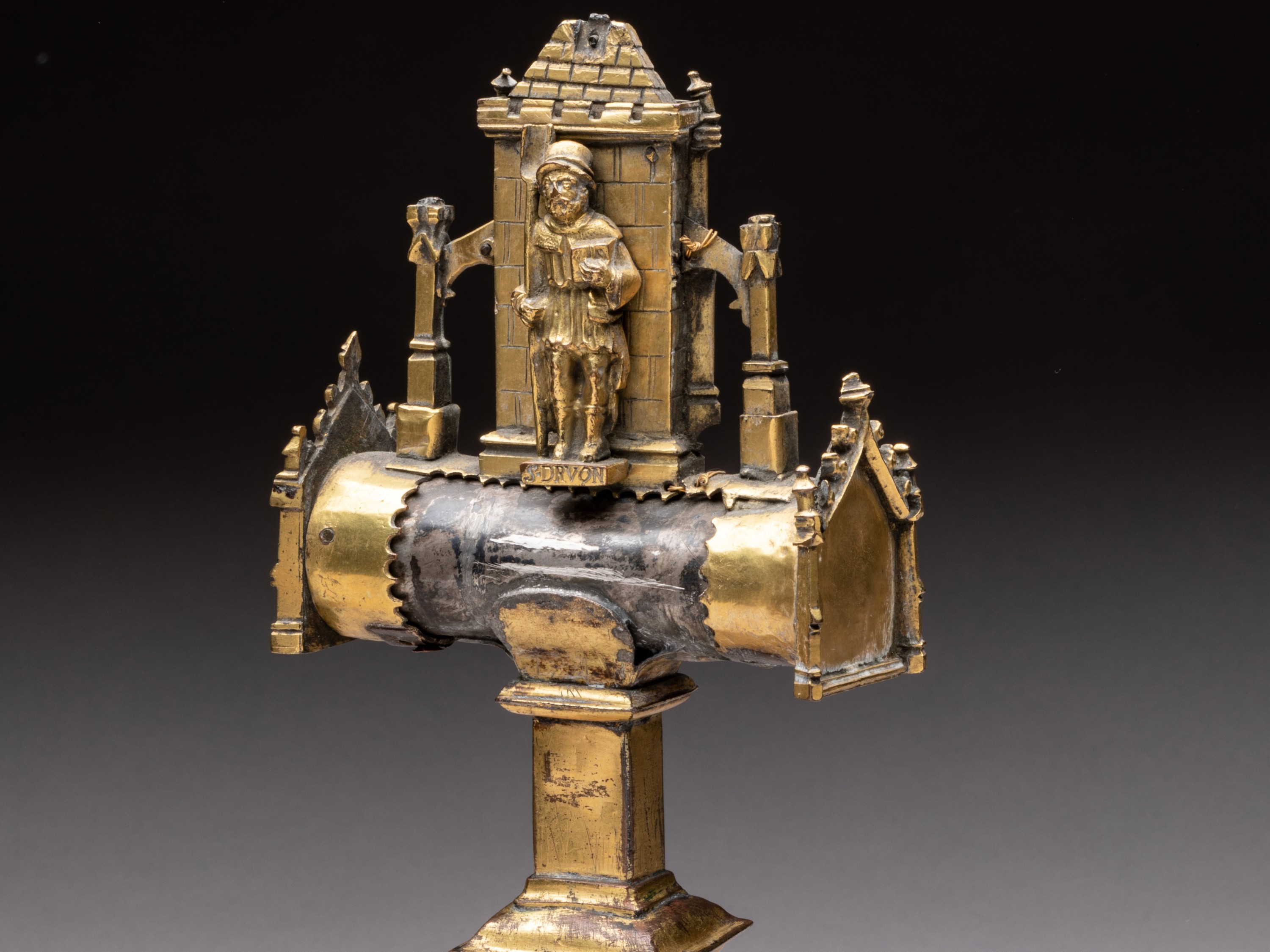 A gilded copper and silver? monstrance reliquary meant to house a relic of saint Druon of Sebourg. Northern France?, late 14th century.