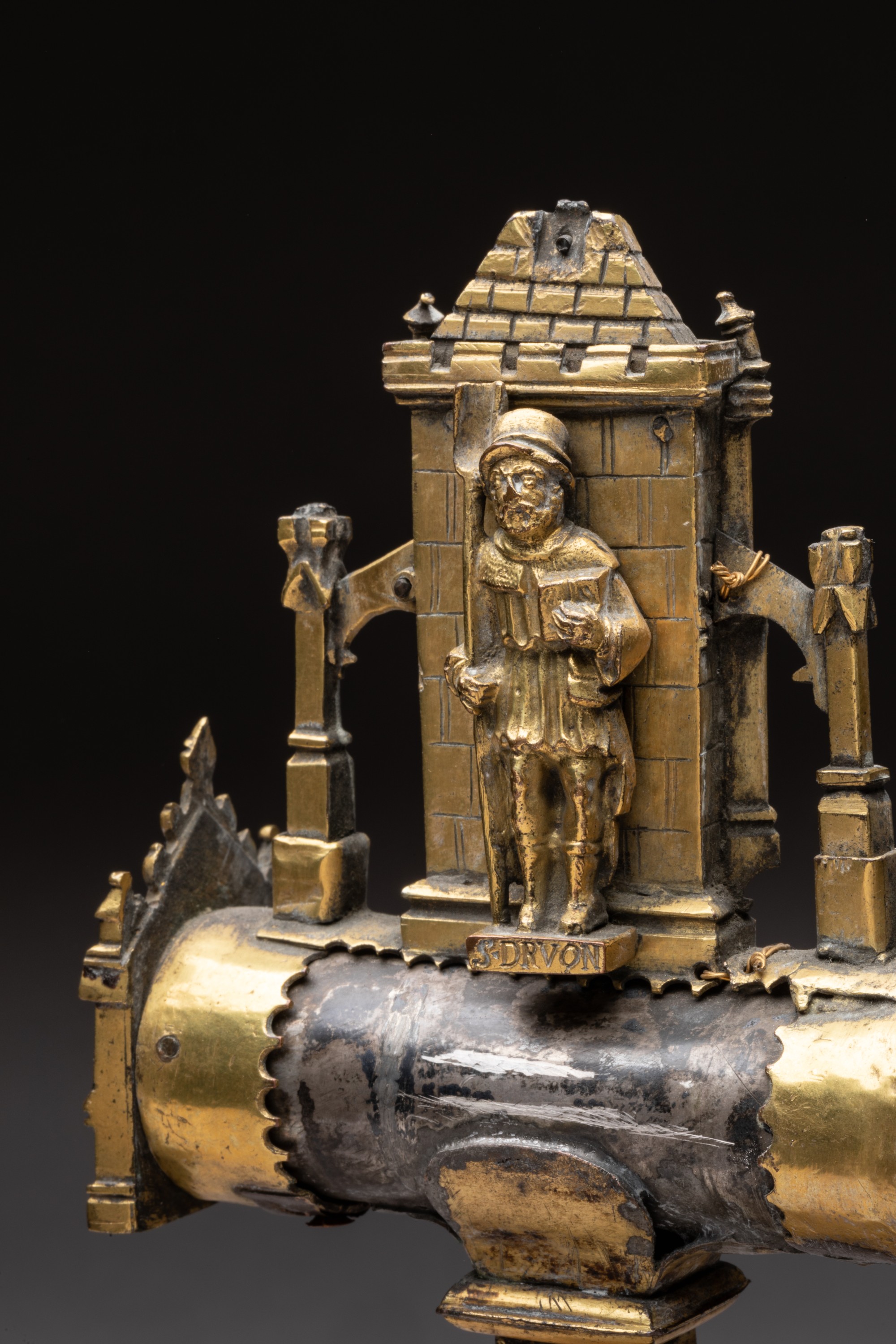 Cuivre doré et argent? Fut de section carrée à nud aplati, réserve à relique de forme cylindrique horizontale avec pignons à pinacles surmontée dune tour avec contreforts, dun côté statuette de saint Druon debout tenant une houlette et un livre, inscription S. DRVON, de lautre la Vierge à lEnfant dans une niche, pied rectangulaire.