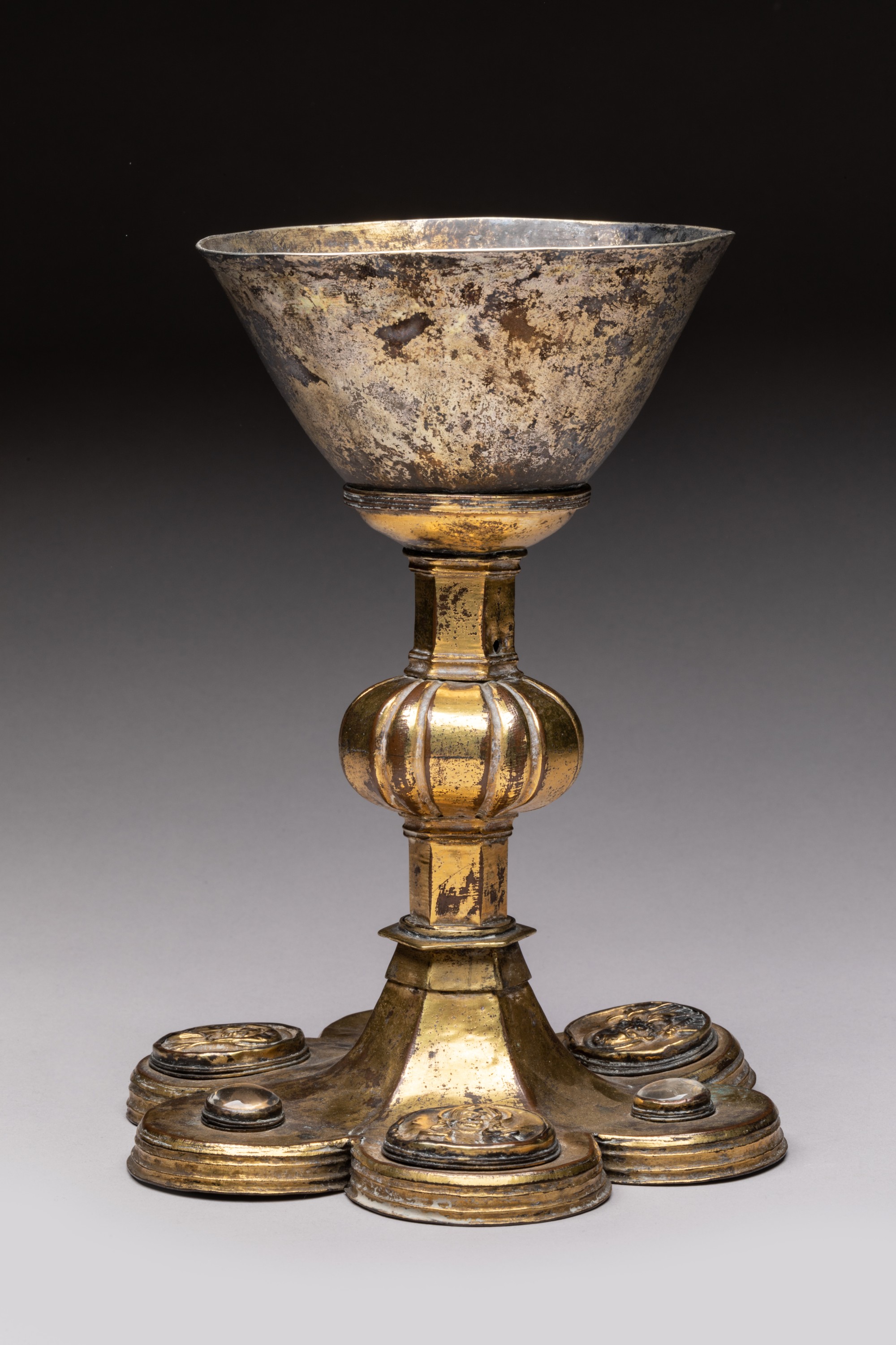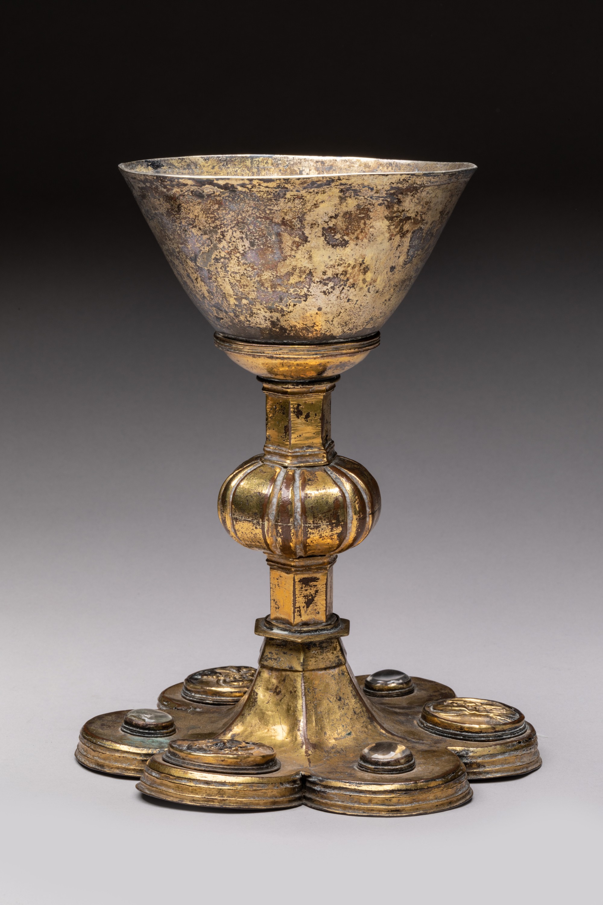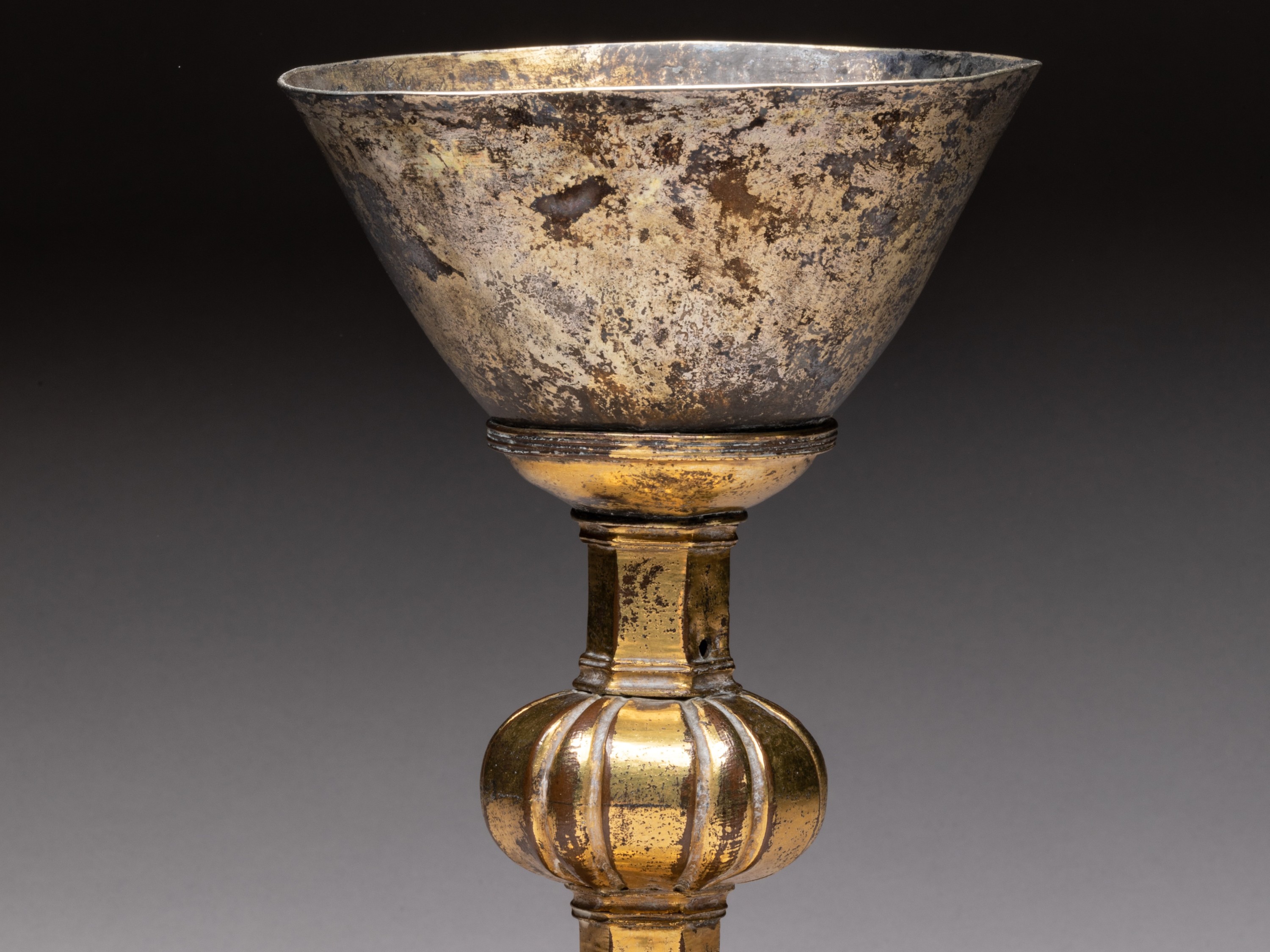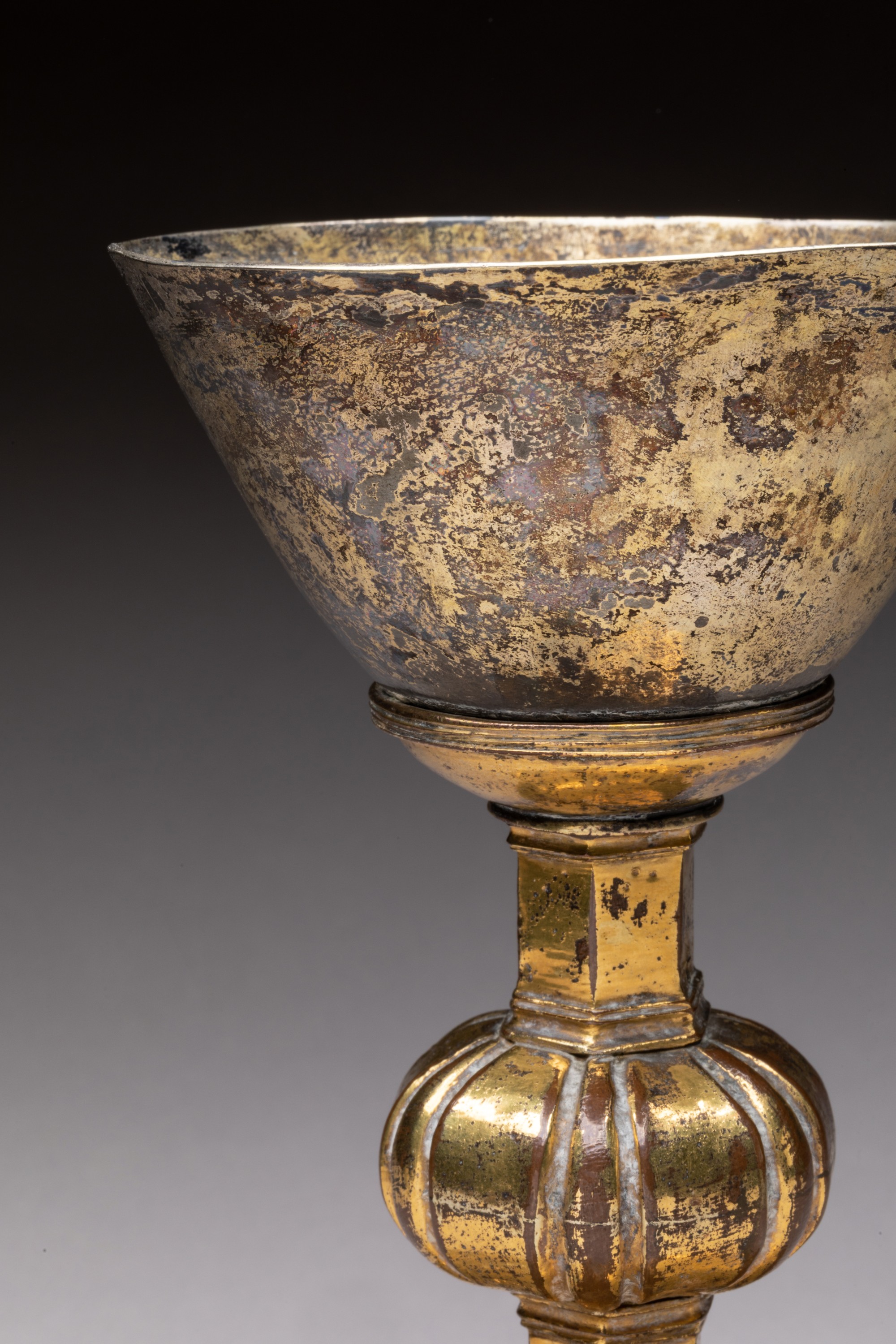 Cuivre doré, la coupe en argent. Fût à tige hexagonale interrompue par un nœud godronné, pied à six lobes ornés de cabochons de verre et de médaillons représentant la Vierge, le Christ et saint Jean-Baptiste, coupe évasée.