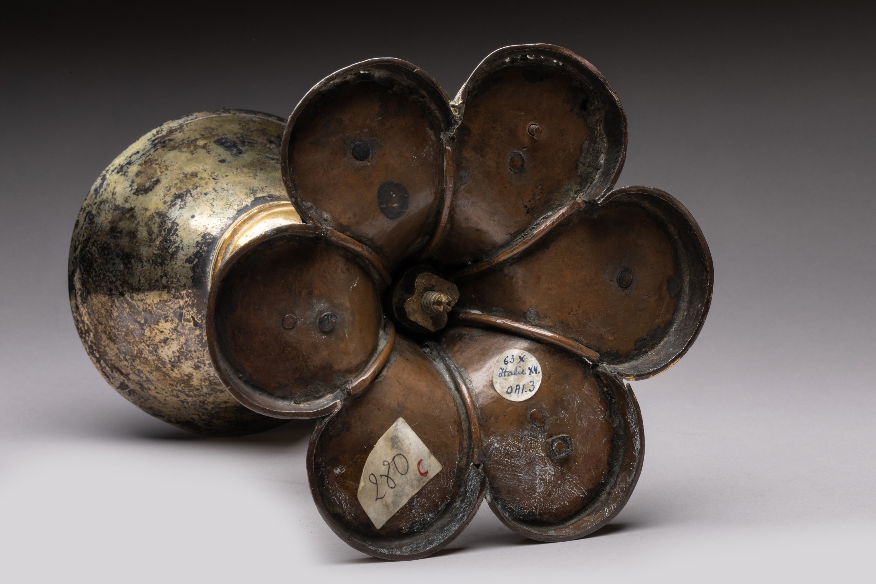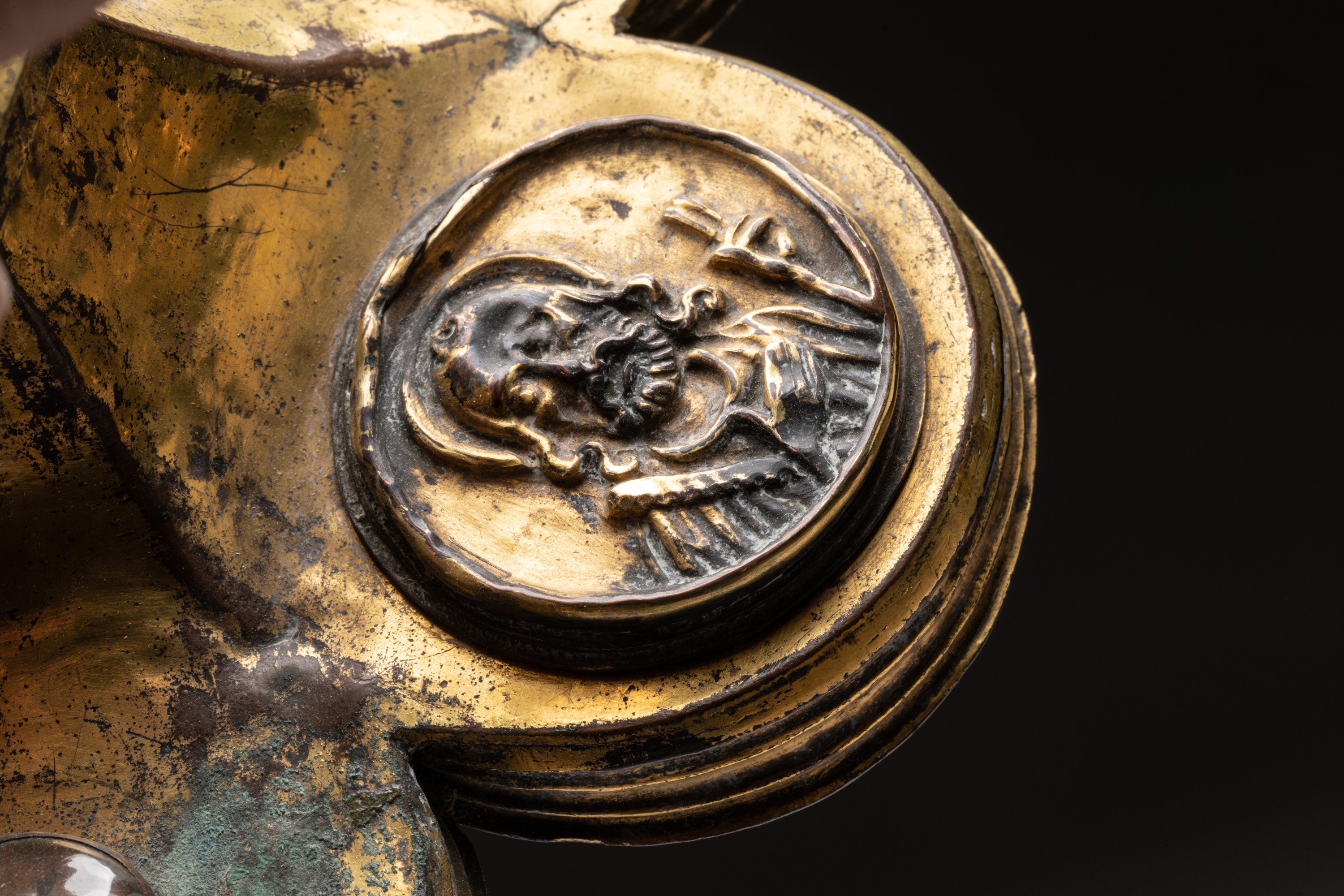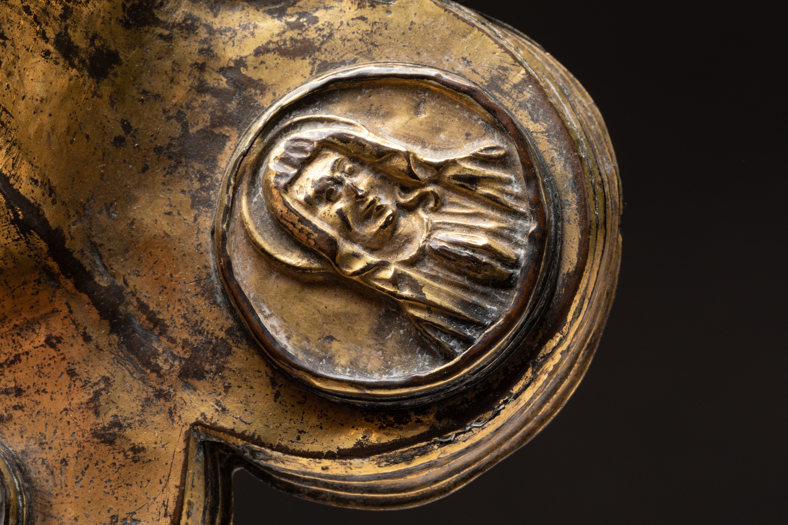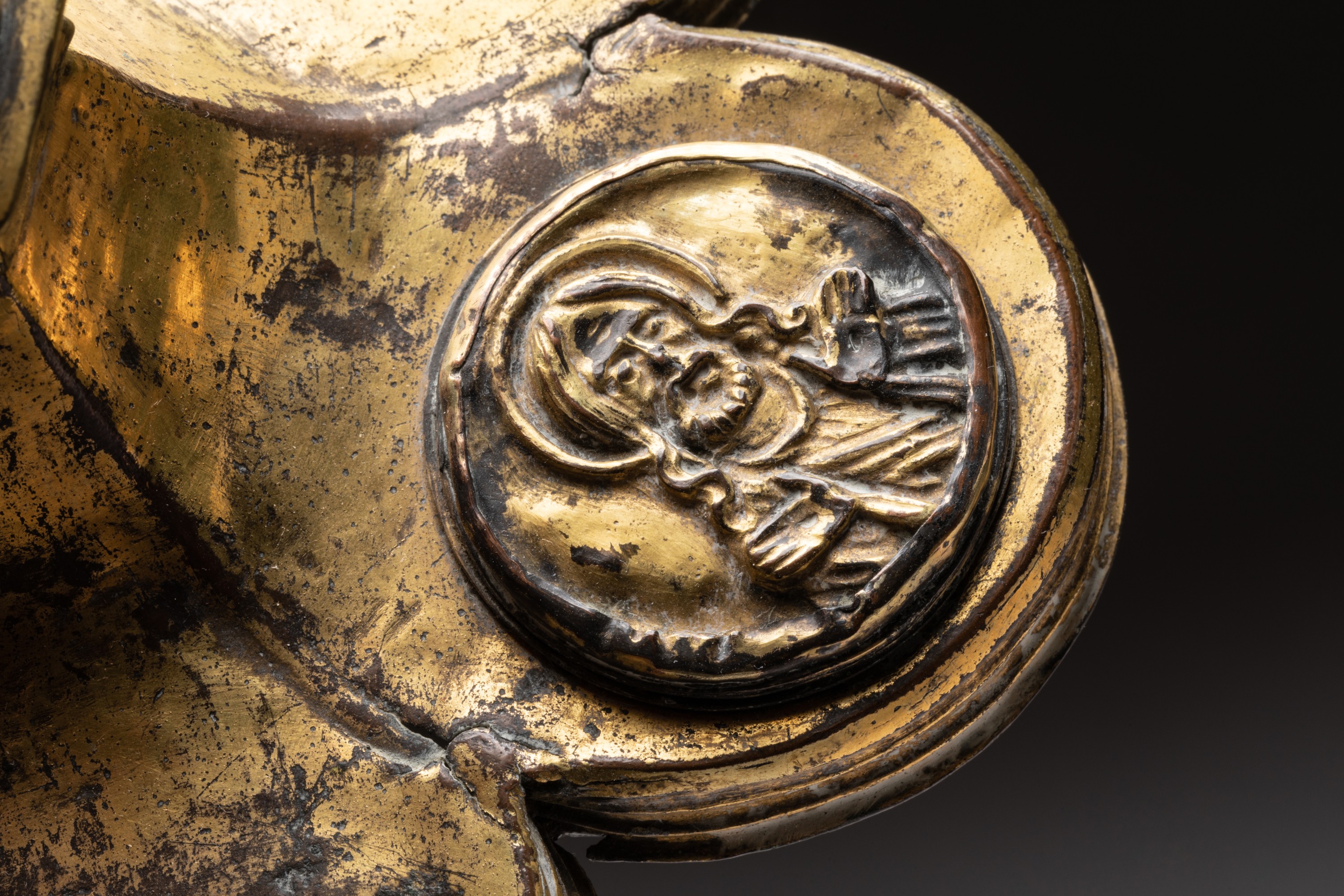 A gilded copper and silver chalice decorated with glass cabochons and medals depicting the Virgin Mary, Jesus Christ and Saint John the Baptist. Italy, 15th century.