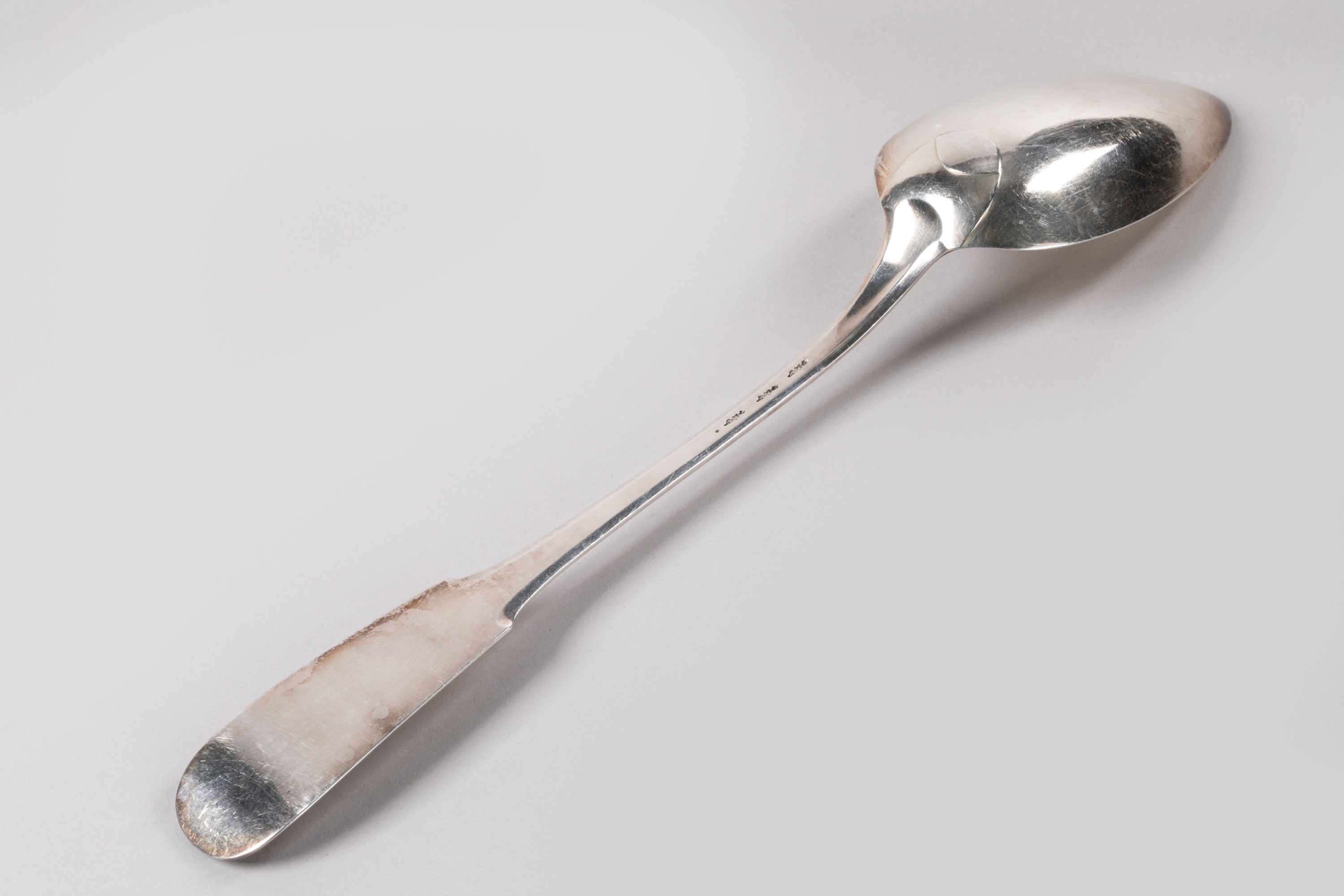 An 18th century silver stew spoon by Hanappier. Uni-plat pattern.