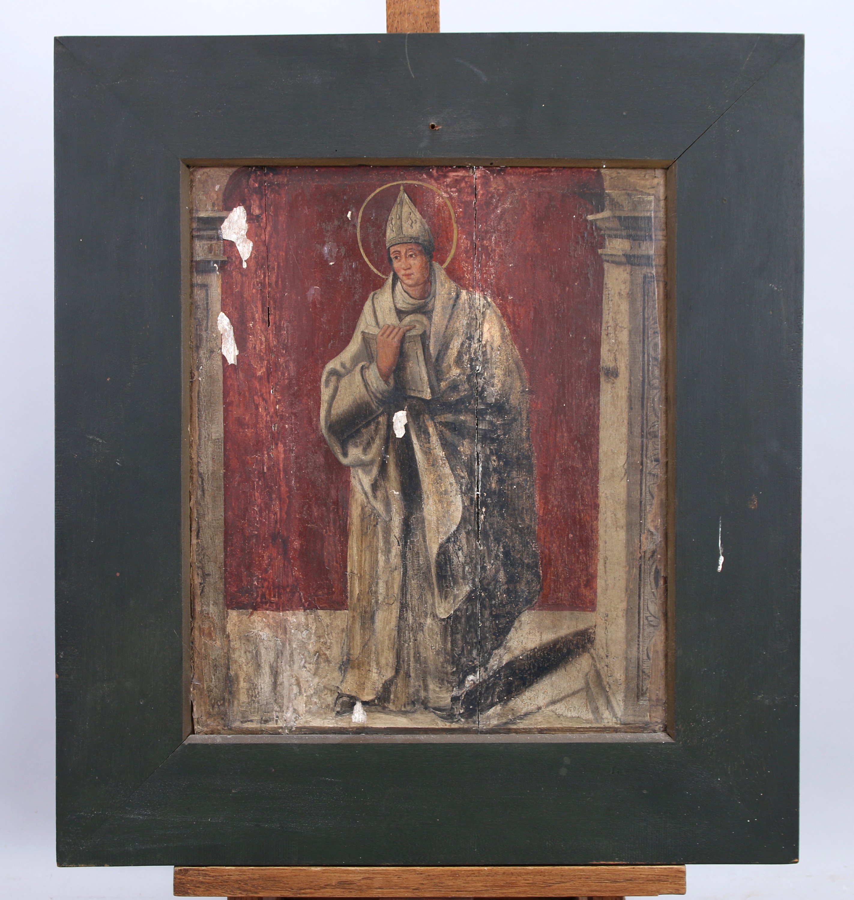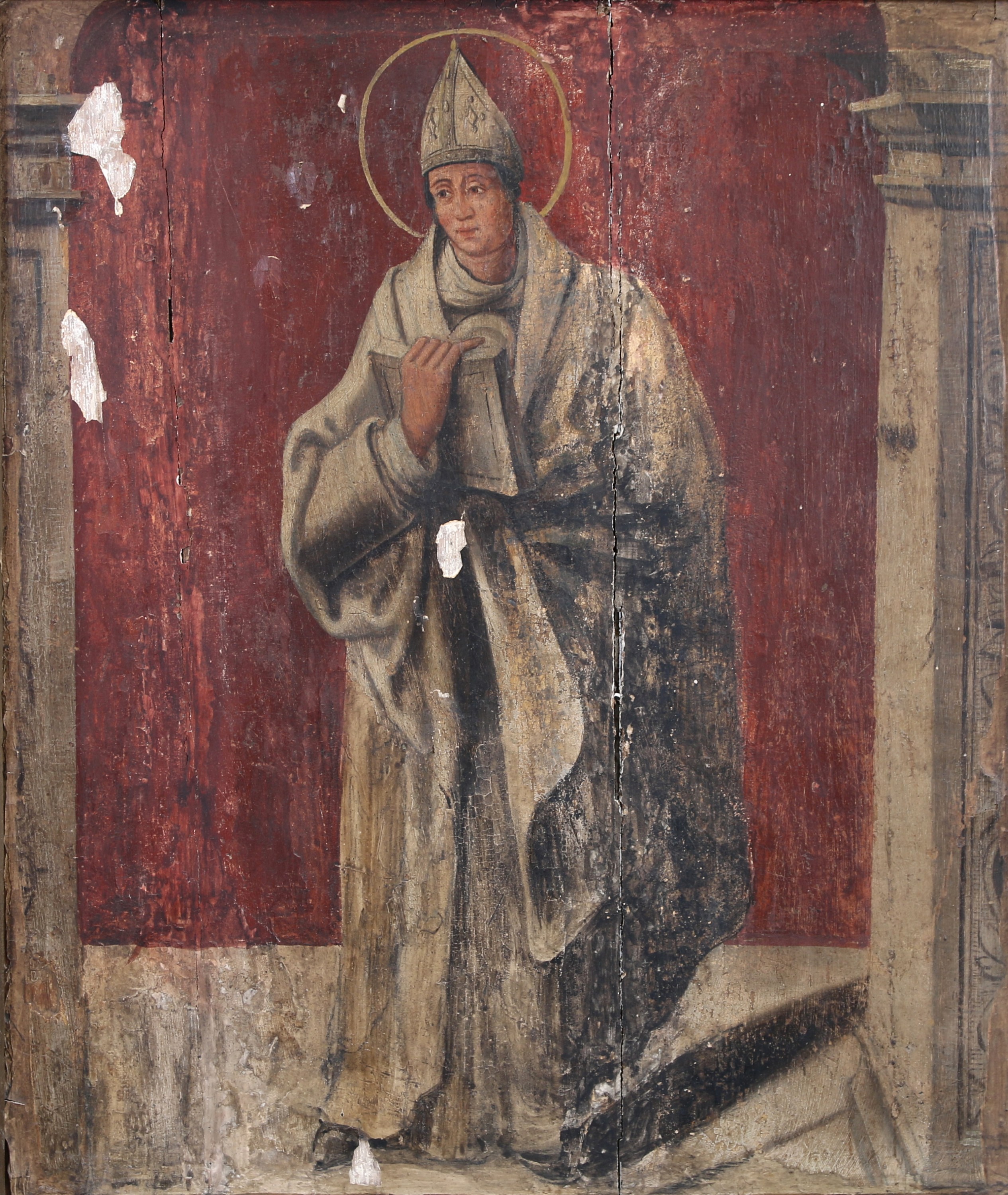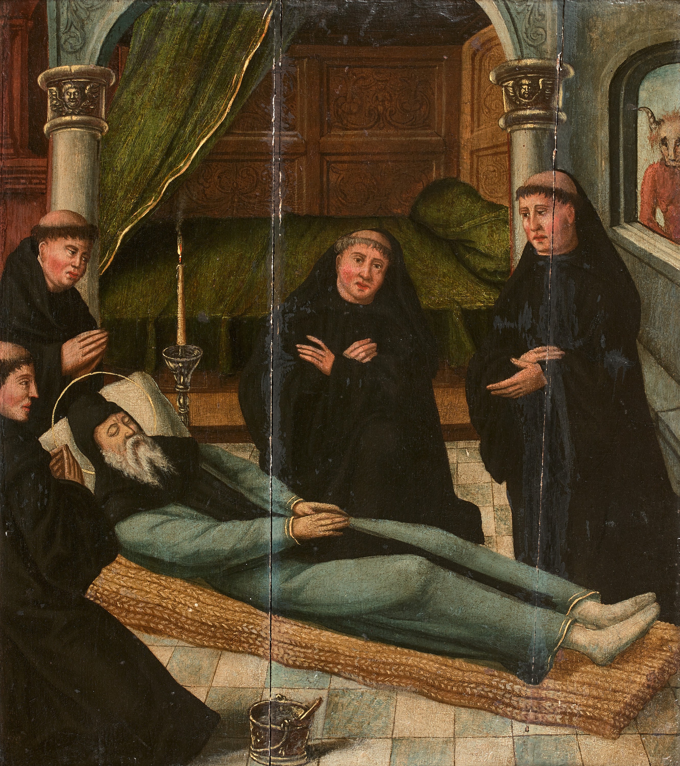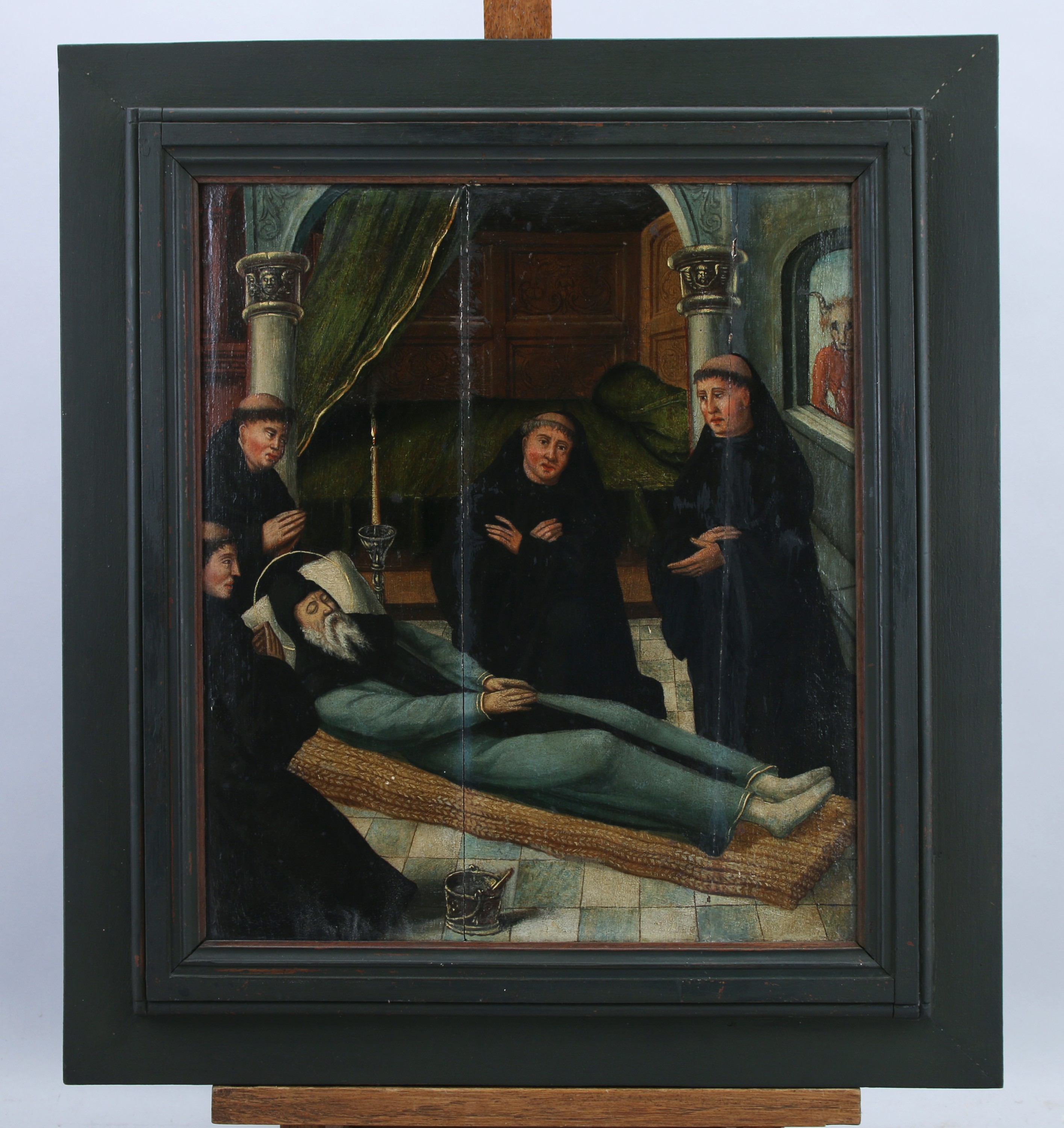 A French early 17th century painting depicting the death of a holy man surrounded by four monks. Double-sided panel painting.