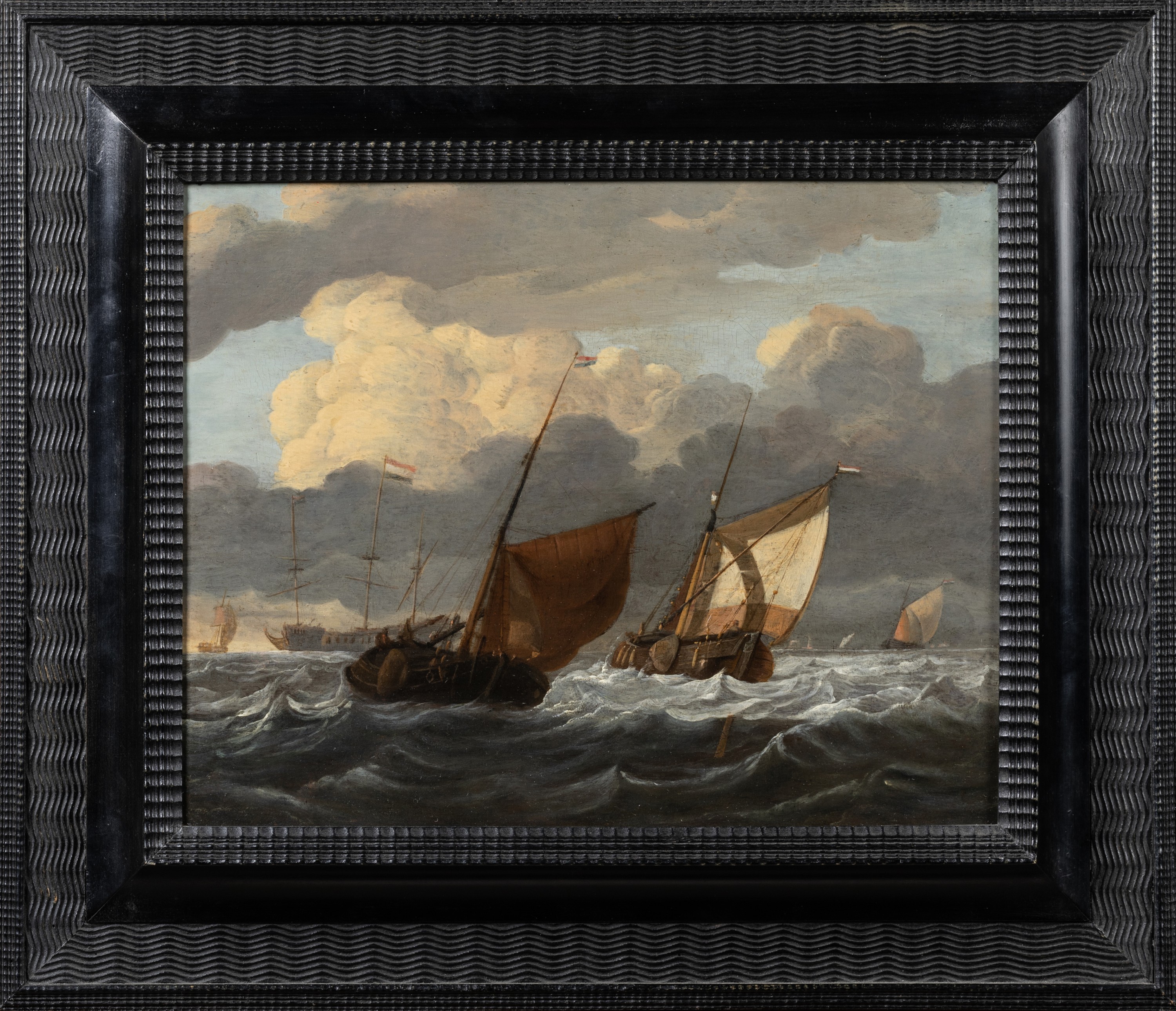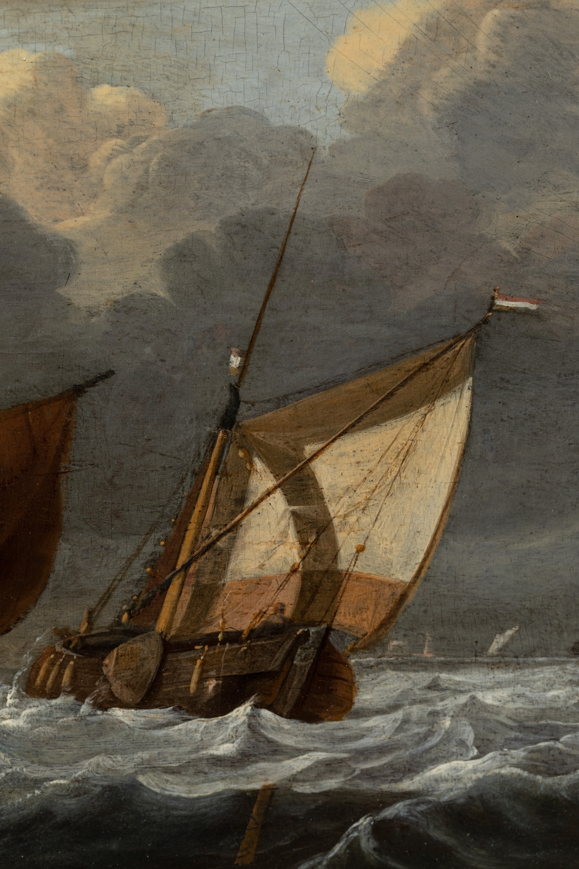 A marine by Vitringa depicting ships in choppy waters. Oak panel painting.