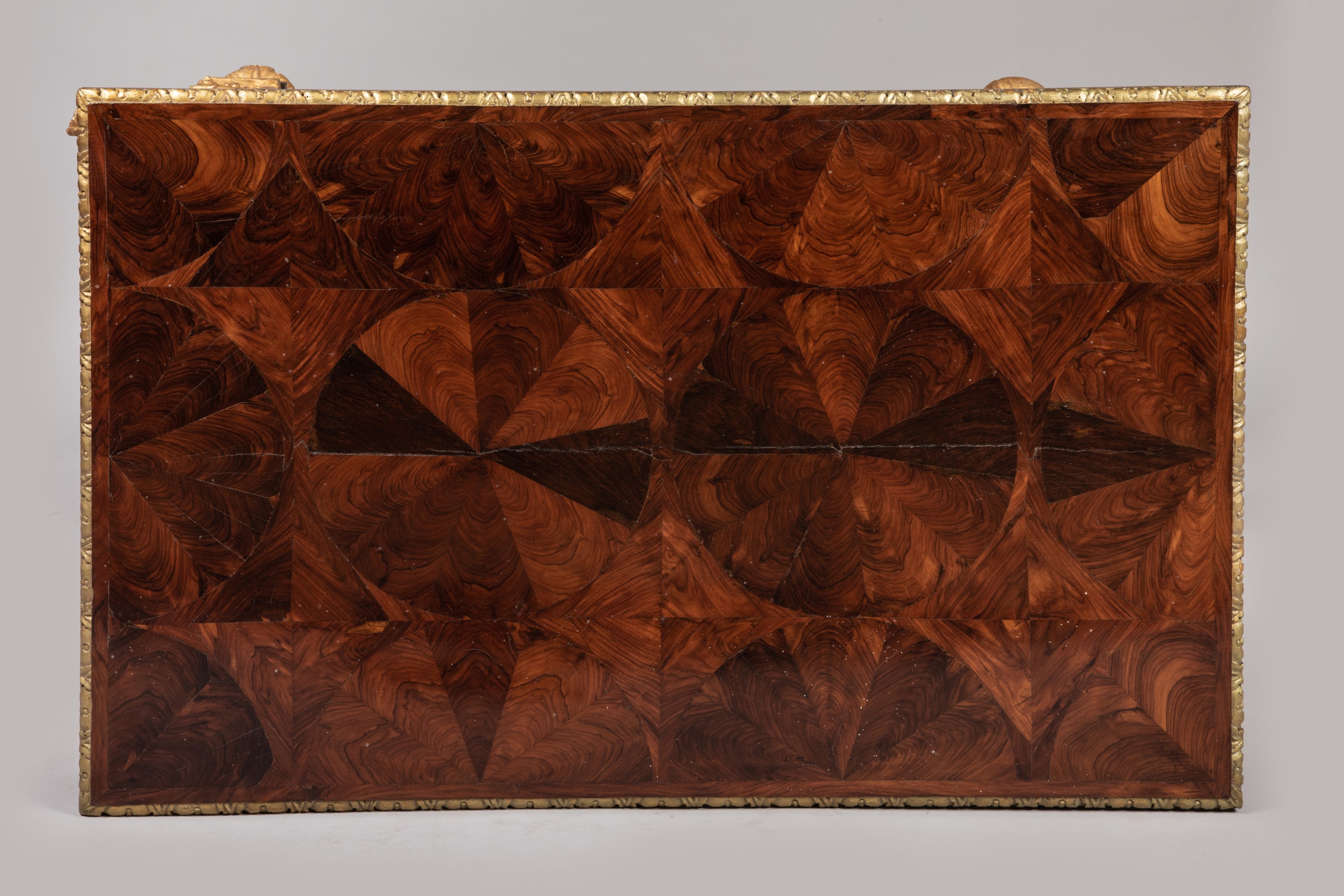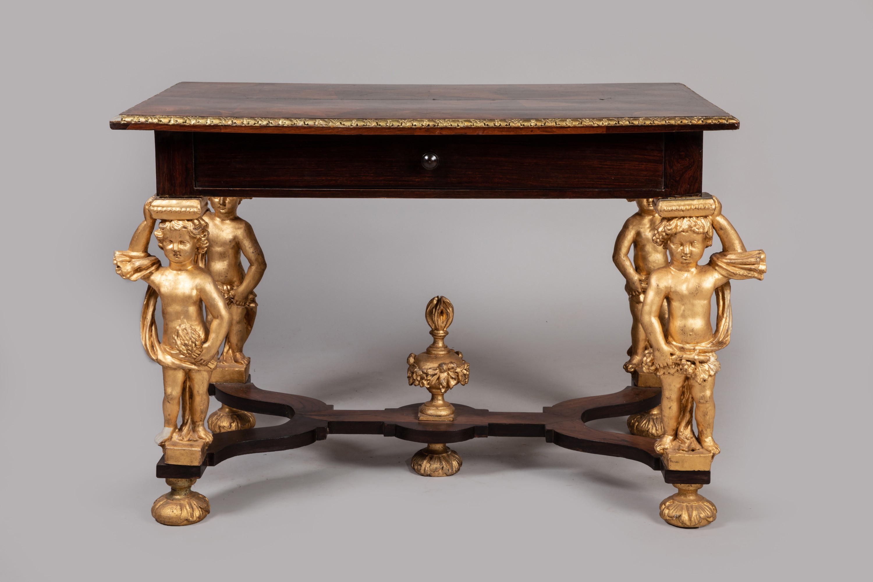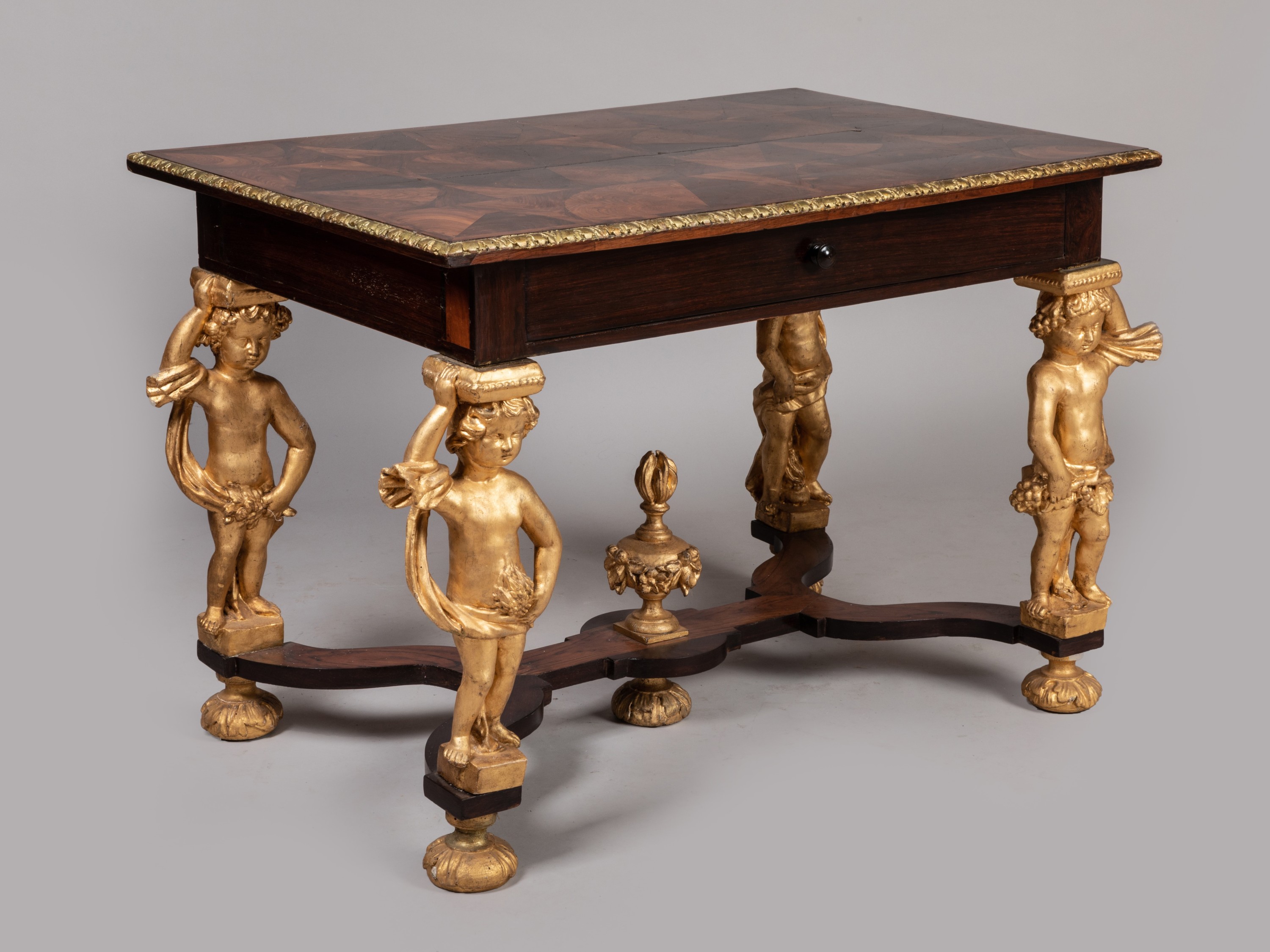 A Southern French Louis XIV "four-season" table. Violet and rosewood veneer as well as carved and gilded wood. Remodeled drawer and partially renovated gilding.