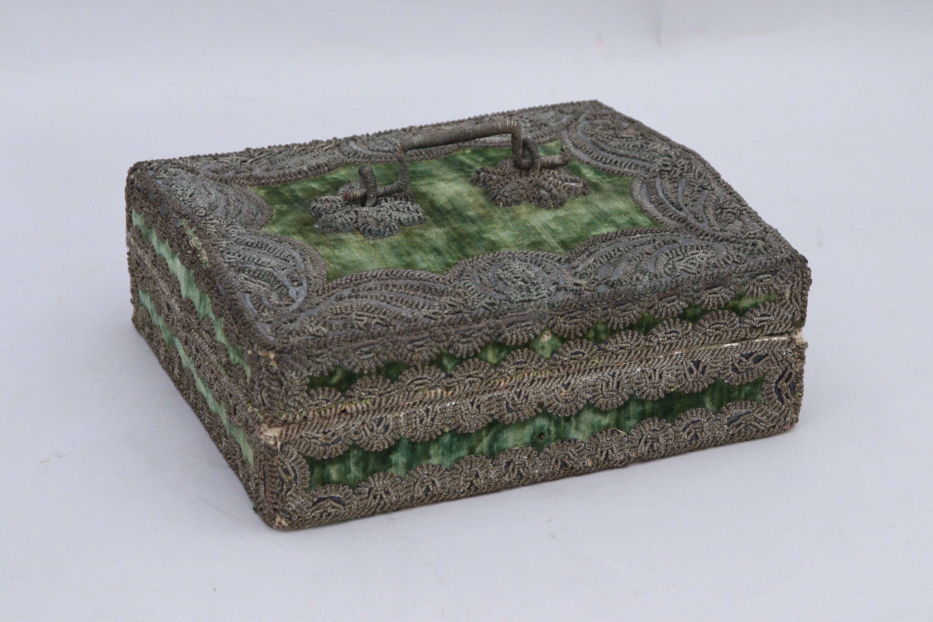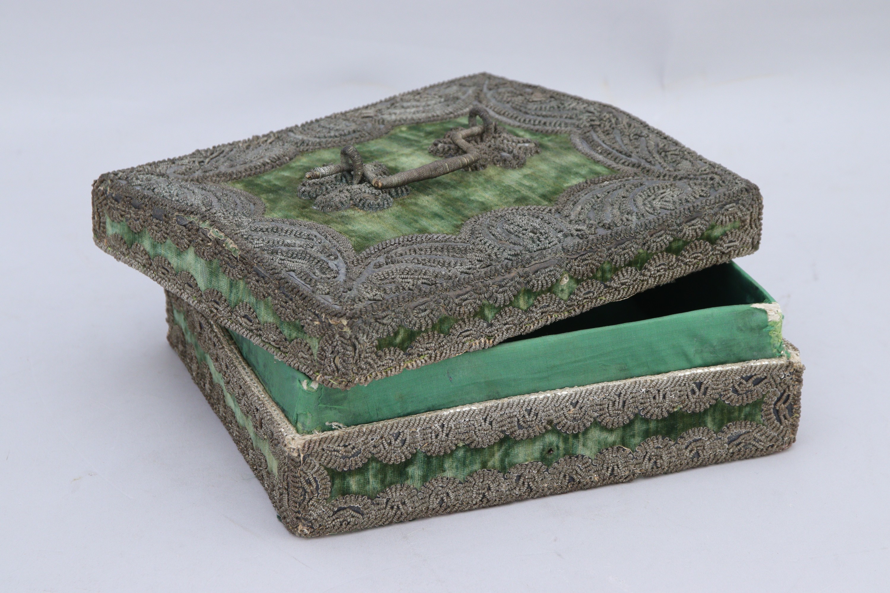 Broderie dargent à décor de fleurs de lys aux angles, sur velours vert. De forme rectangulaire le dessus légèrement bombé découvre un intérieur de soie verte, lacets de cordons croisés. Muni dune poignée fixée par des rosettes en étoile, sur le couvercle.