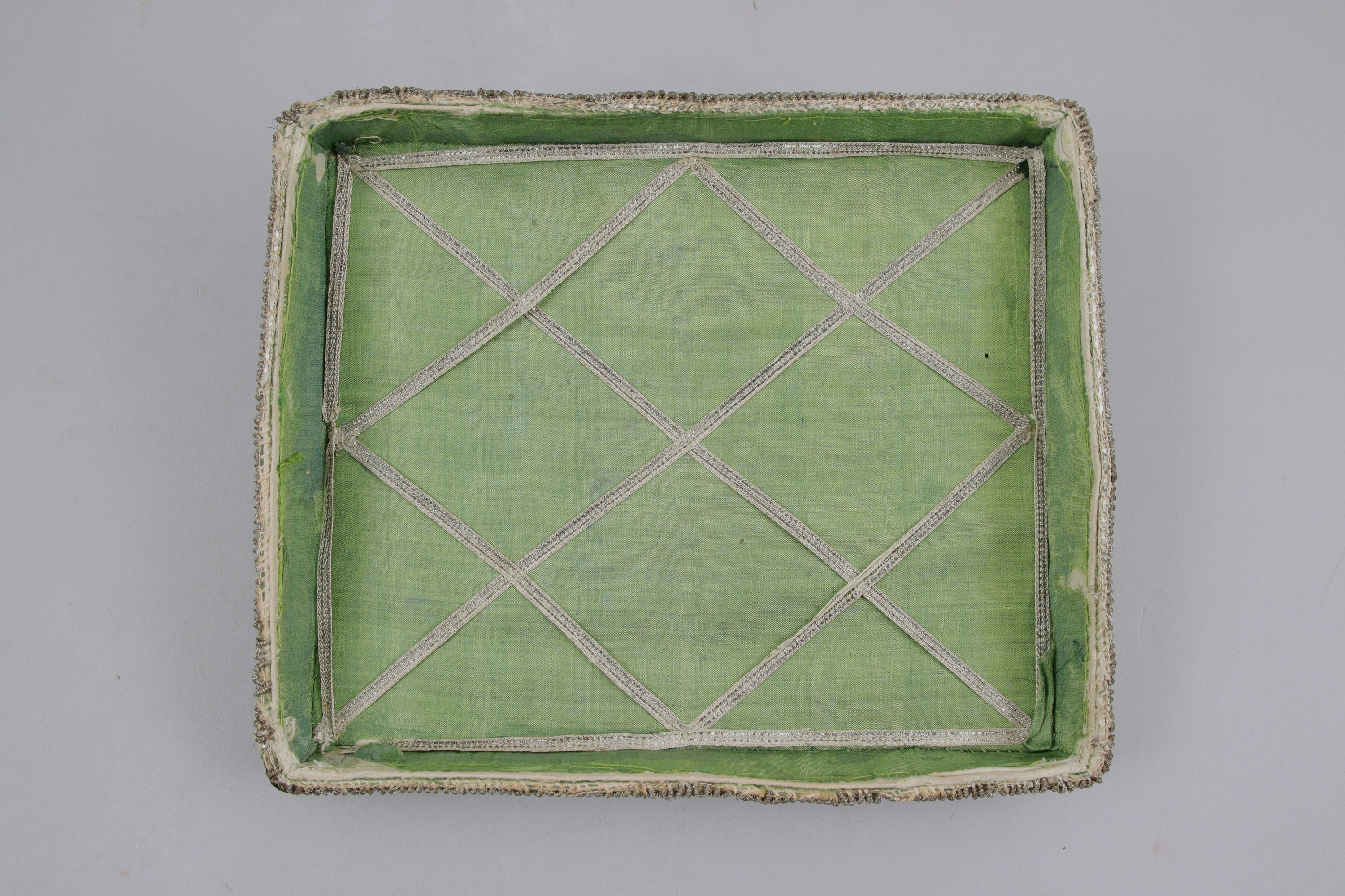 A Regency period letterbox with embroidered silver fleur-de-lis on green velvet.