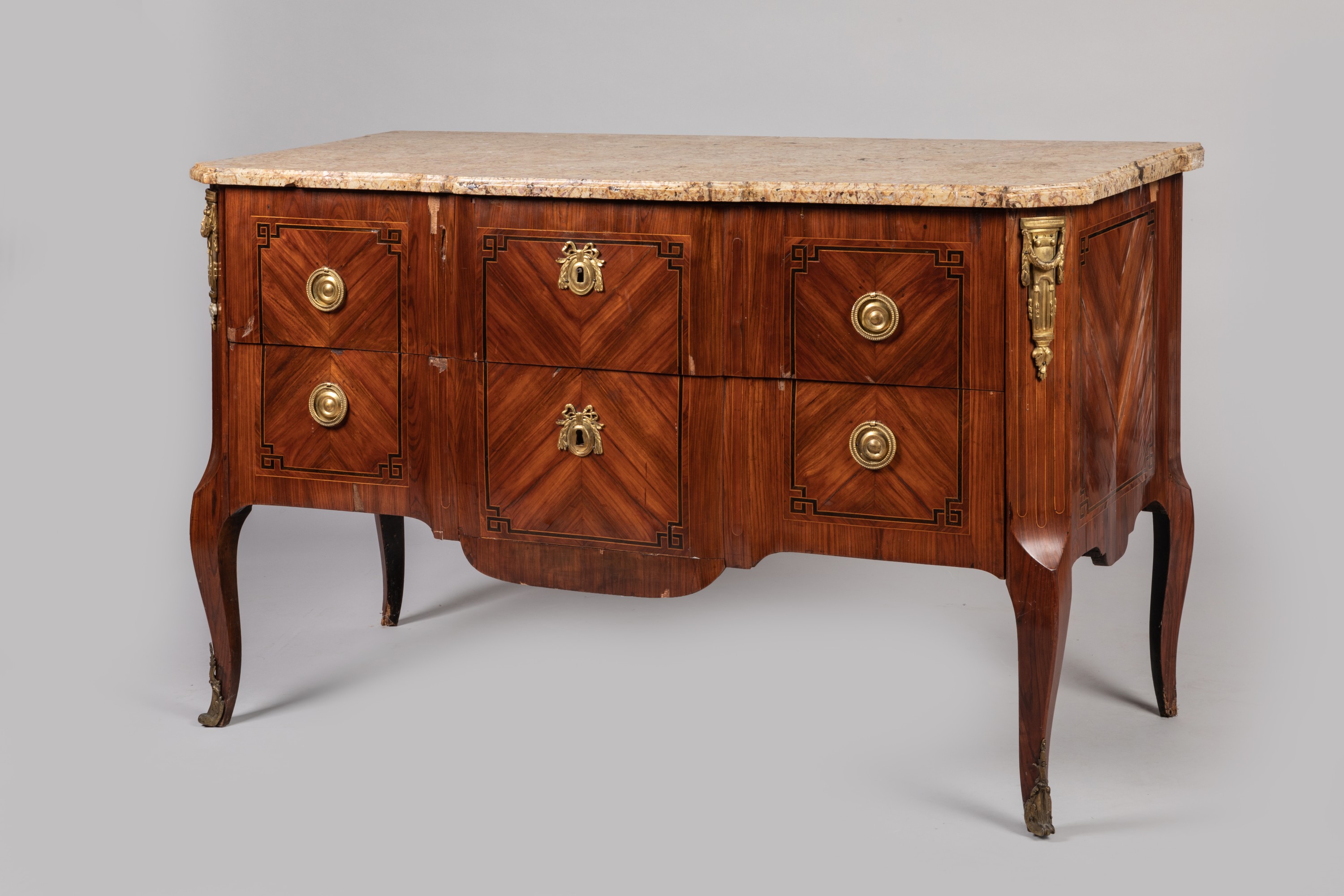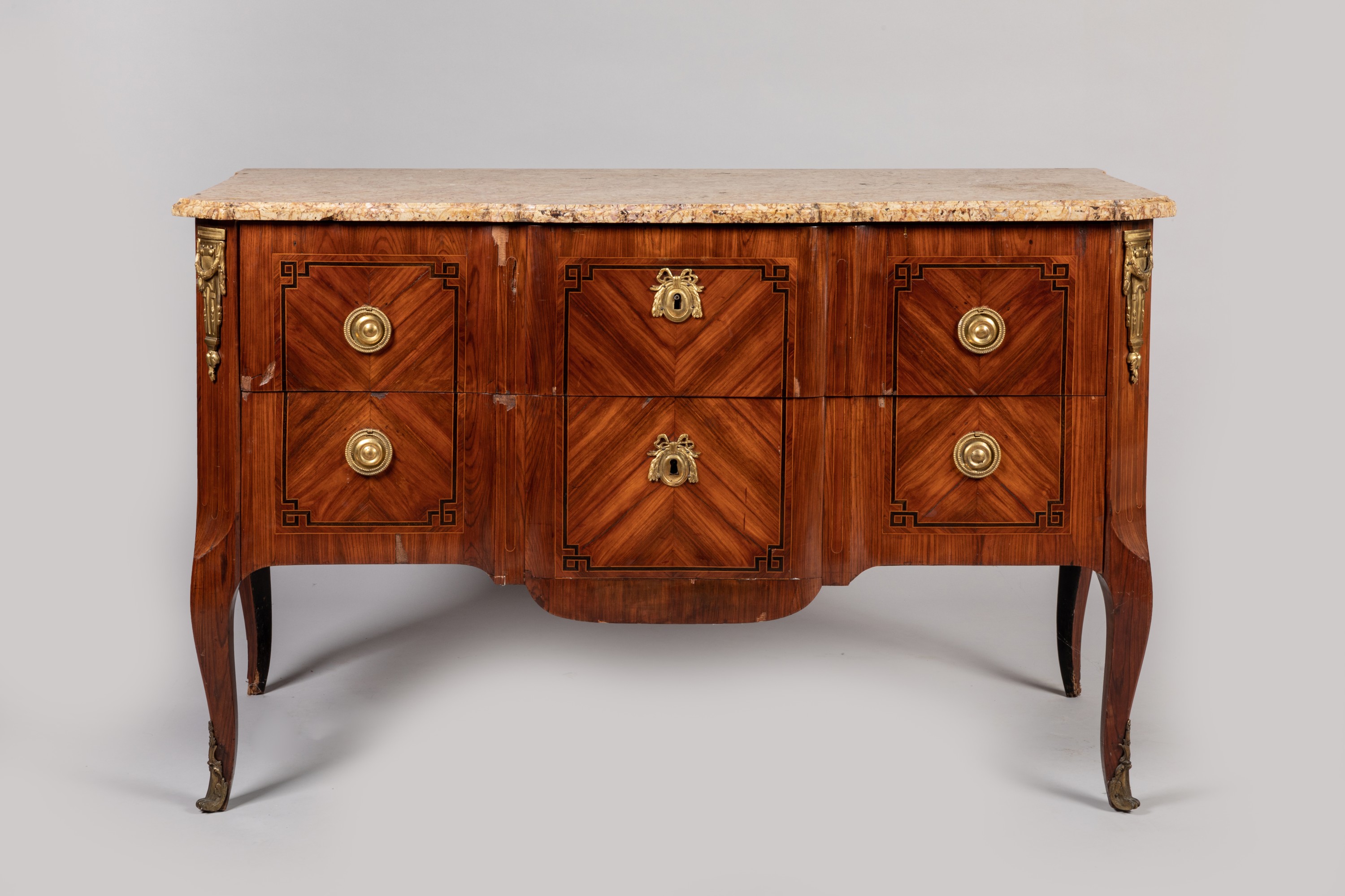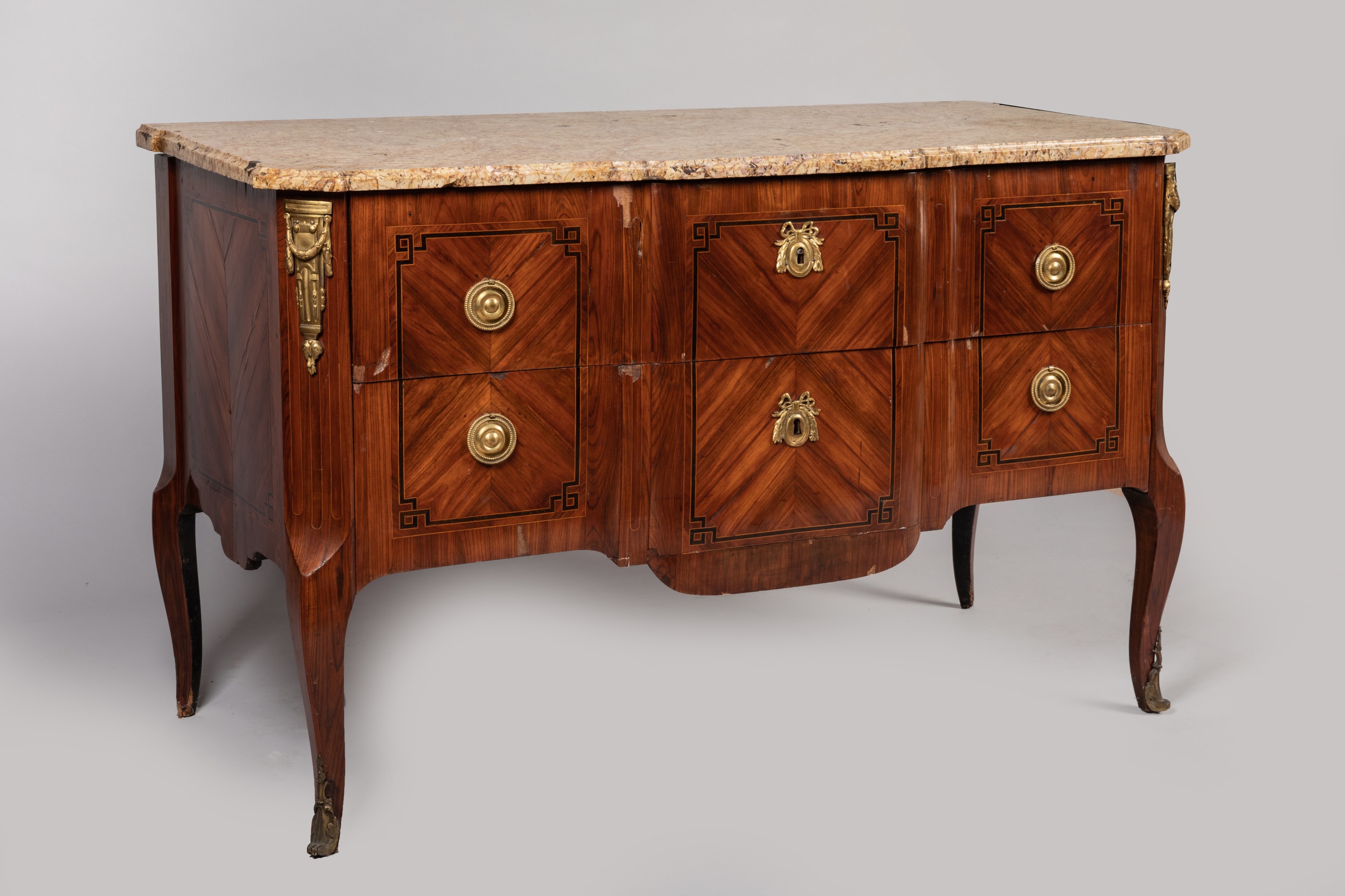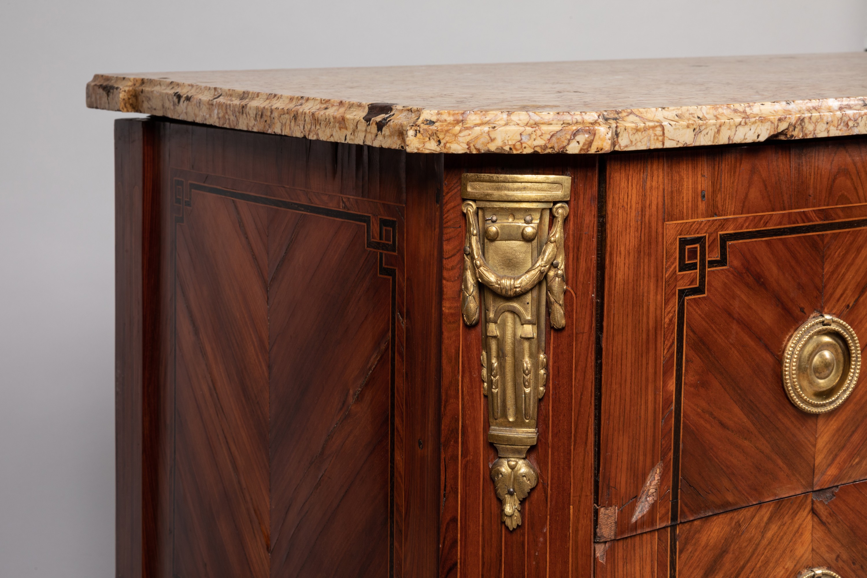 A Transition period chest of drawers with slightly protruding front and canted corners. Violet and rosewood veneer, bronze ornamentation partly from the same period, yellow marble top. Made in the Paris area.