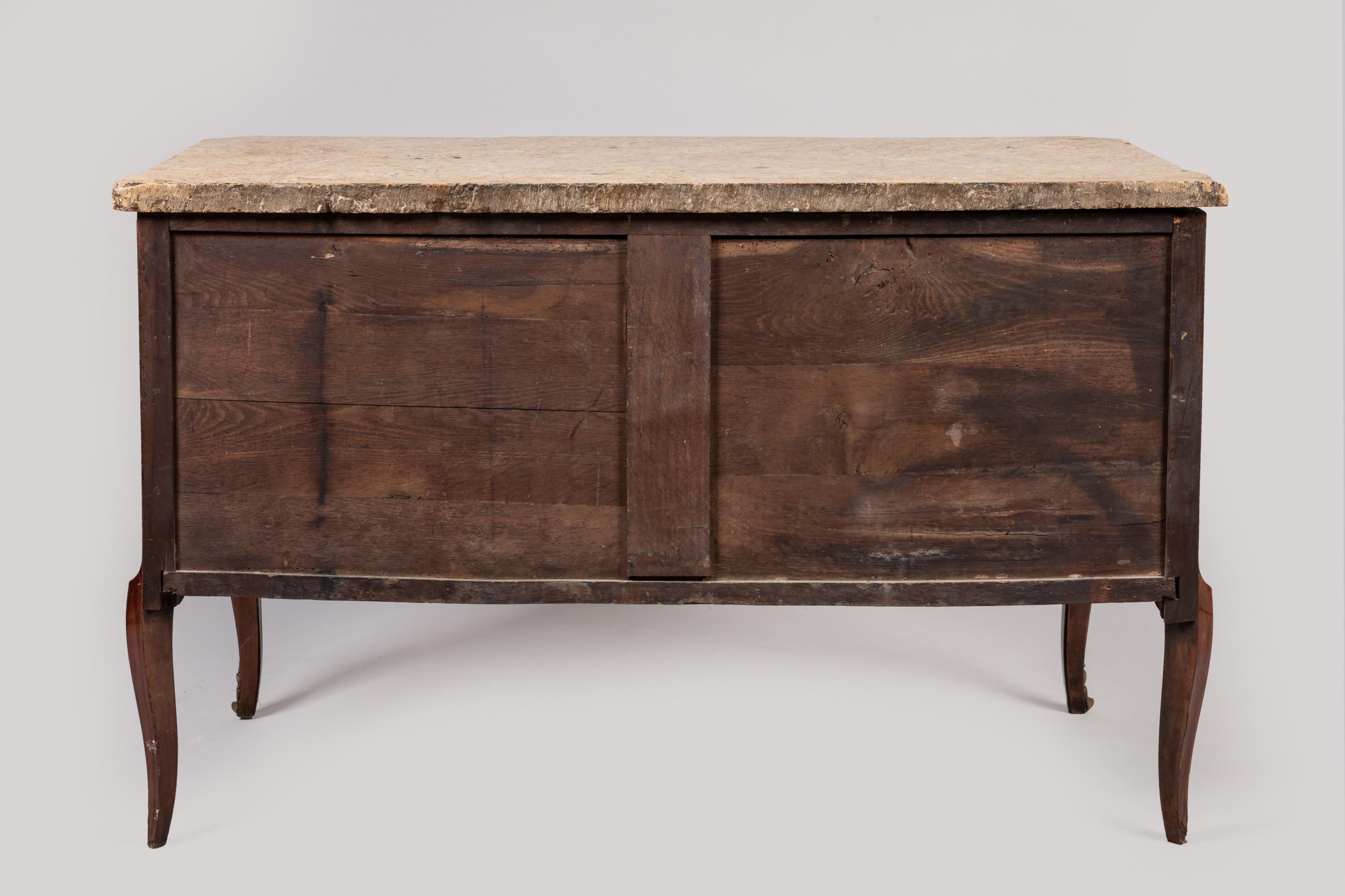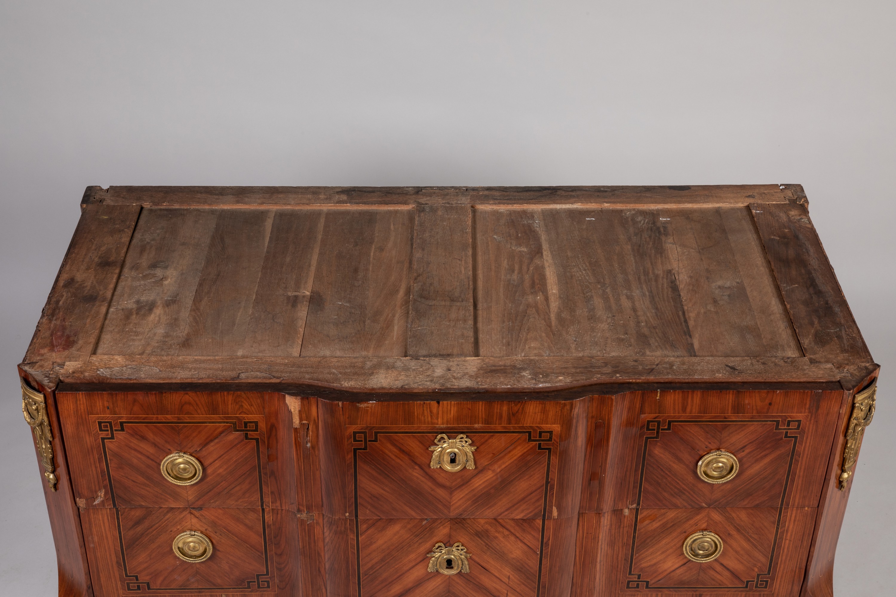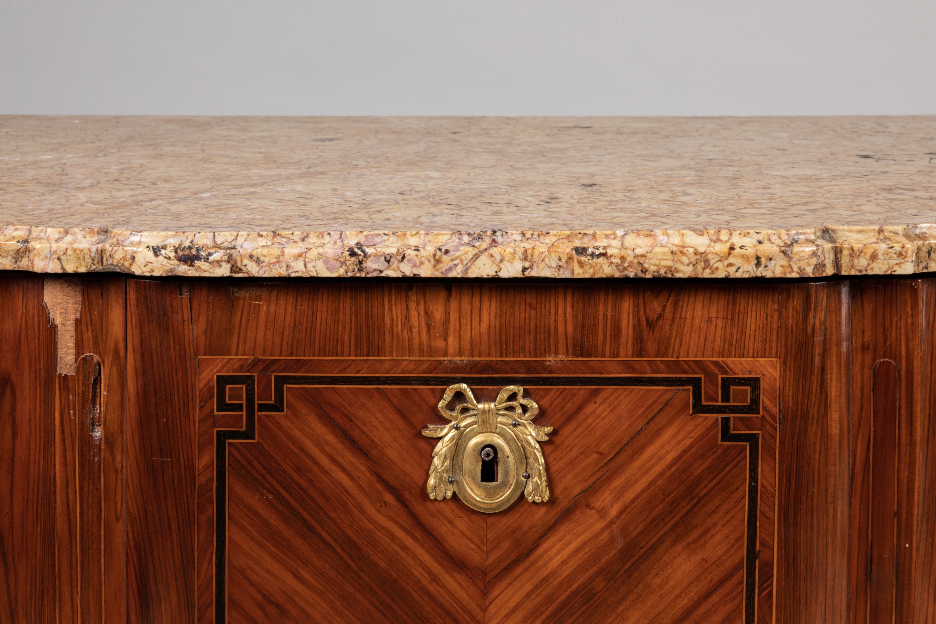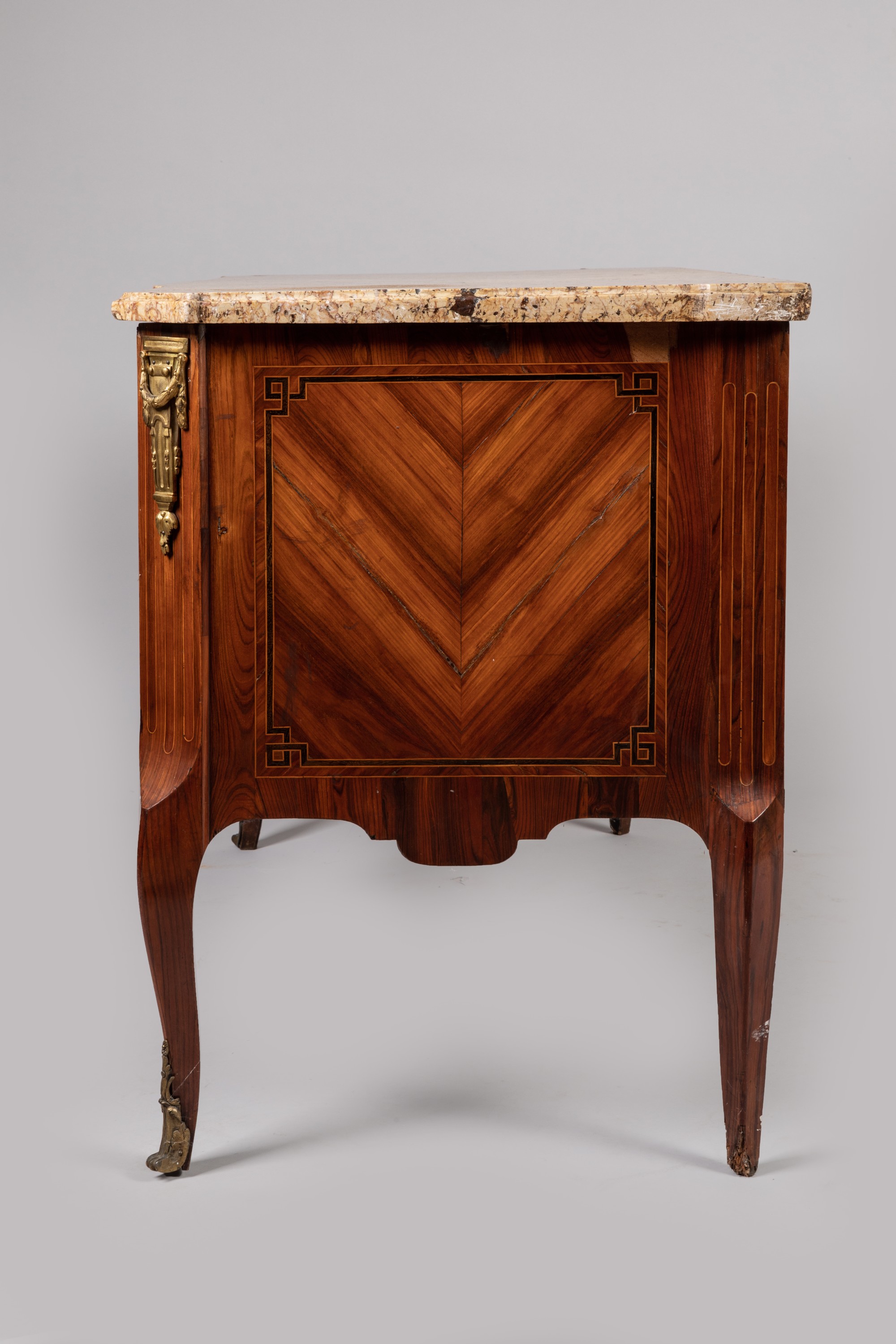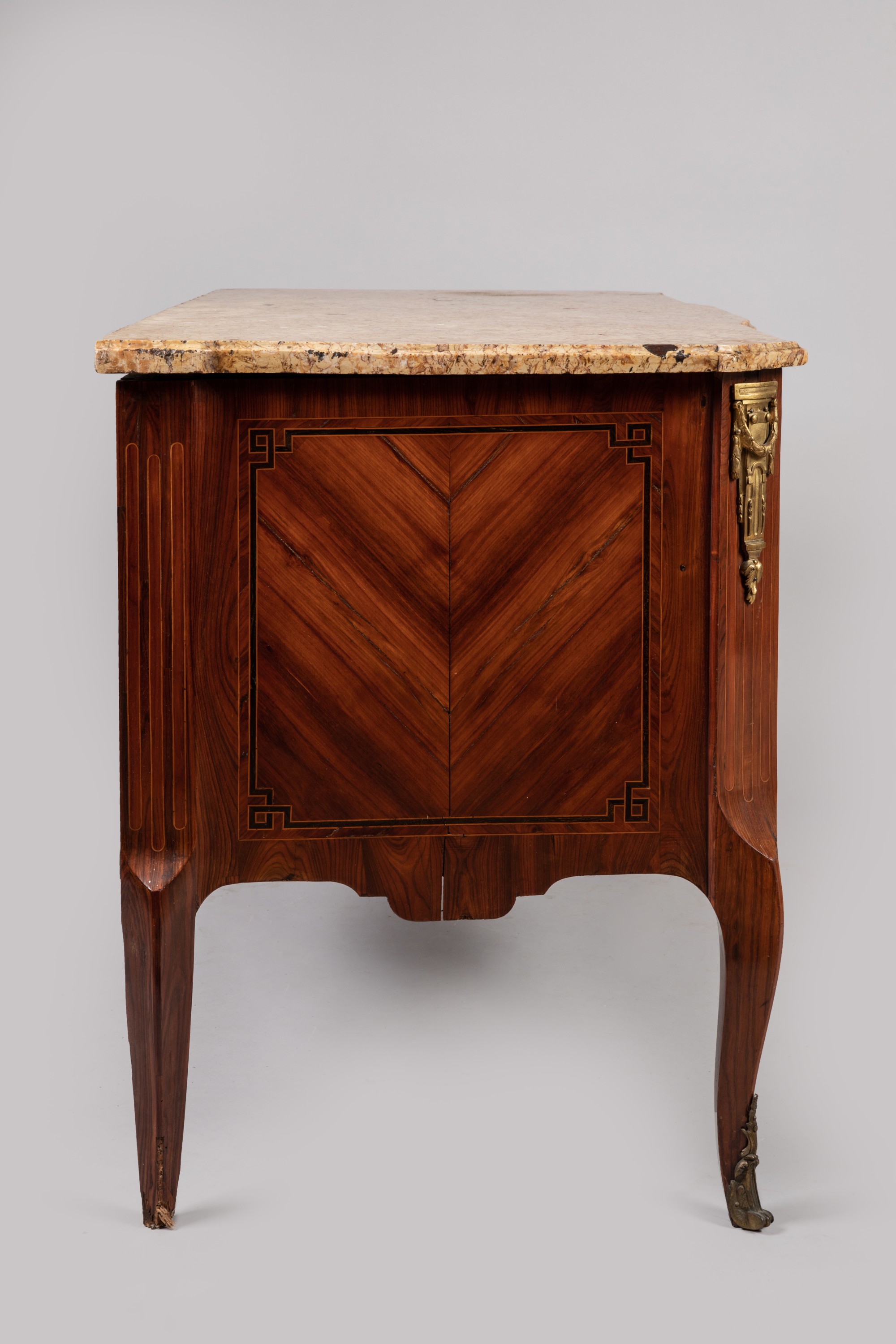 A Transition period chest of drawers with slightly protruding front and canted corners. Violet and rosewood veneer, bronze ornamentation partly from the same period, yellow marble top. Made in the Paris area.