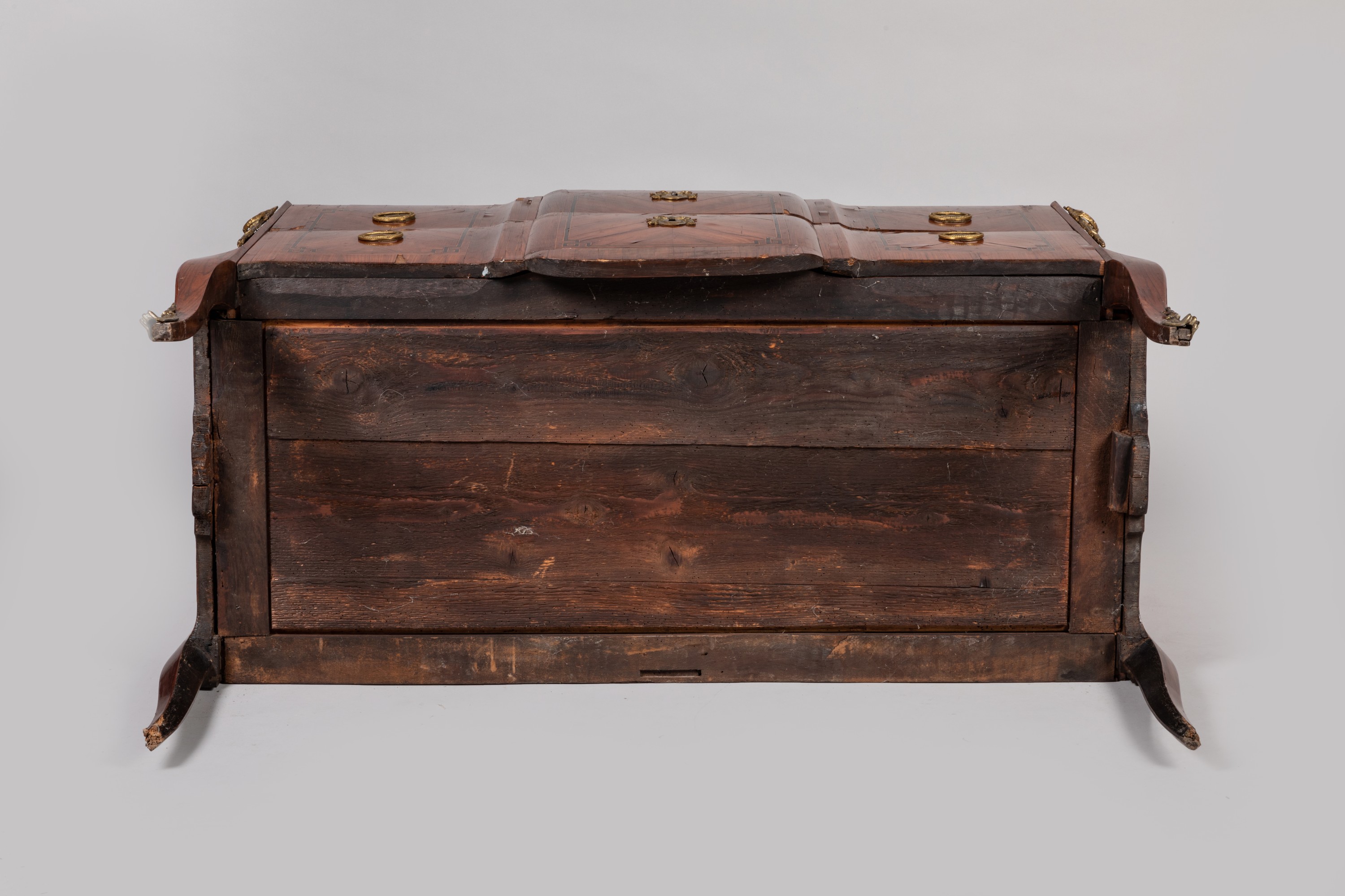 en placage ouvrant à deux tiroirs dissimulant les traverses. Décor de trois réserves en bois de rose dans des encadrements de bois de violette soulignés de filets composés à coin à la grecque et de cannelures simulées. Elle repose sur des pieds cambrés.