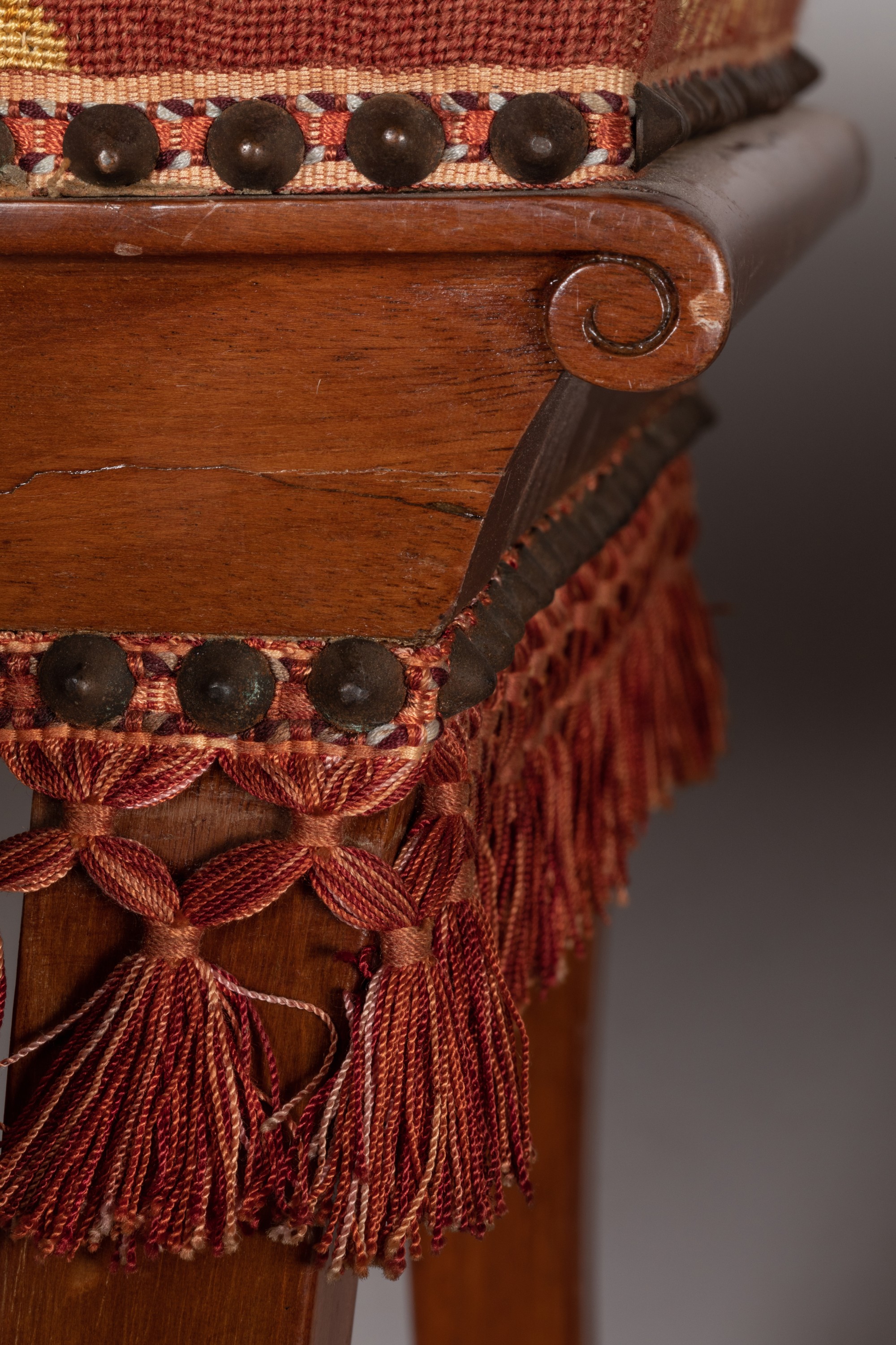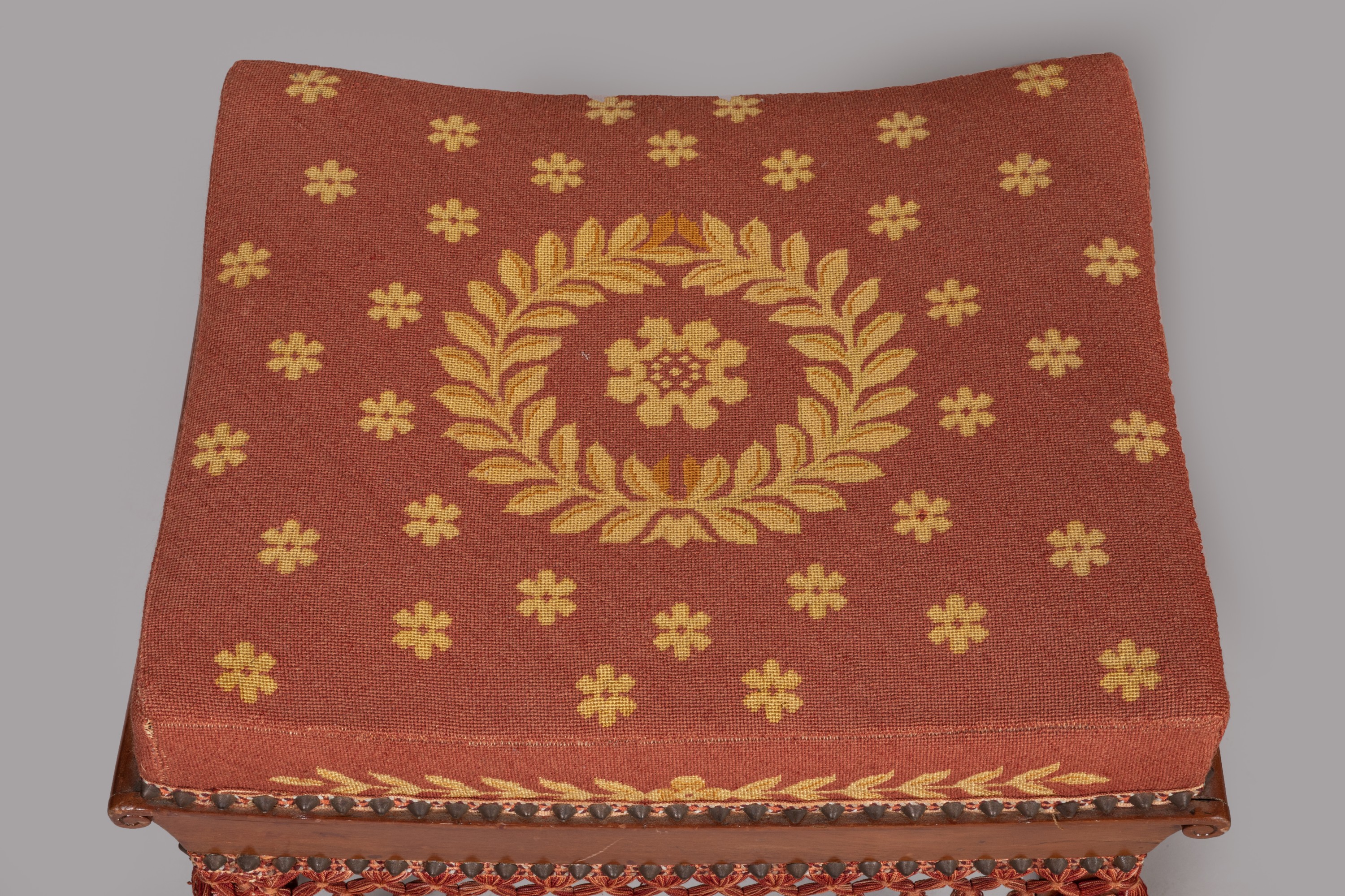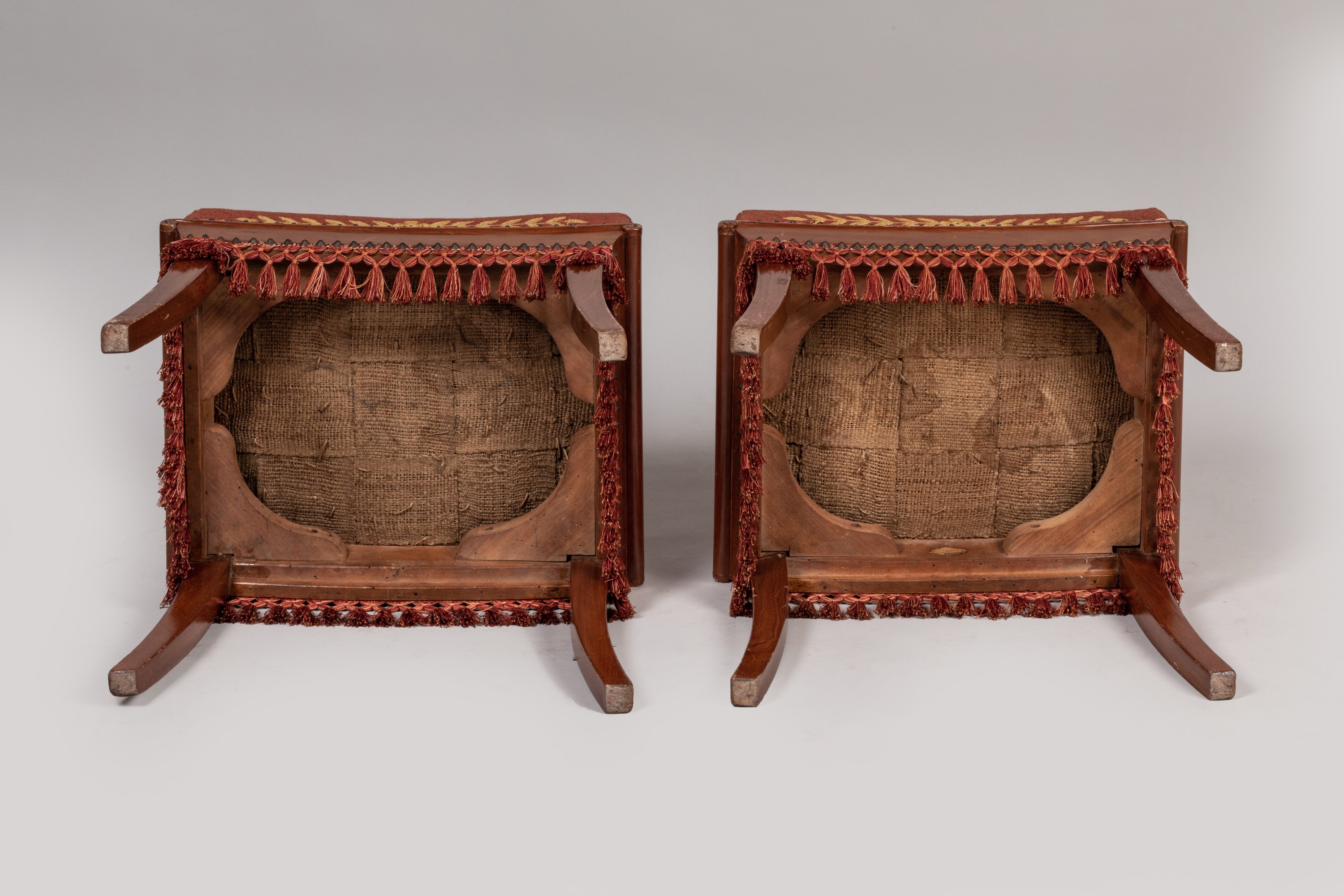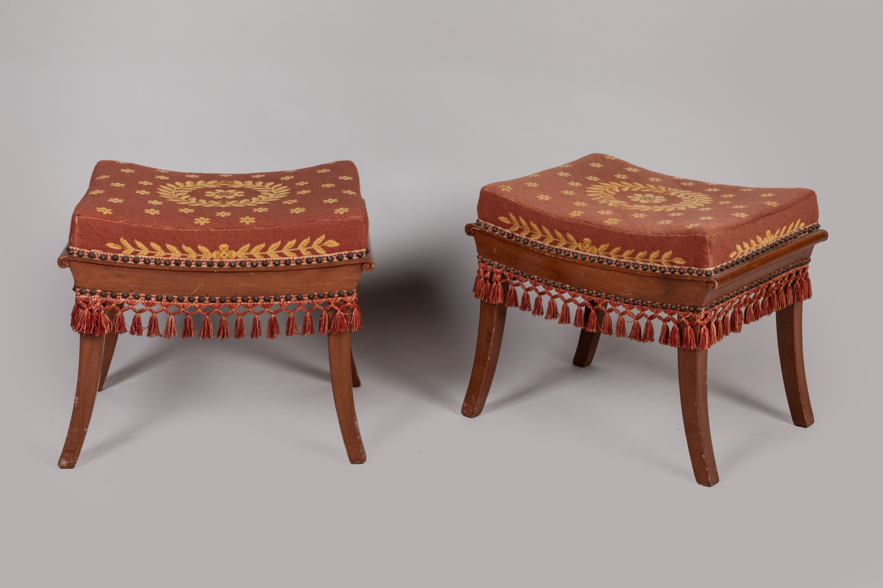 A pair of First Empire mahogany wood and veneer stools. Subsequent tapestry upholstery.