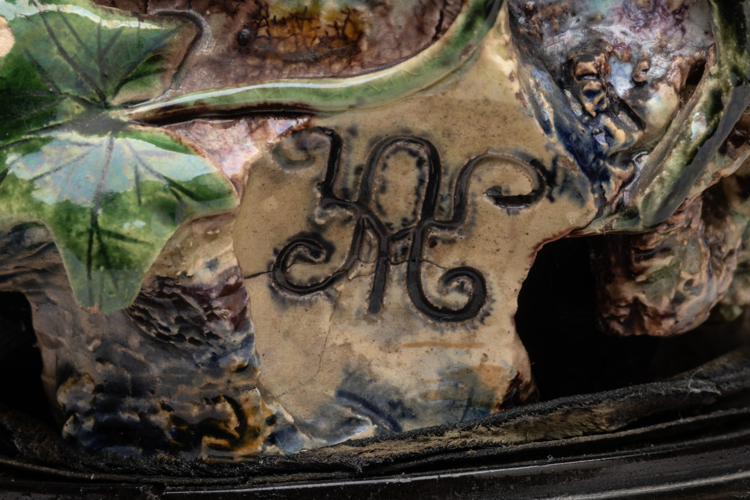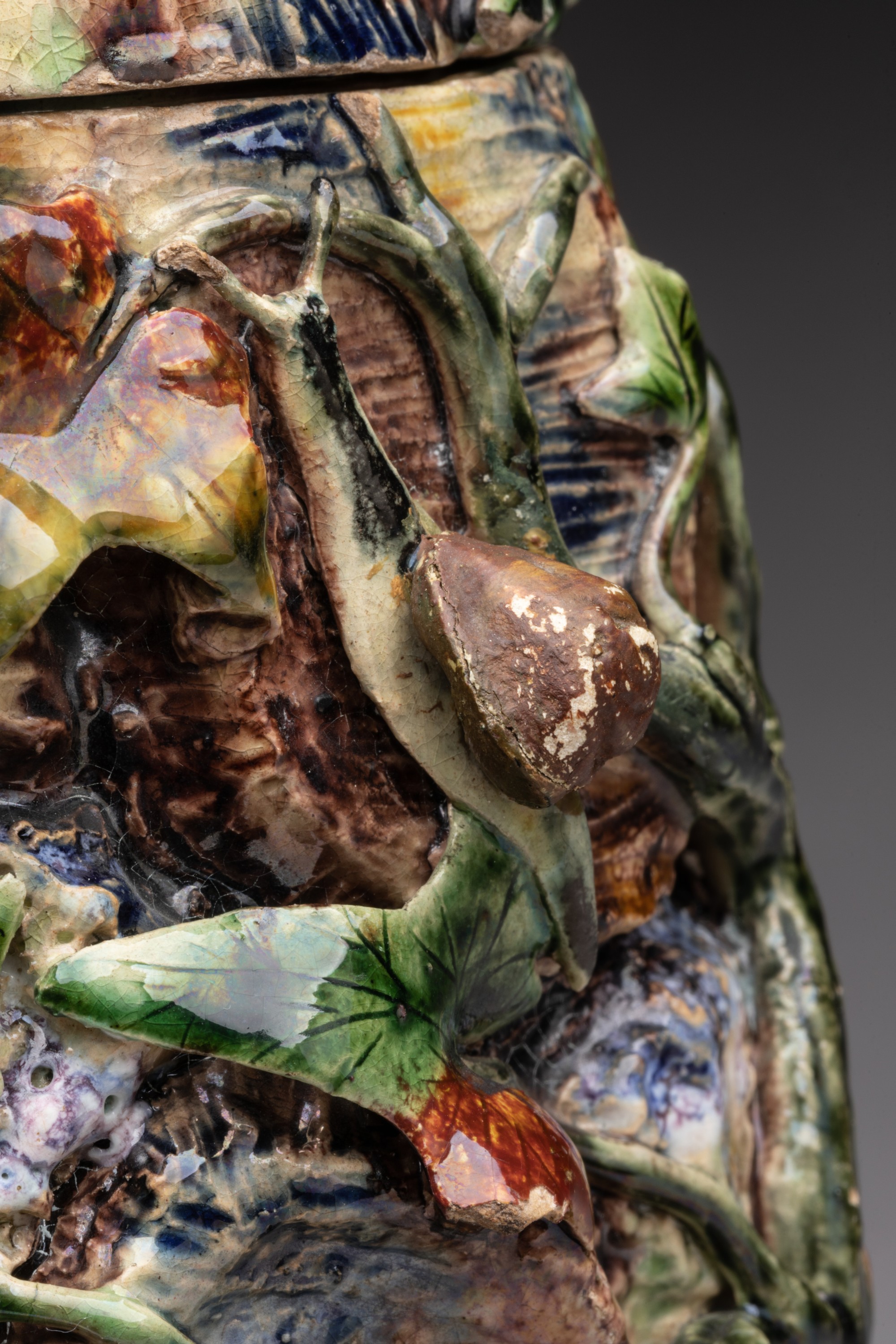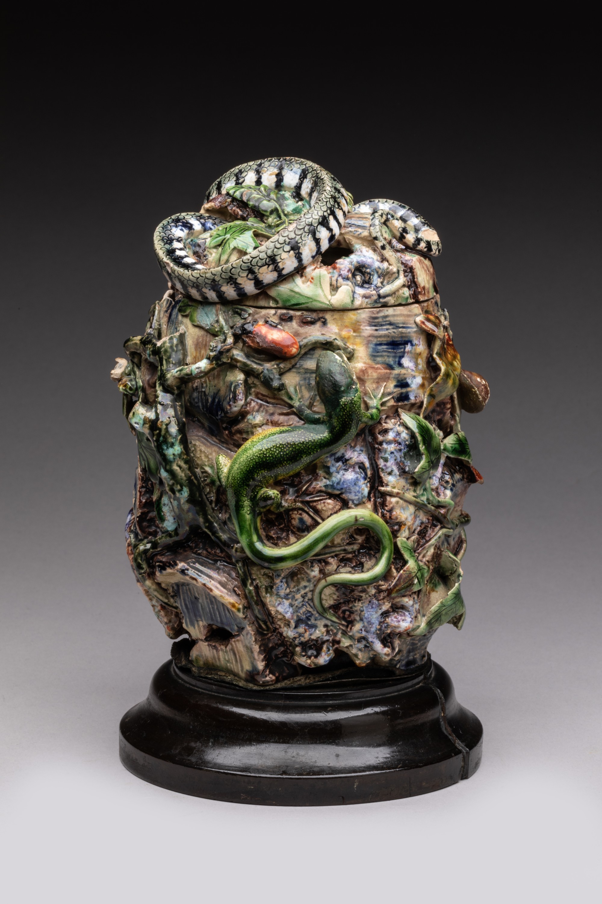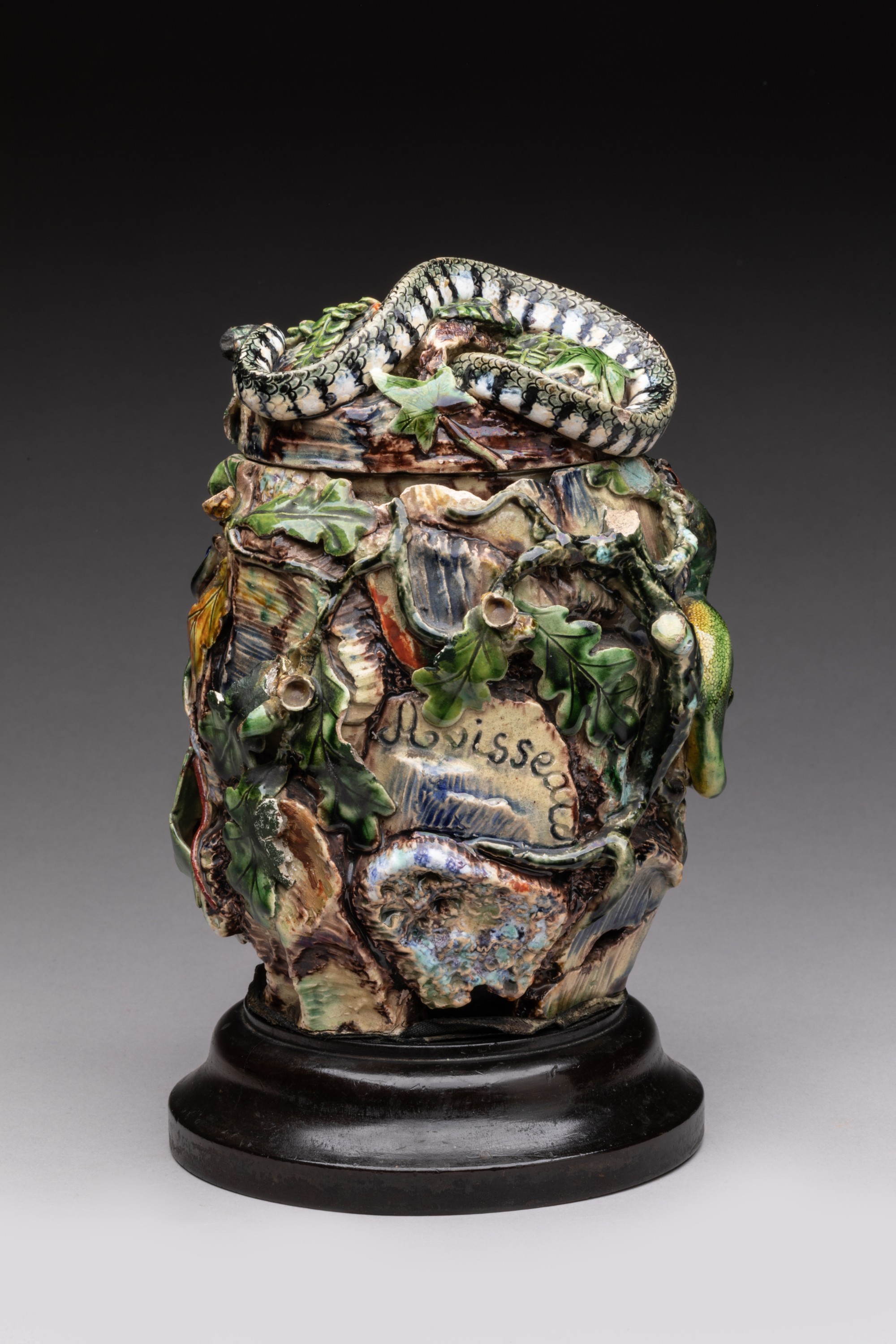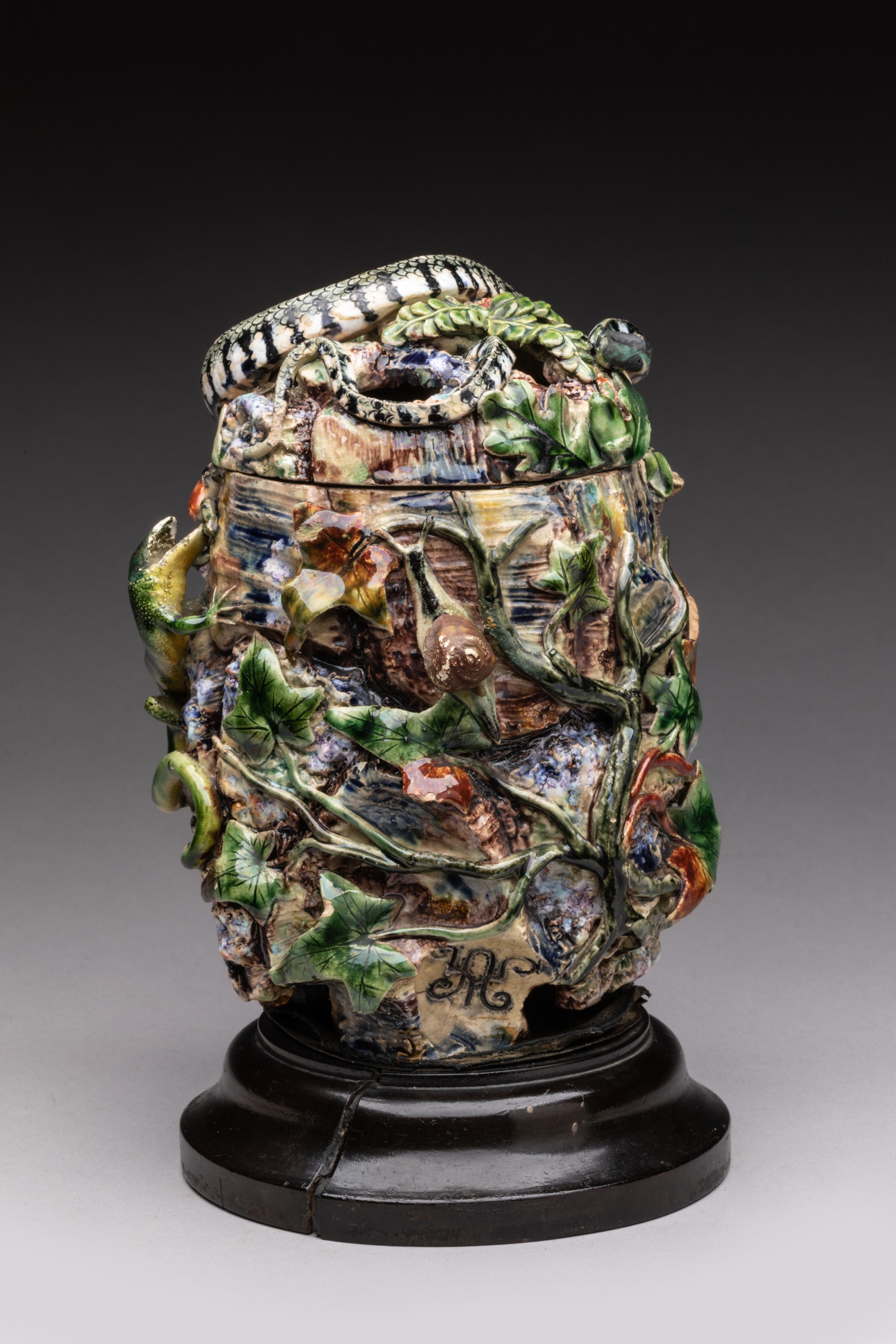 Notre pot à tabac suggère, comme au temps de Palissy, une "atmosphère étrange d'un ensemble complexe, lieu de dialogue entre la nature et l'art". Avec sa fonction utilitaire, il est un exemple rare de ces fabuleux groupes rustiques traités en ronde-bosse qui "ne sont pas très nombreux". Une souche dans le même esprit que notre tonneau, datée 1849, est conservée au Musée national de céramique à Sèvres (inv. MNC10480).