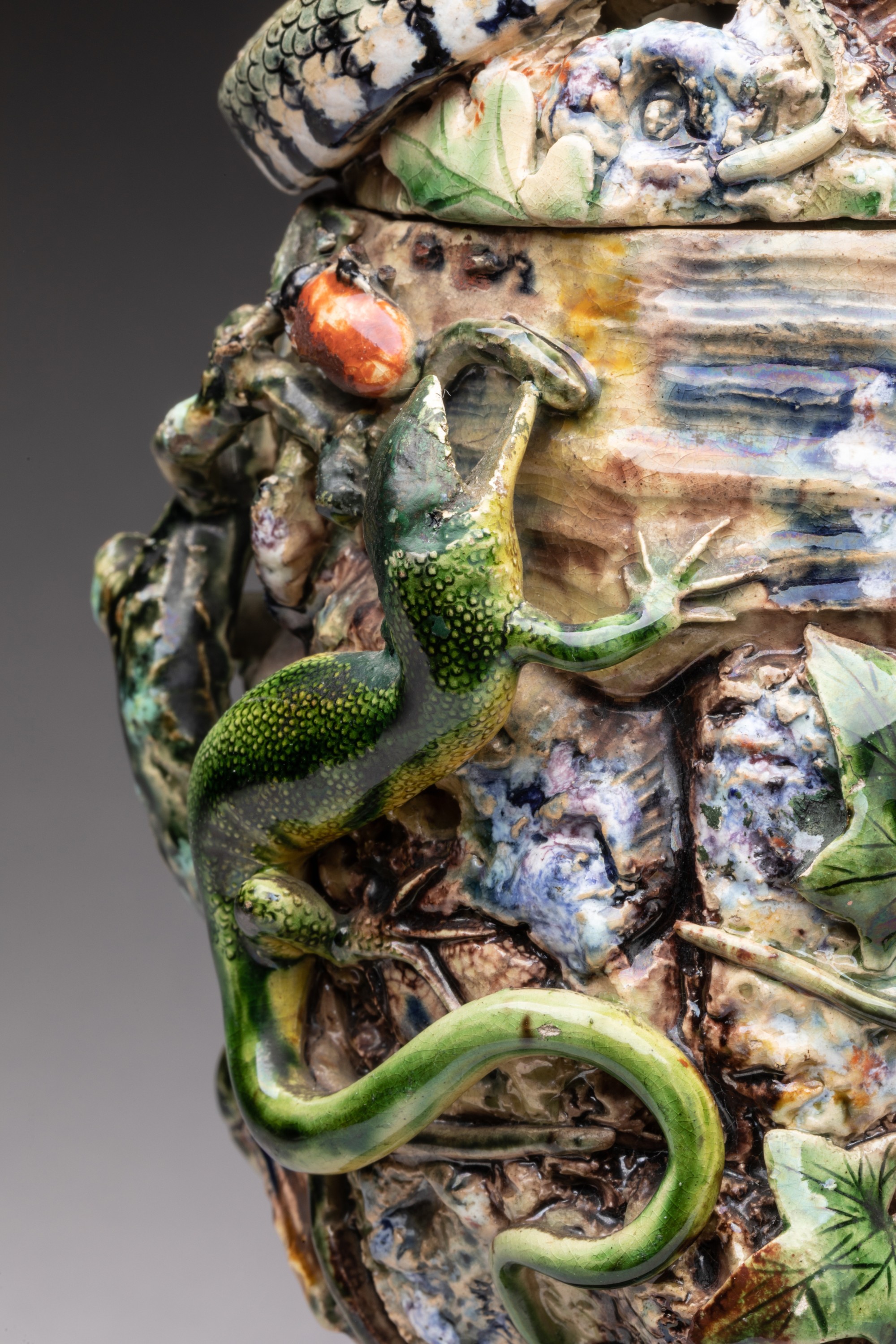 en faïence émaillée polychrome au naturel figurant un tonneau appliqué de "rustiques figulines": couleuvre, lézard et escargot. L'intérieur à trois couleurs.