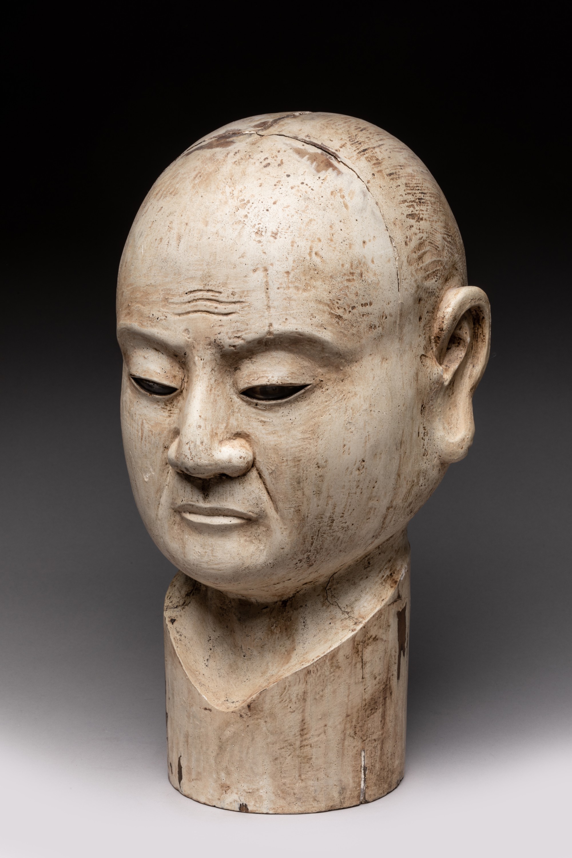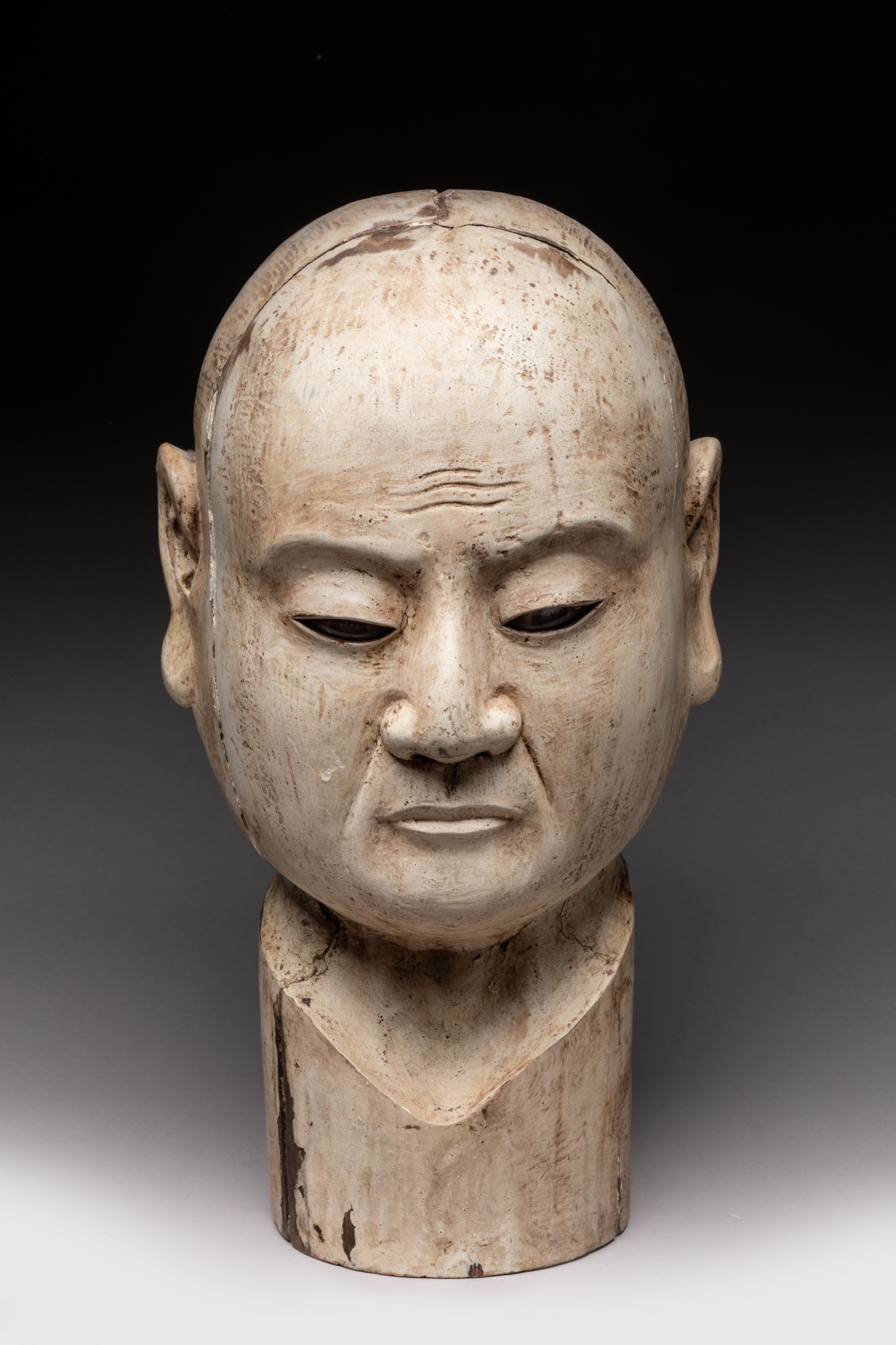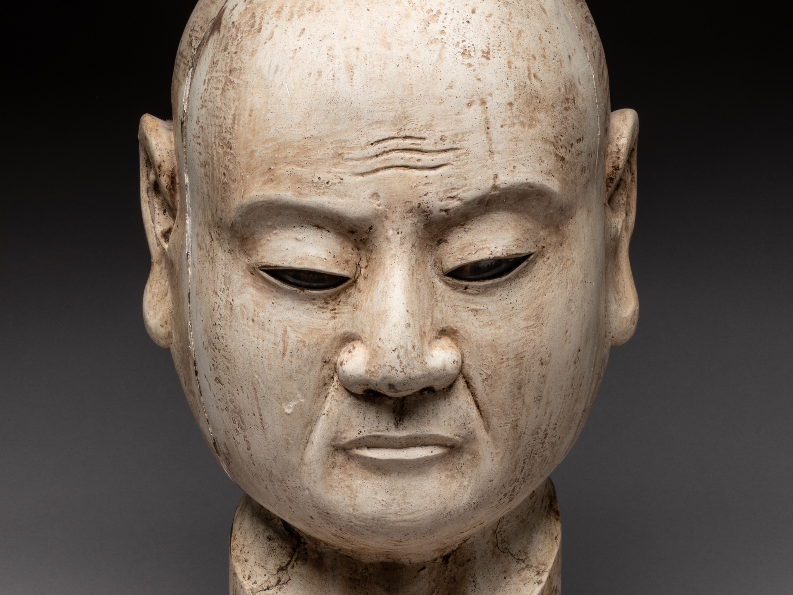 Kamakura period lacquered cypress monk's head, rock crystal eyes. Japan, 13th century.