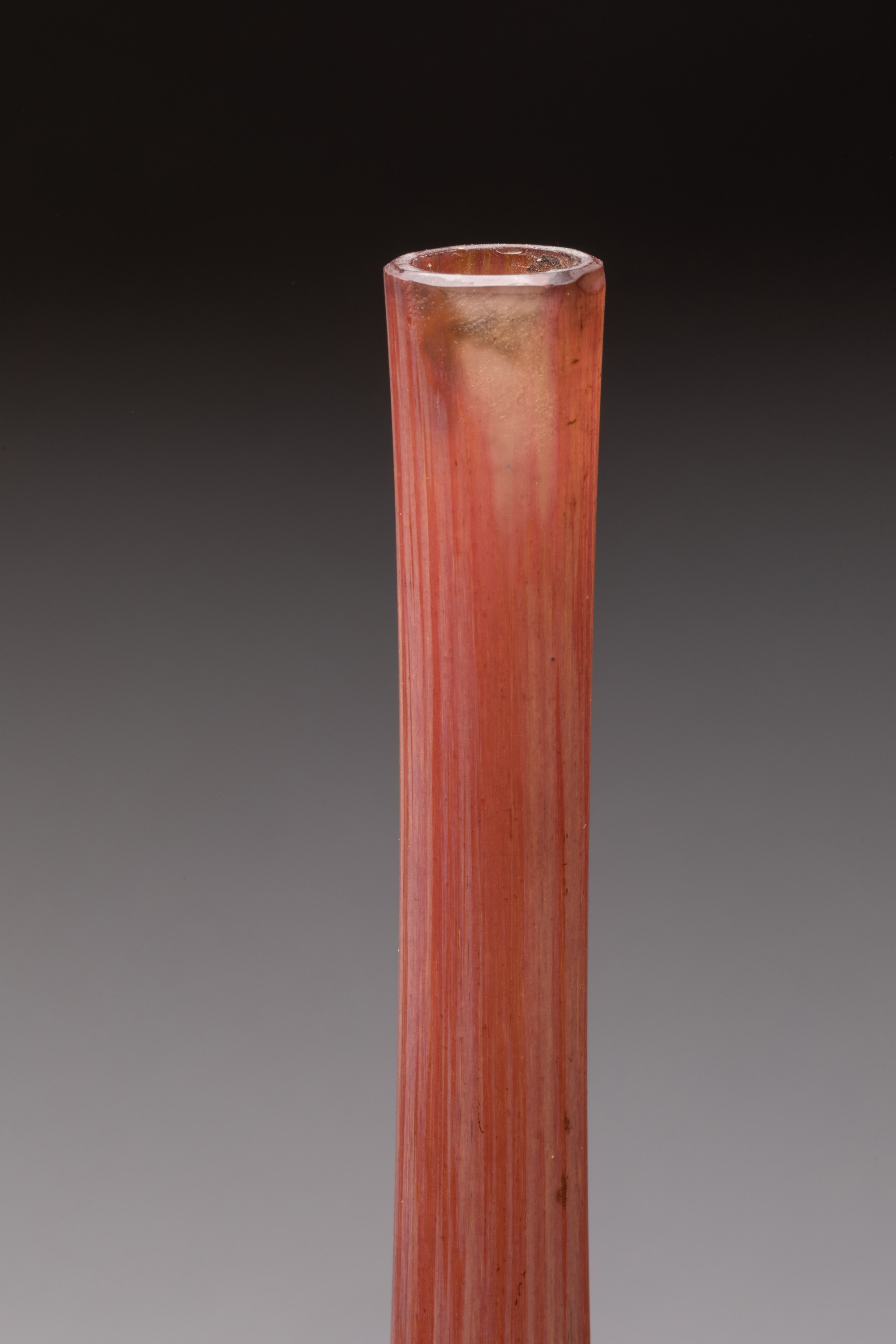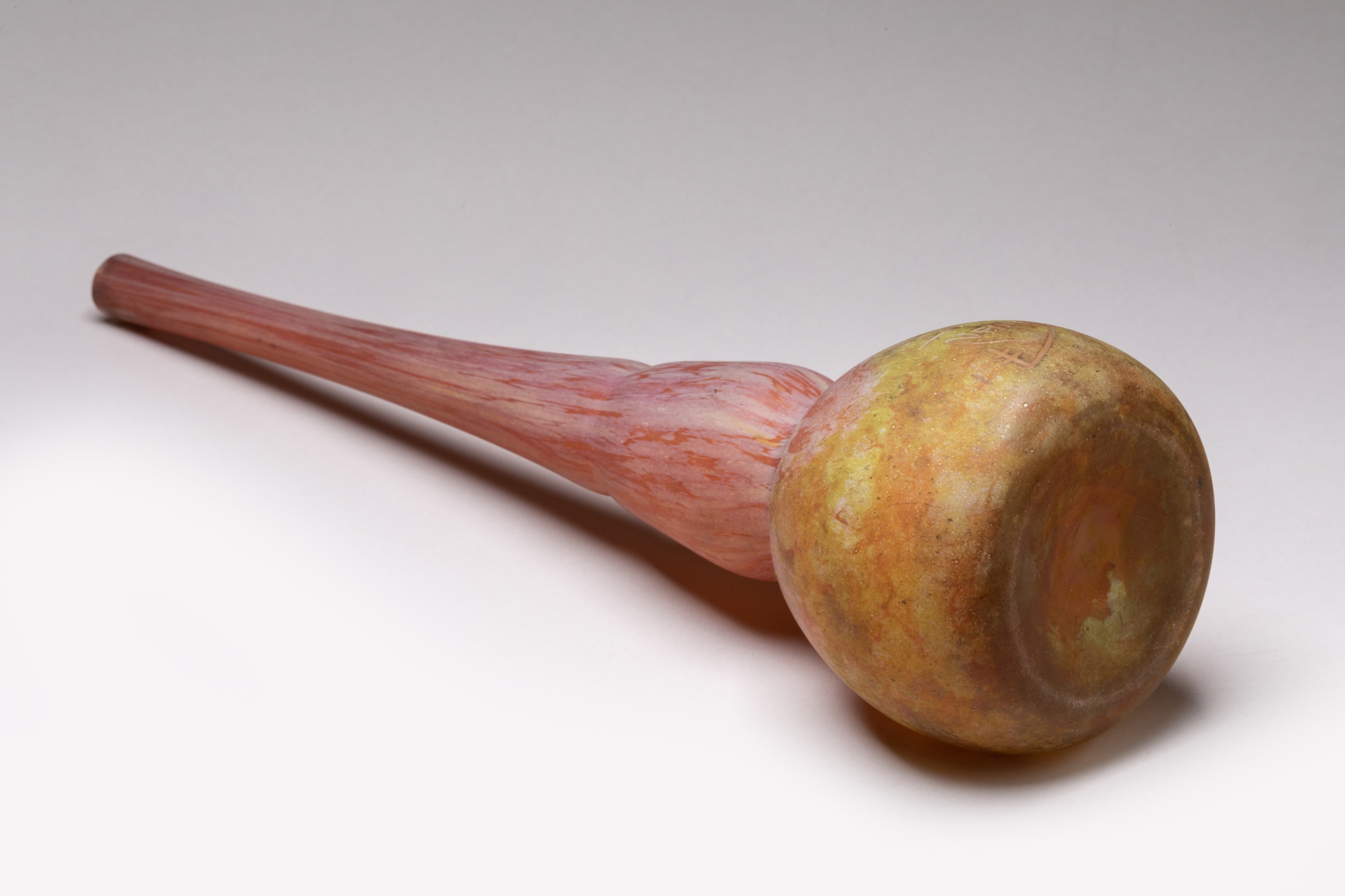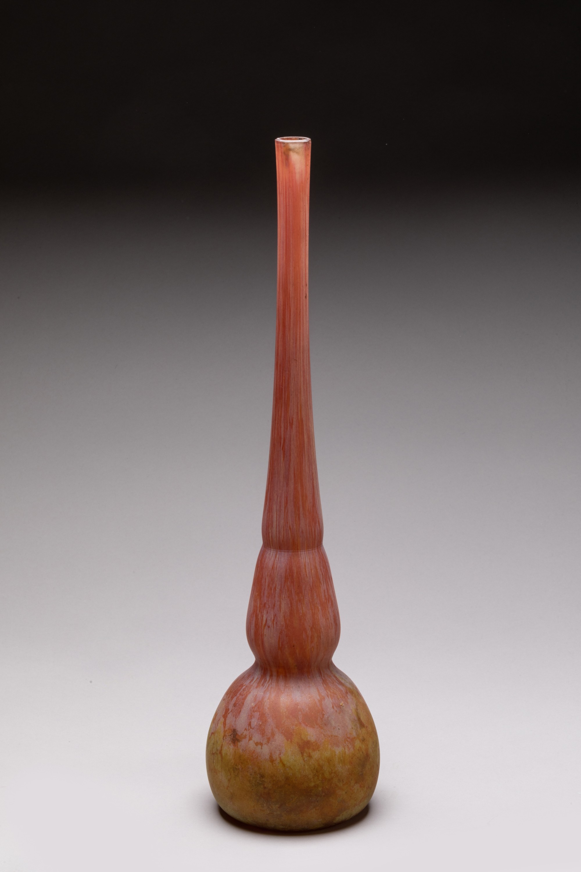 Daum gourd-form glass vase with tall, cylindrical neck in marbled orange and yellow hues.