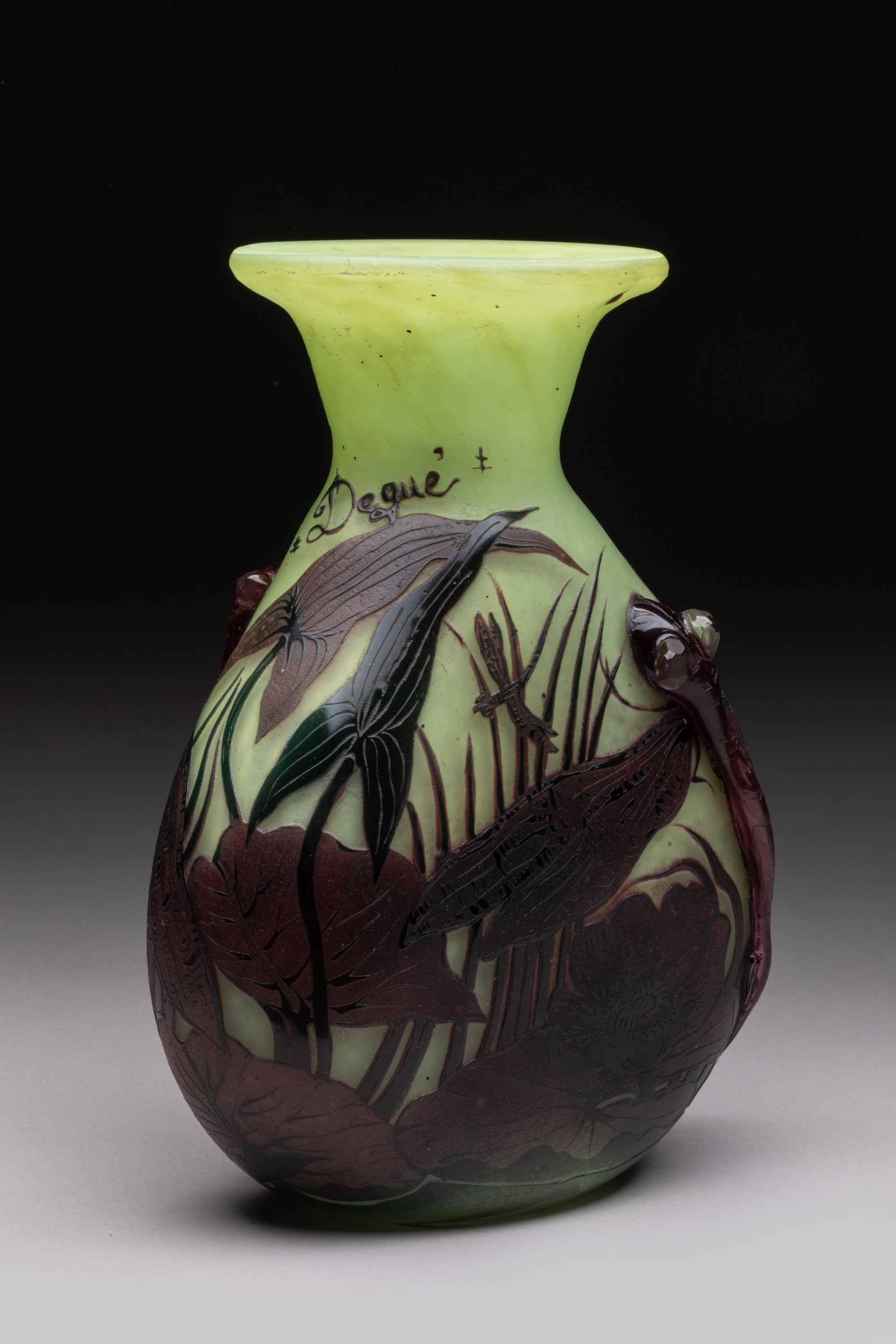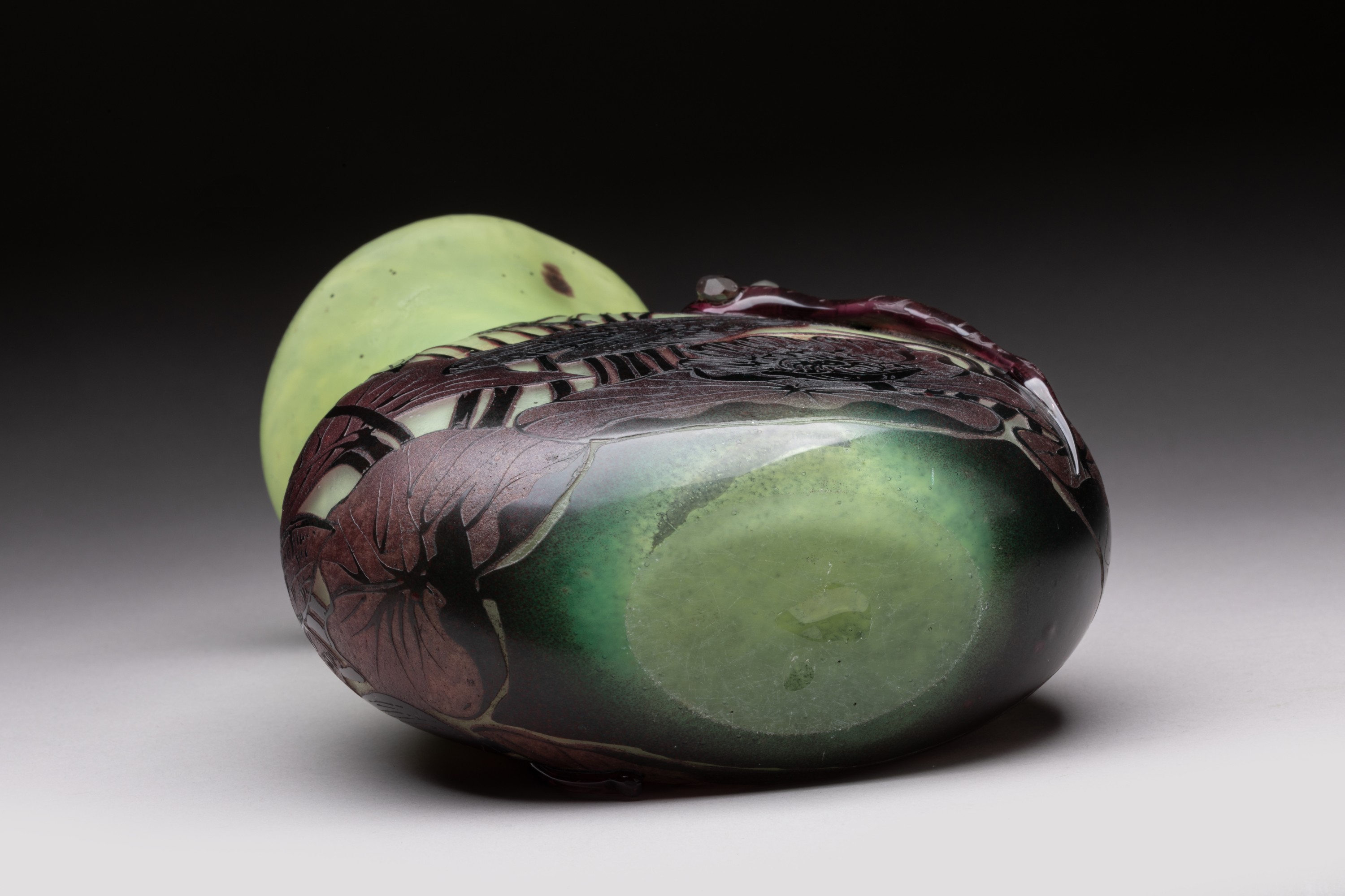 A Degué brown and green gourd-shaped cameo glass vase, acid-etched and overlaid with dragonflies.