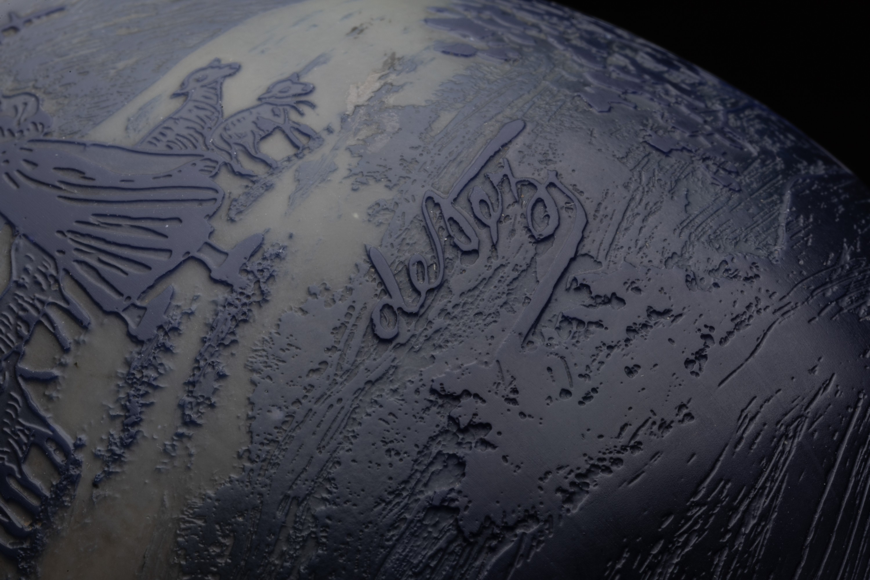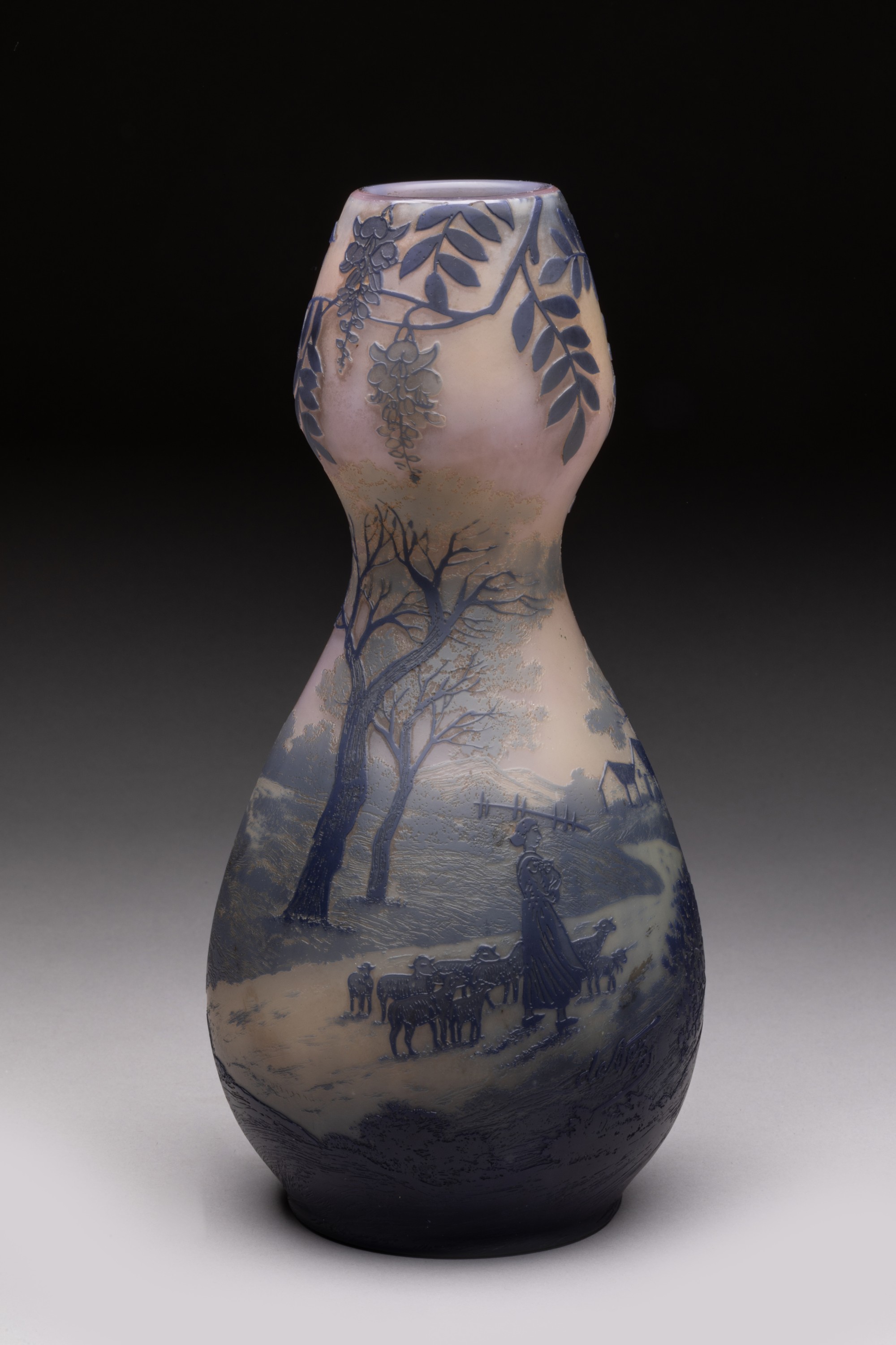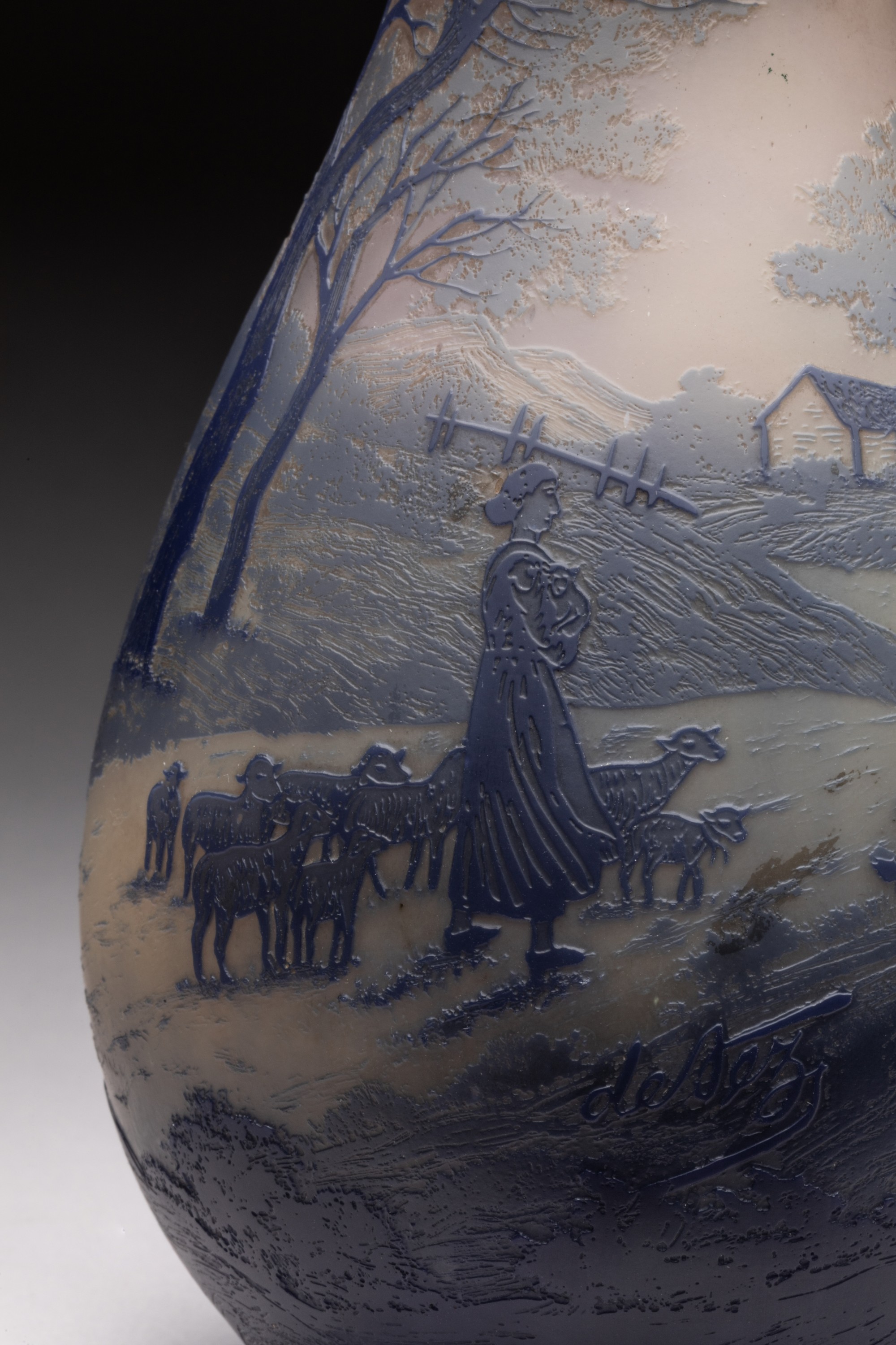 A Devez cameo glass baluster vase figuring a Joan of Arc-like young shepherd leading her flock on a small country road.