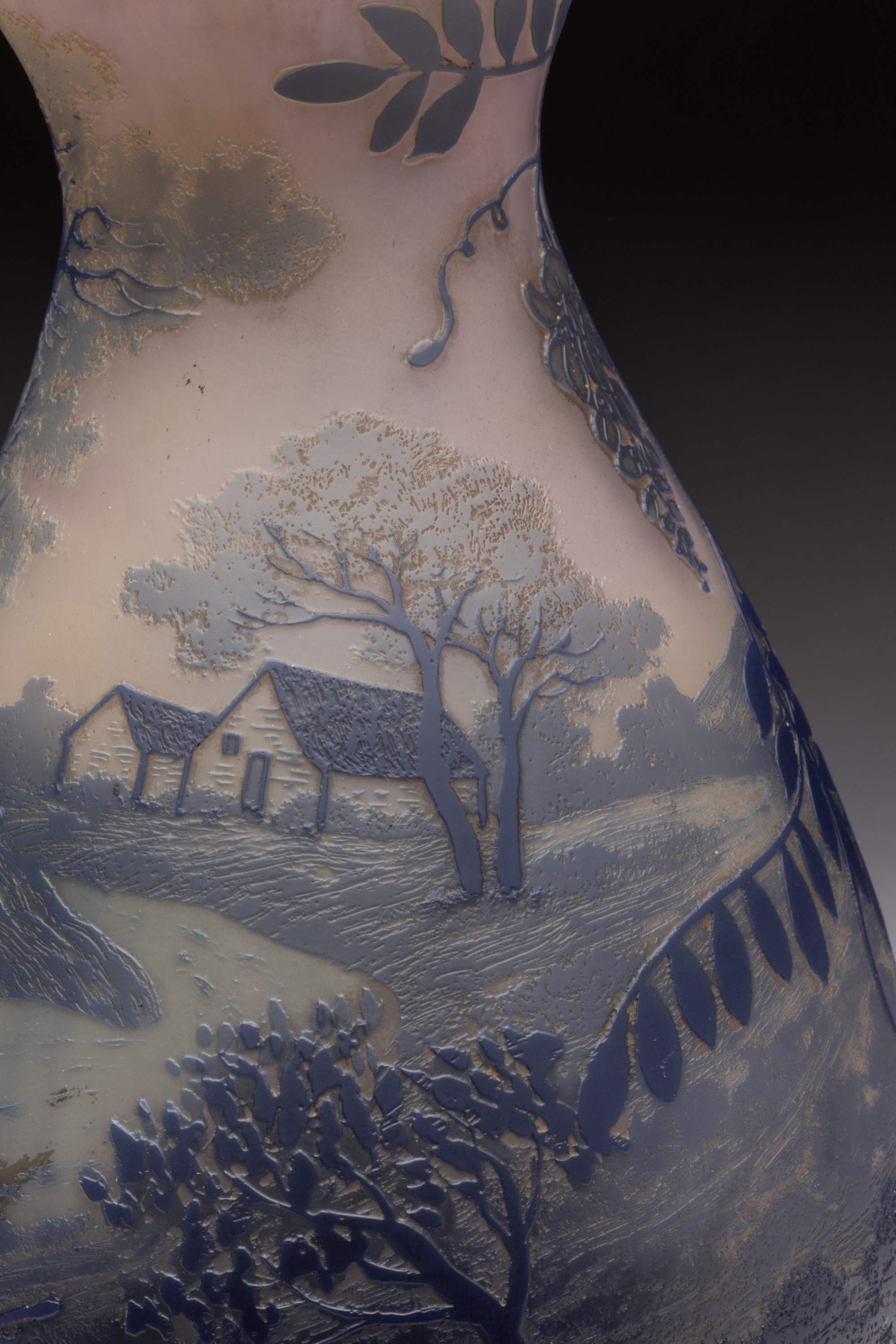 Verre multicouche à décor d'un chemin de campagne où une jeune bergère mène son troupeau, évocation de Jeanne d'Arc. Au premier plan une branche de glycine, au fond un corps de ferme.