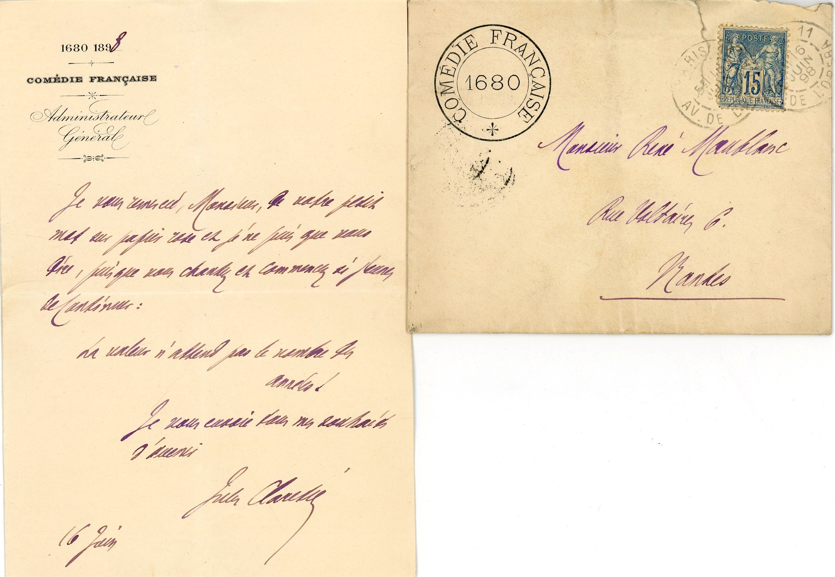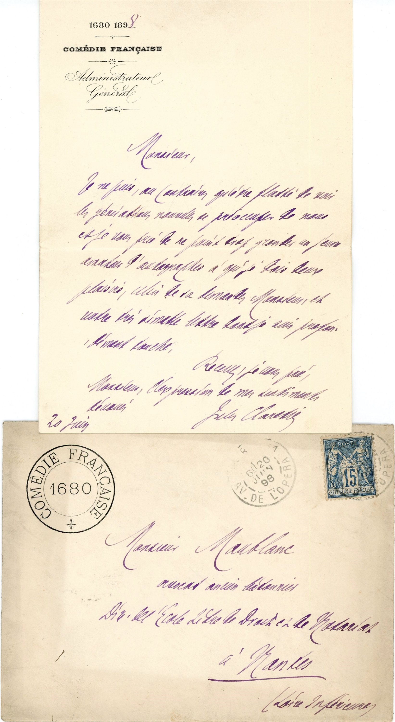 2 L.A.S., 16 et 20 juin 1898, entête « Comédie Française » avec enveloppes, adressées à Georges et à René Maublanc: