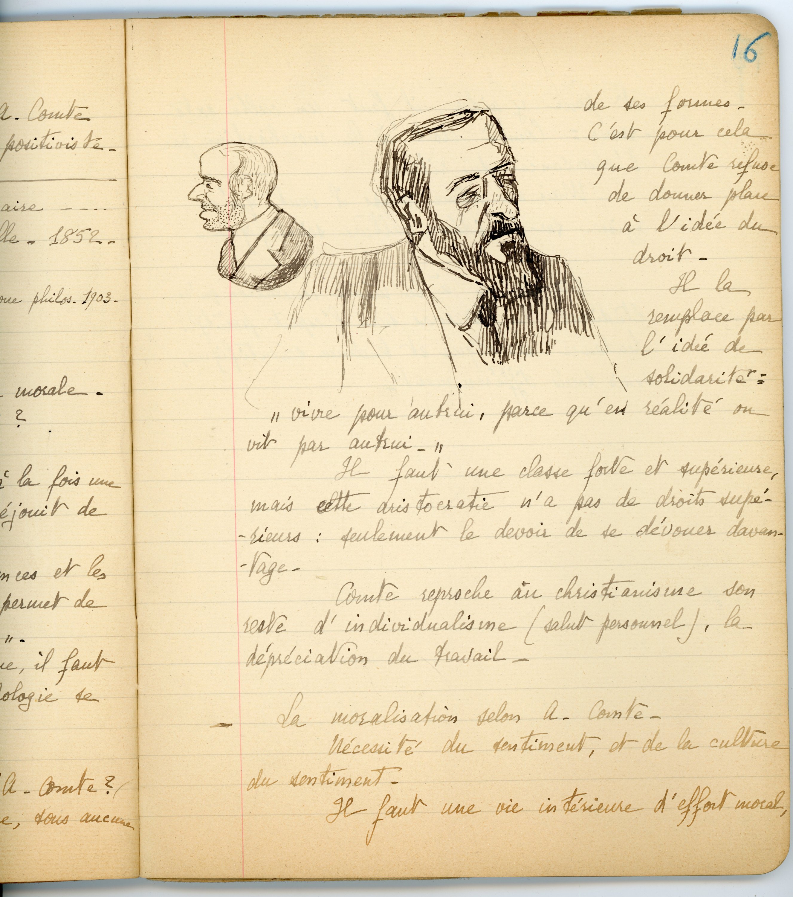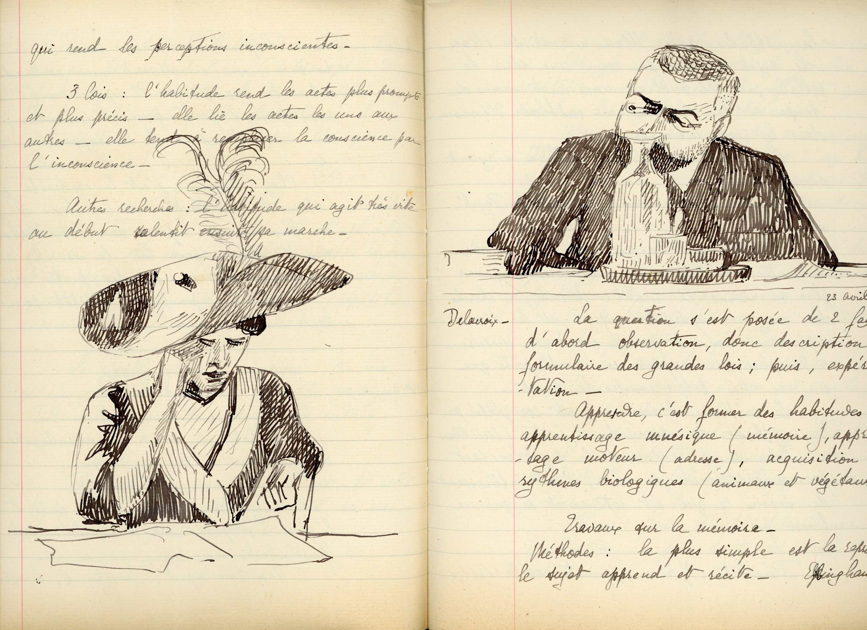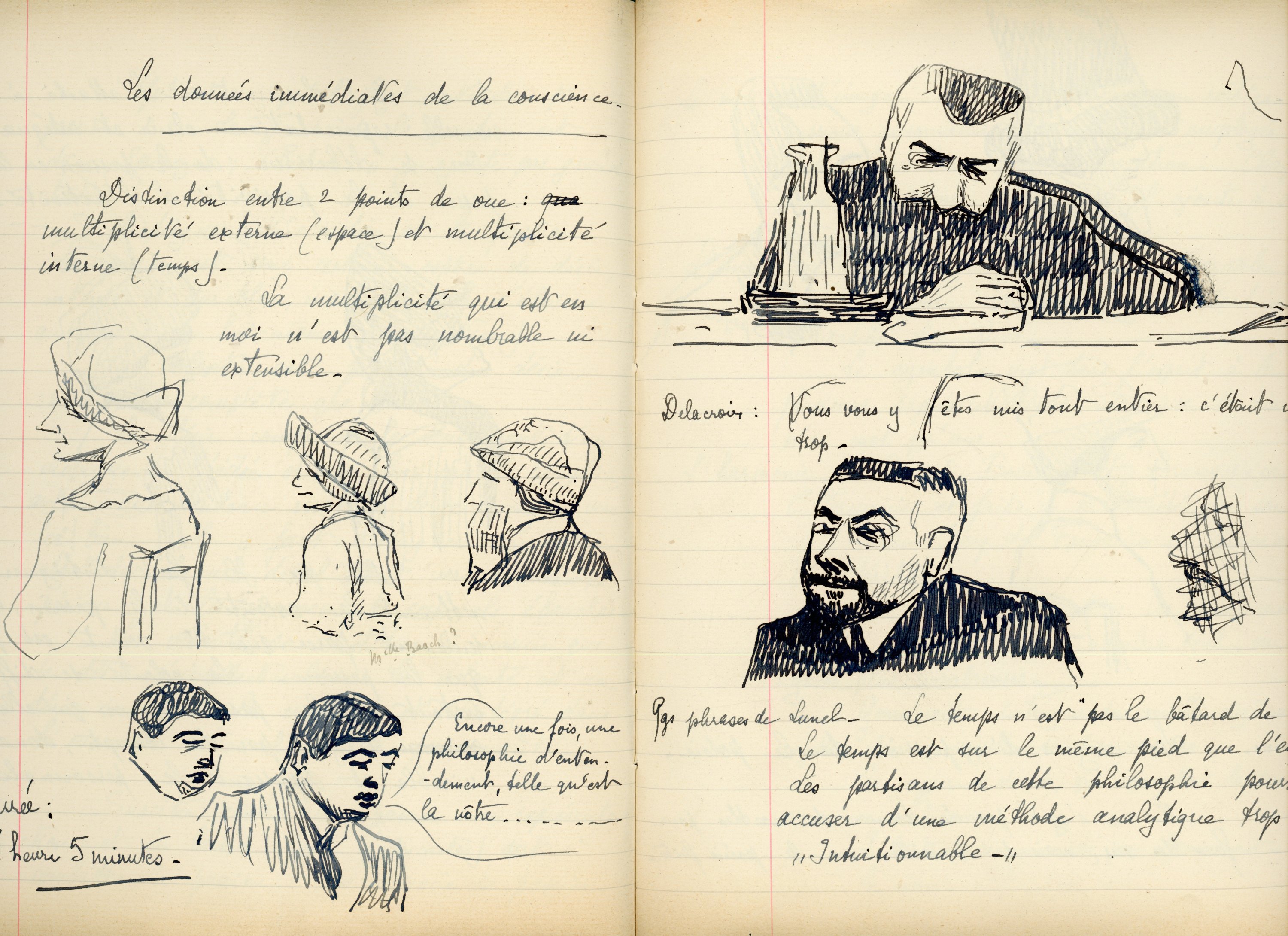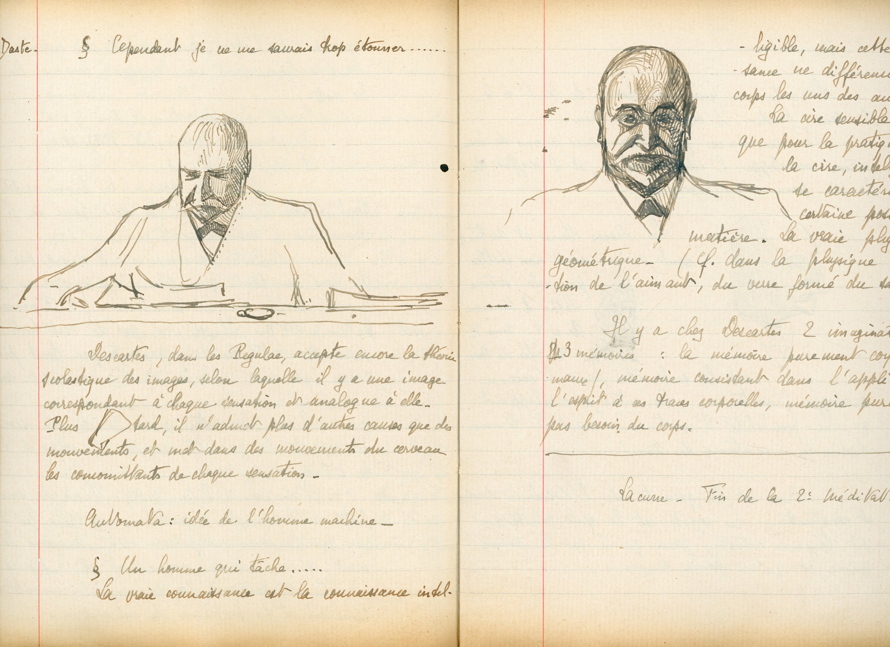 - 18 cahiers de notes prises lors de conférences et de cours magistraux, in-4, tous titrés en couverture, la plupart illustrés par les portraits des intervenants ou camarades croqués à l'encre par René Maublanc (Célestin Bouglé, Victor Delbos, Lucien Lévy-Bruhl, Henri Bergson, Gaston Milhaud, Emile Durkheim, Henri Delacroix, Mademoiselle Daste, Jean Guéhenno, etc) ;