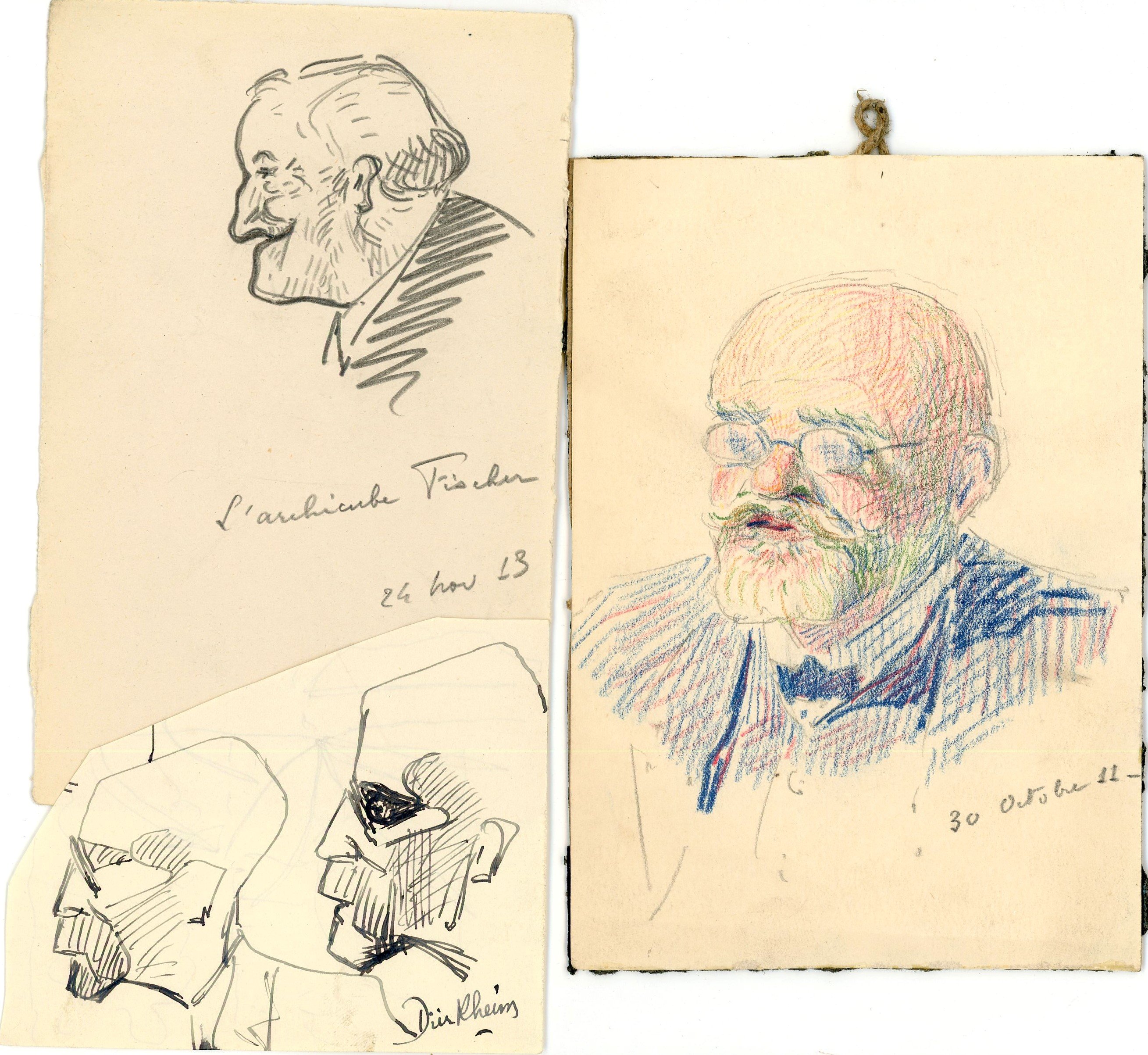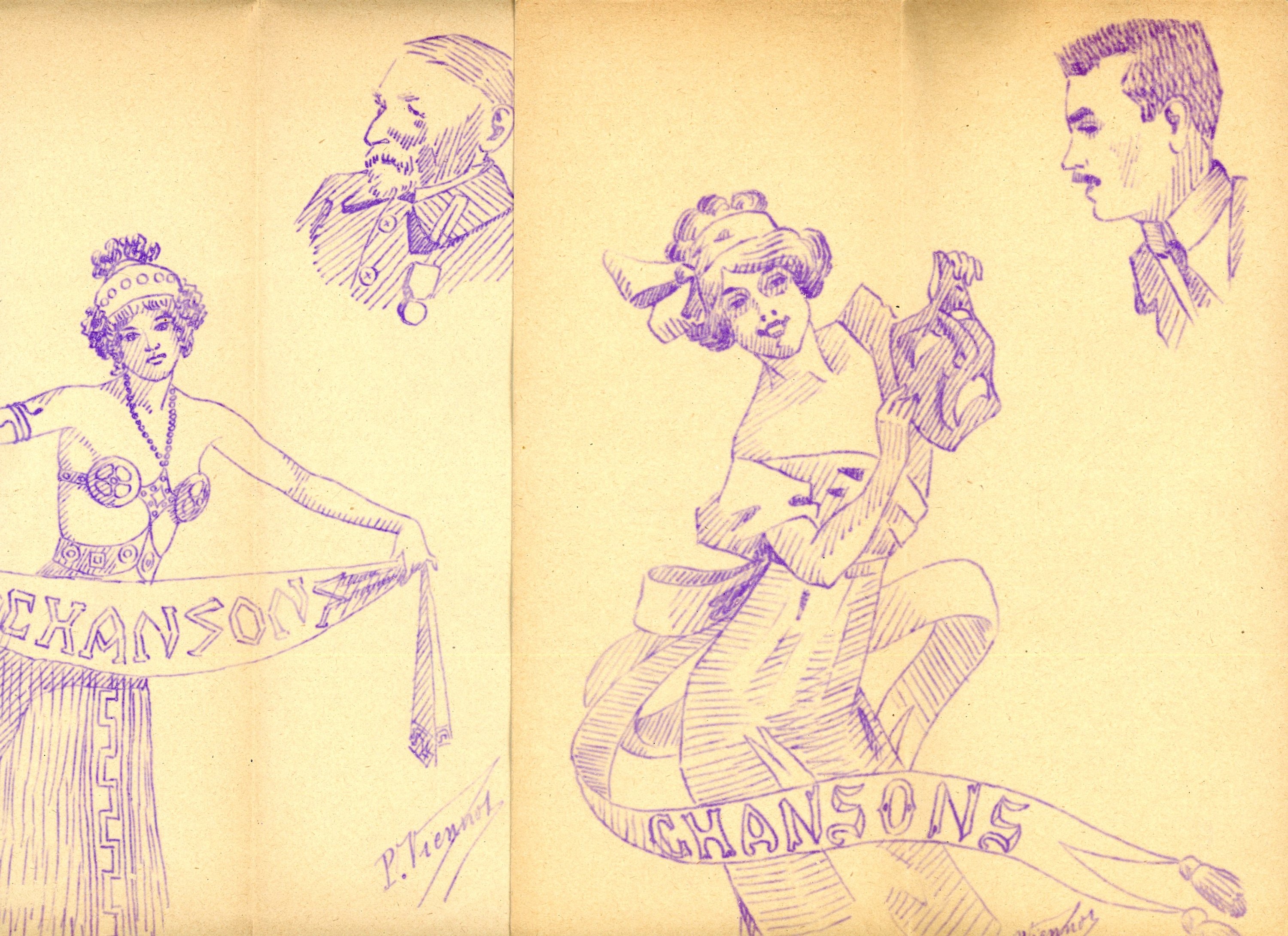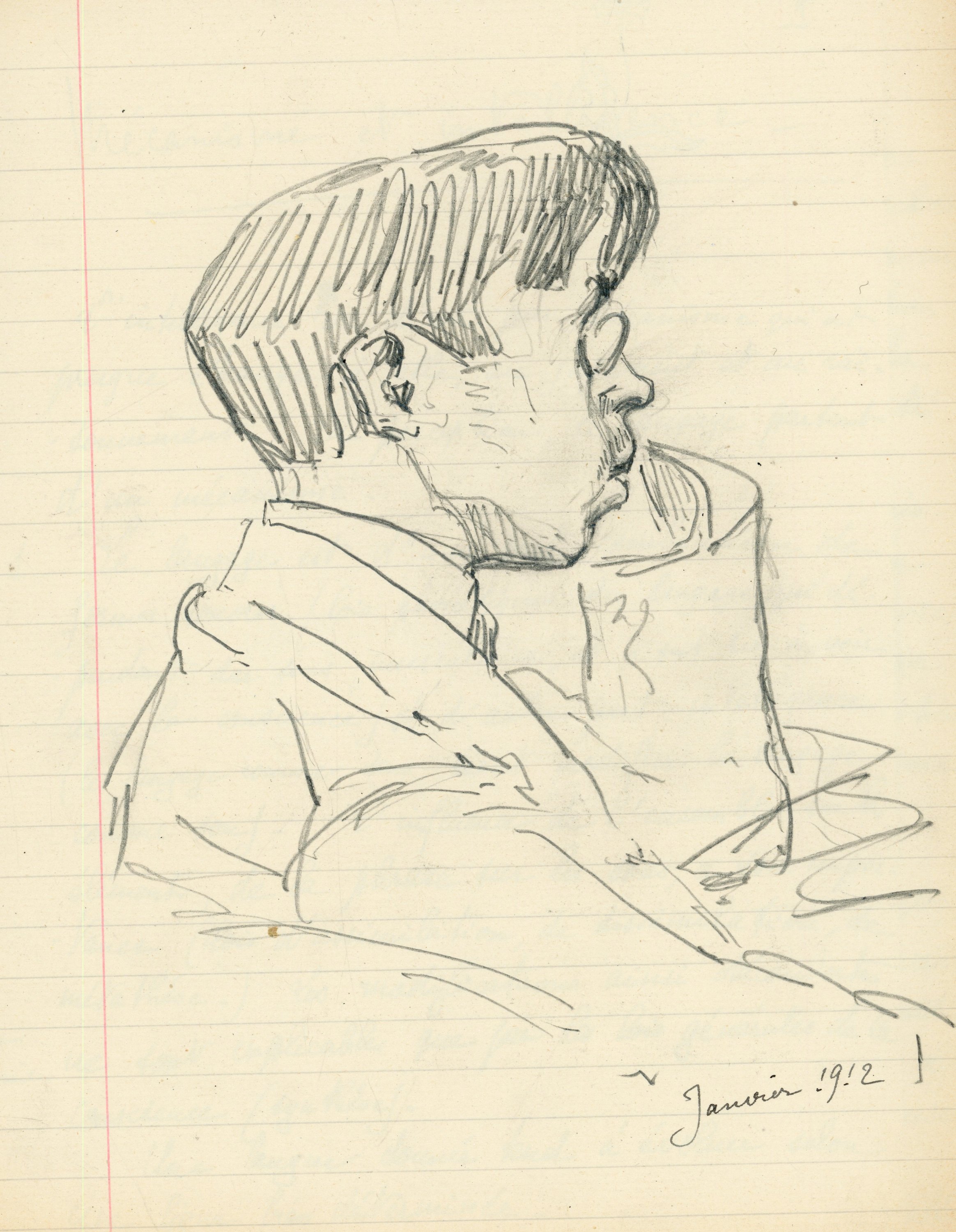 - Croquis à la plume par R.M. de divers personnages de lENS (Beaumont, Dupuy, le père Fisher), notamment croqué au cours de linstruction militaire surnommée « Le Bonvoust »; et brouillons de croquis et programme confectionné par R.M. pour des représentations théâtrales à lENS (Les comptes fantastiques, Les Jocondes, Agathon rompu).