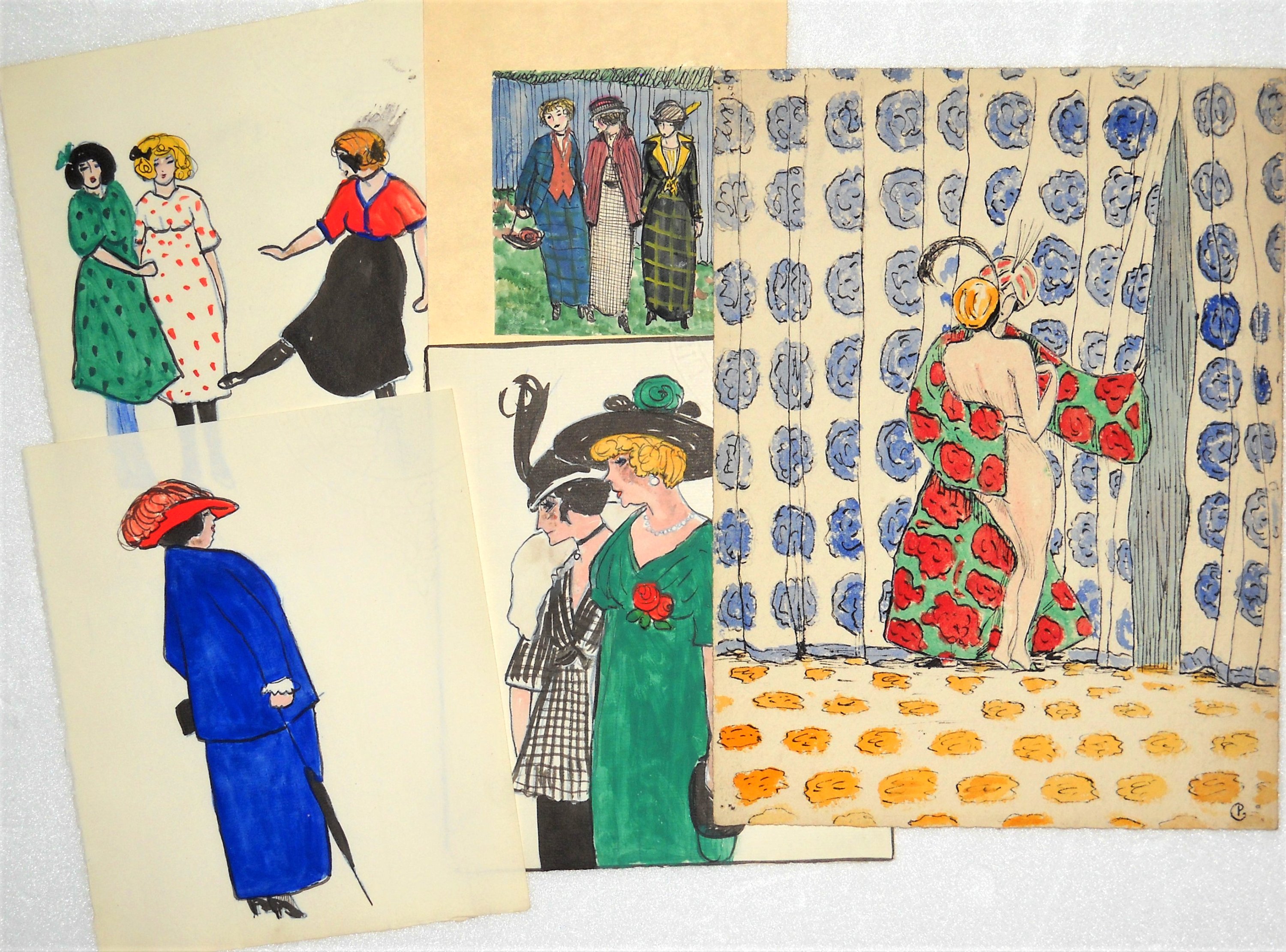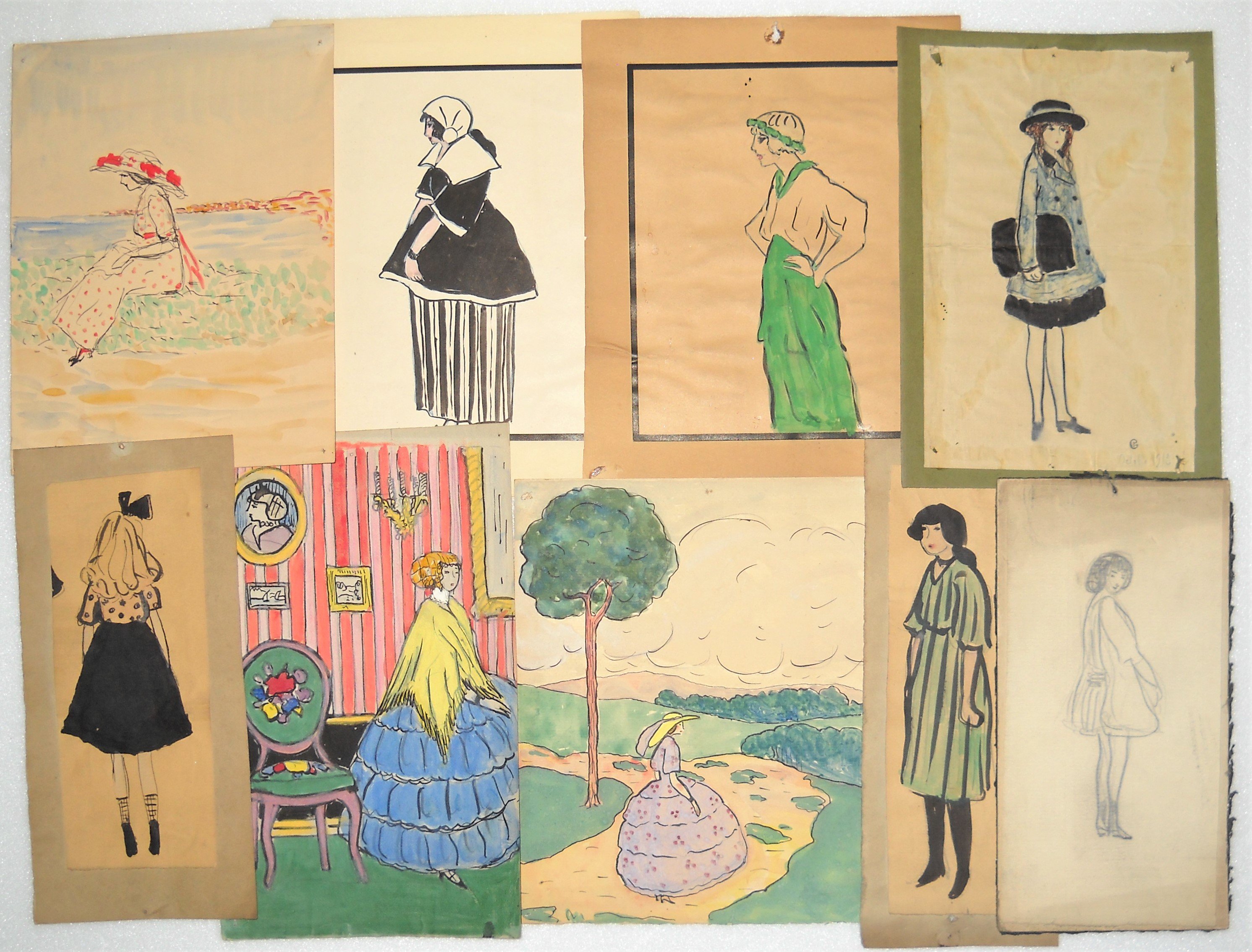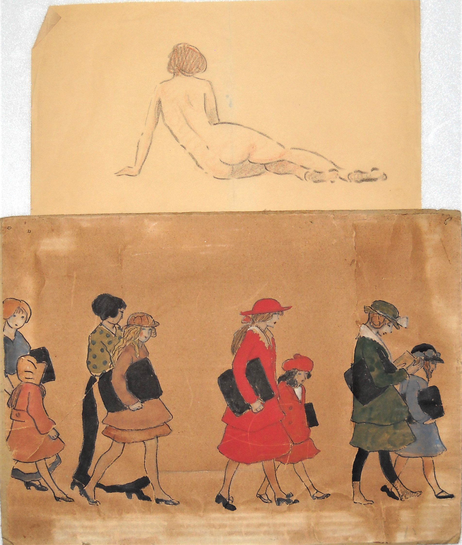 - Lot de + de 100 croquis et dessins au crayon, plume, certains rehaussés à laquarelle, réalisés par Pierre Garreta entre 1910 et 1914, rassemblées dans trois enveloppes destinées à être remises à R.M. en cas de disparition. Garreta portait un regard critique sur la société davant-guerre et une fascination pour le genre féminin dont « Gazette du Bon Ton, arts modes frivolités » ; « Pèlerinage à laumône » ; « Nus et nus habillés » ; 2 carnets de croquis dessinés lors de sa mobilisation en 1914 ; portrait au crayon de R.M., 11 février 1911 ; etc ;