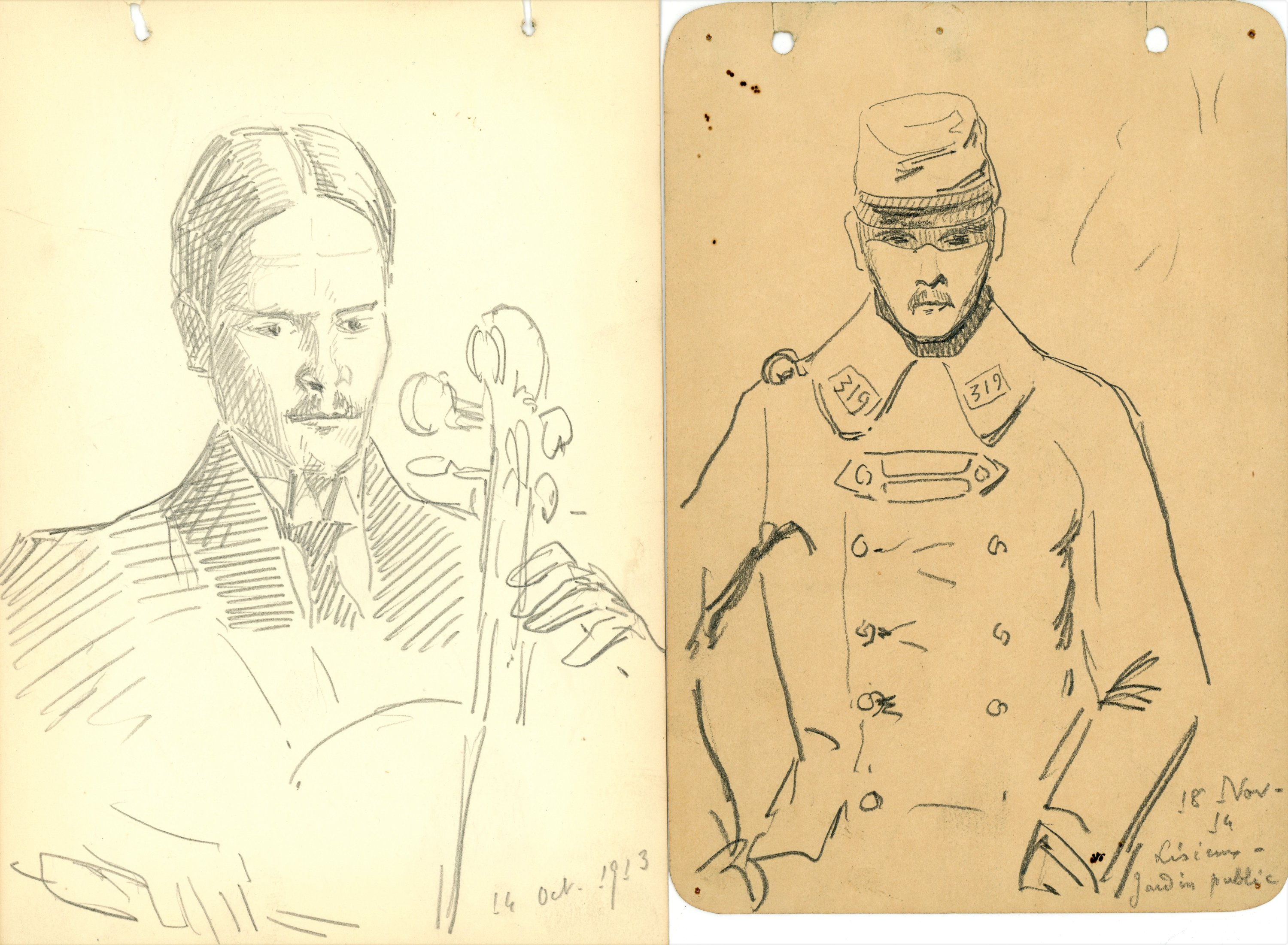 - 2 portraits au crayon par R.M. de Pierre Garreta jouant du violoncelle daté du 24 octobre 1913.