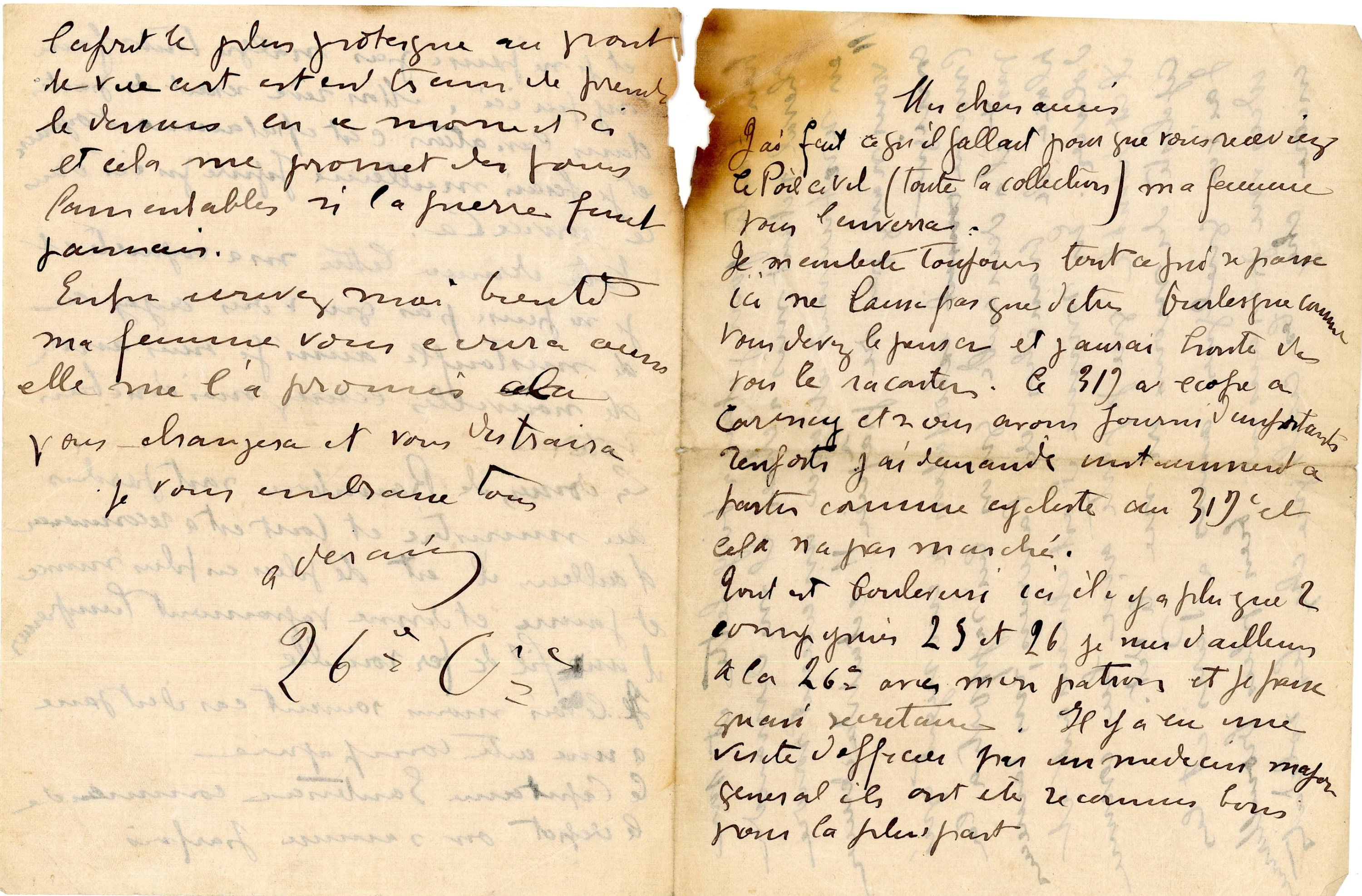 « Mes chers amis jai fait ce quil fallait pour que vous receviez le Poil Civil (toute la collection ma femme vous lenverra. Je membête toujours tout ce qui se passe ici ne laisse pas que dêtre burlesque comme vous devez le penser et jaurai honte de vous le raconter. Le 319e a écopé à Carmey et nous avons fourni dimportants renforts. Jai demandé notamment à partir comme cycliste au 319e et cela na pas marché. Tout est bouleversé ici il ny a plus que 2 compagnies 25 et 26? Je vais dailleurs à la 26e avec mon patron et je passe quasi secrétaire. (