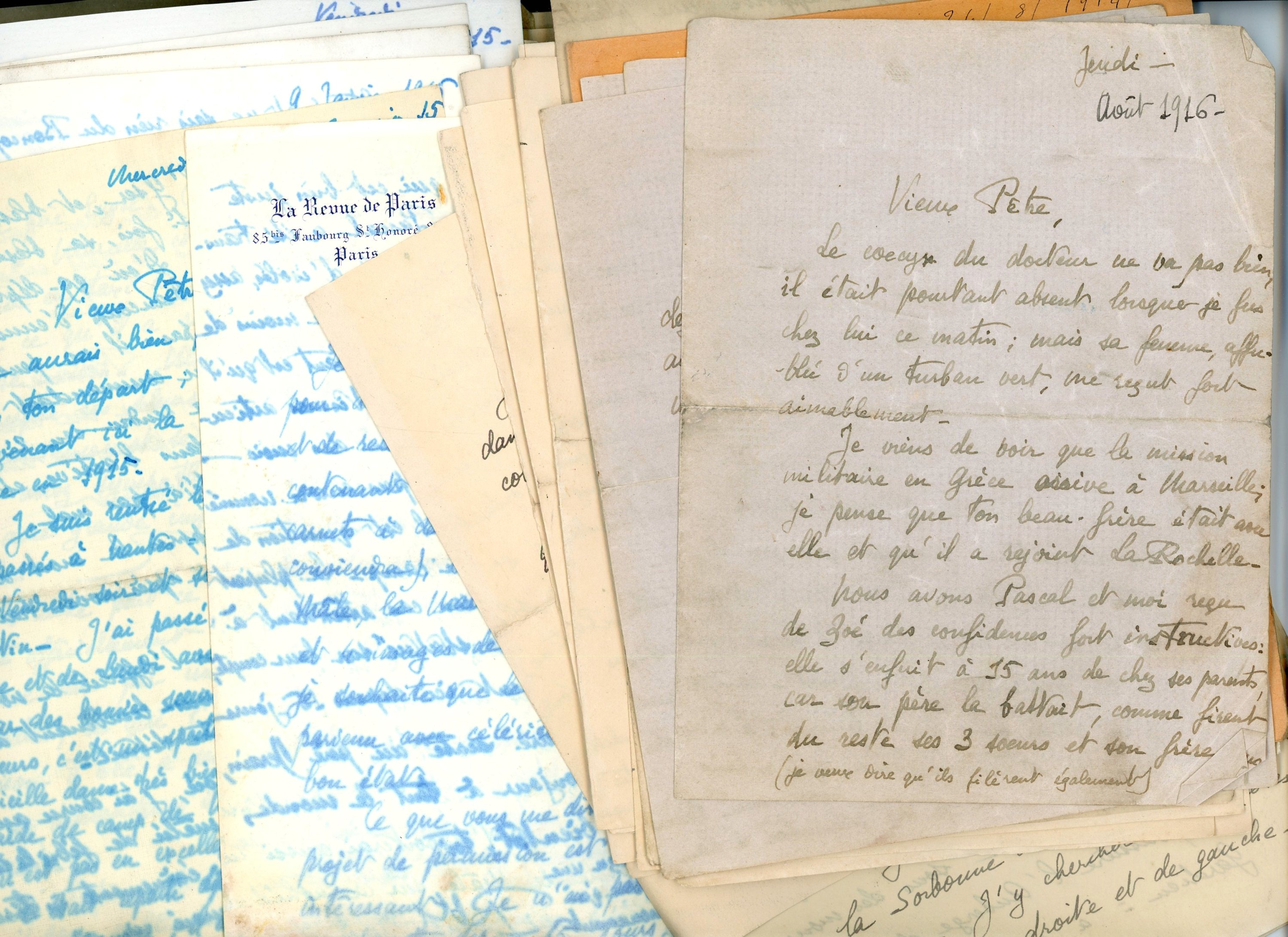 Correspondance en deux parties: env. 70 lettres (en létat, fragiles) écrites entre 1910 et 1914, des différents lieux de villégiature durant les vacances scolaires, puis env. 95 lettres écrites durant la Grande guerre, dans lesquelles Maublanc, resté à Paris jusquau printemps 1915, y relate ses occupations et veille sur la garçonnière de Garreta située au n°10 avenue des Gobelins, quil partageait avec Marcel Canal, et habitée momentanément par Zoé et son bébé, petite amie de Garreta; il donne des nouvelles de tous leurs camarades partis sous les drapeaux (Genevoix, Étévé, Durkheim, Boussac, etc); arrivé en avril 1915 au collège dÉpernay, Maublanc lui décrit aussi bien les paysages de la région que les jeunes élèves auxquels il dispense pour la toute première fois lenseignement de la philosophie et du français.
