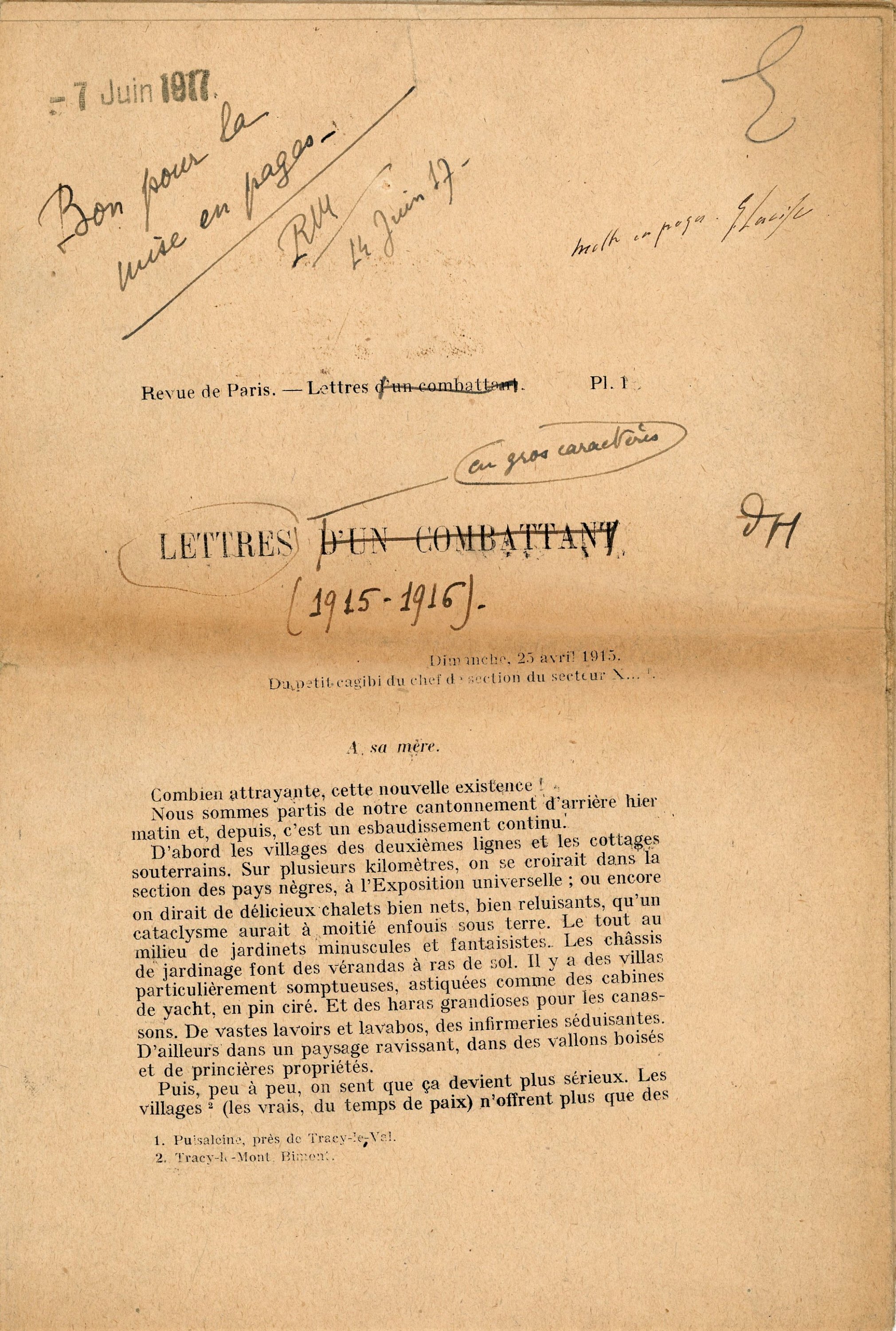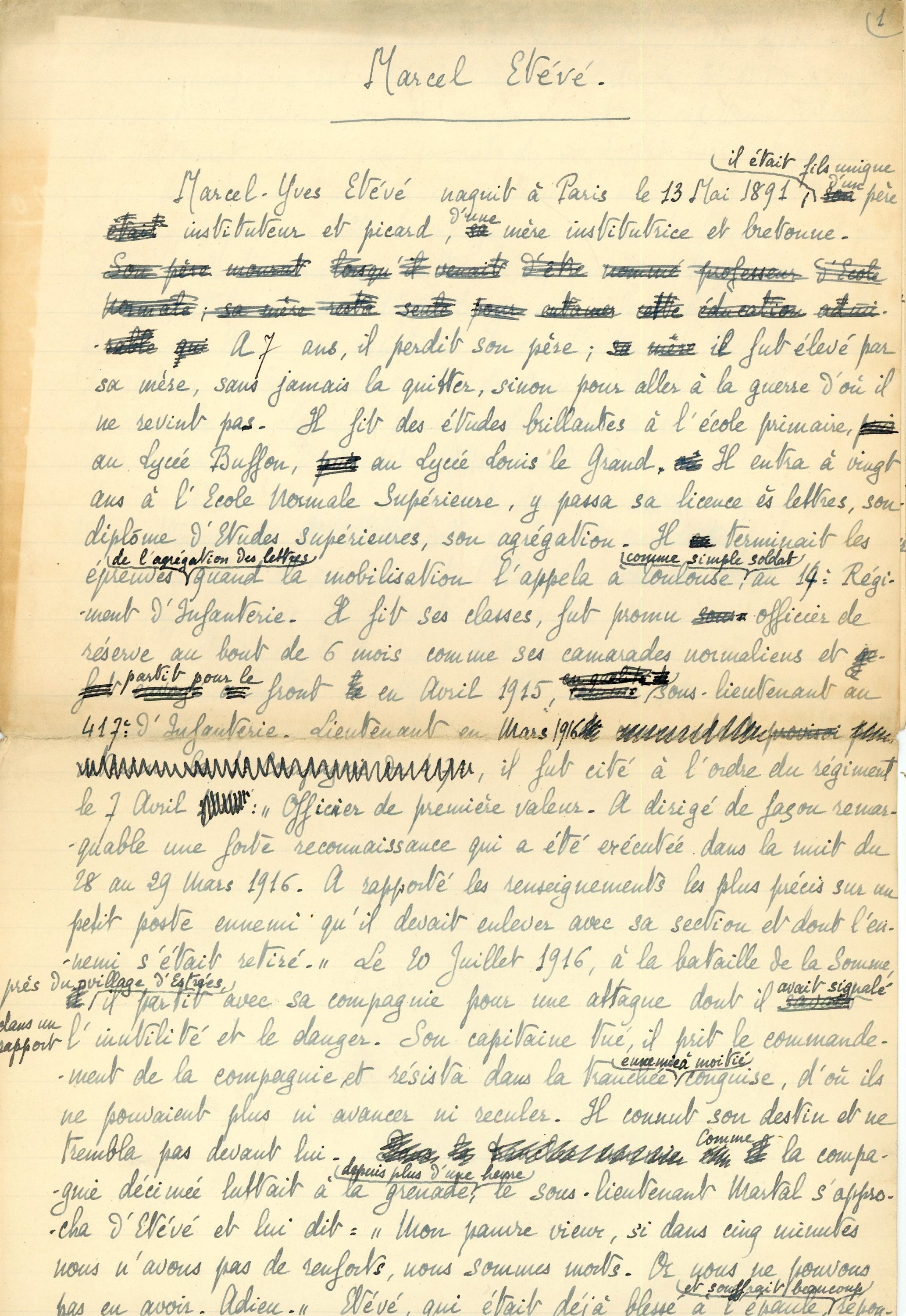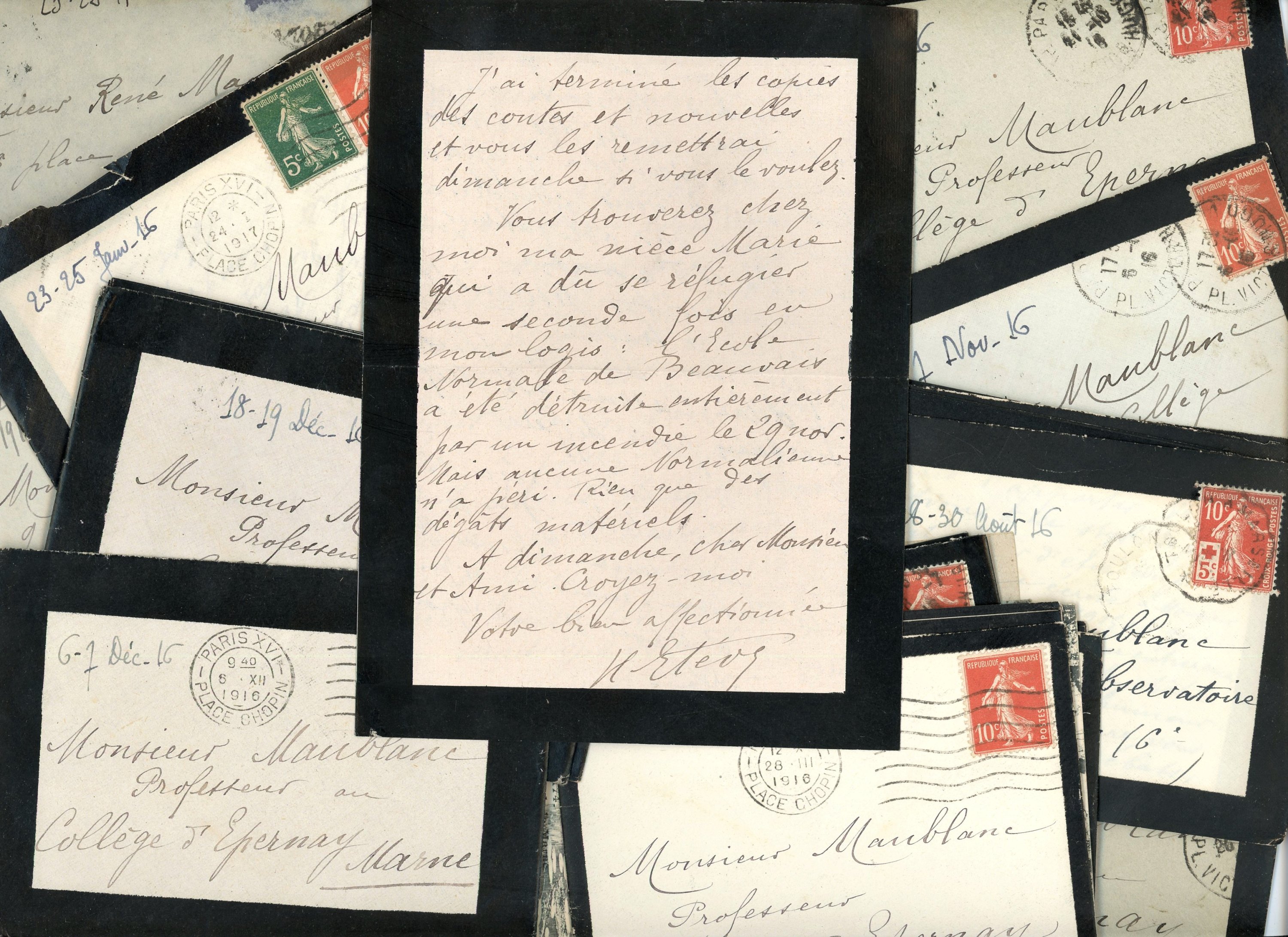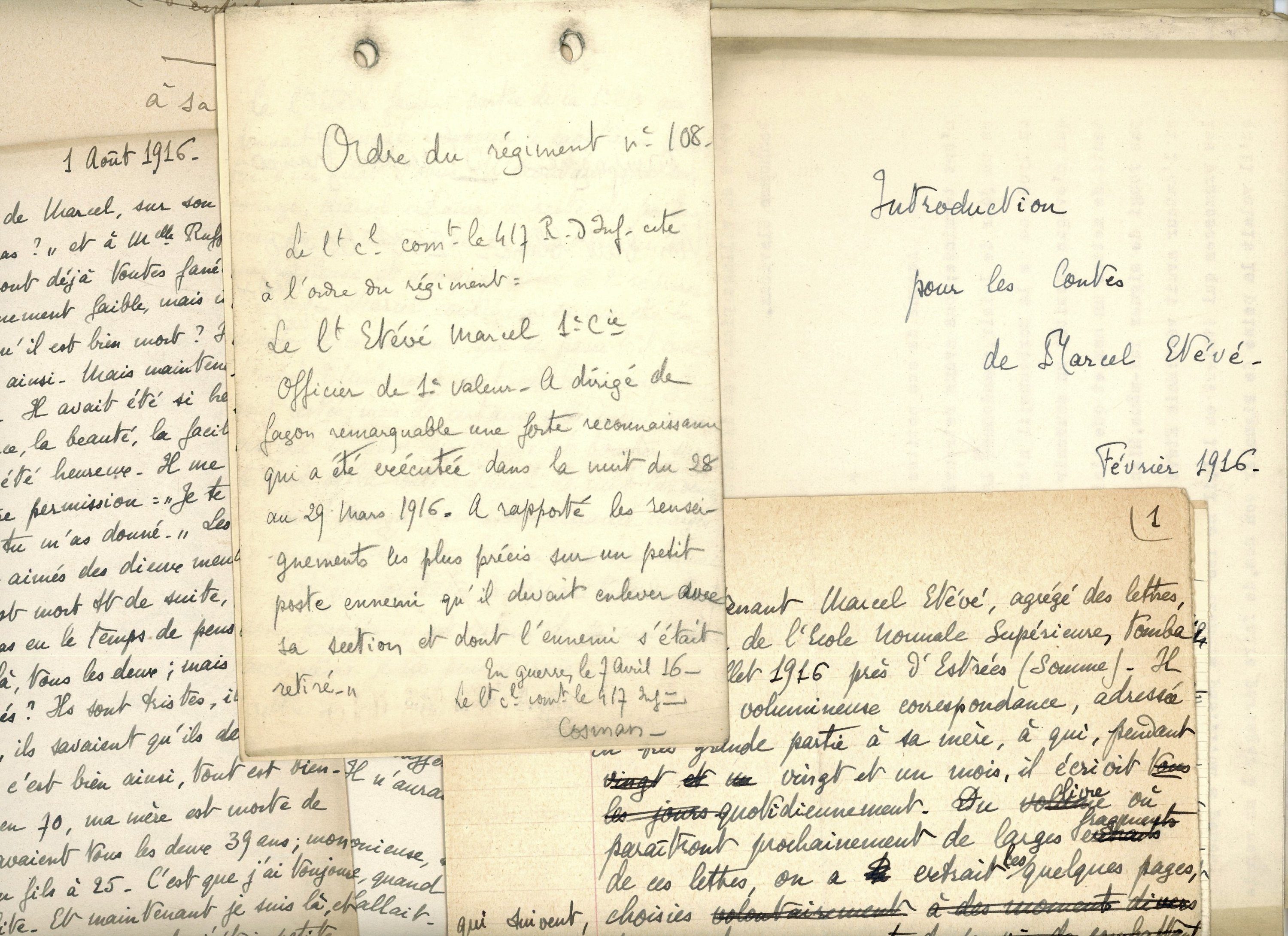 Lot de + de 60 pièces, dont:Réunion de manuscrits, notes et correspondance relatifs au travail de mémoire éditorial mené par René Maublanc et la mère de Marcel Étévé, dont:- Brouillons et notes manuscrites de R.M. en préparation de l'article « Lettres d'un combattant (1915-1916) » qu'il fit publier dans la Revue de Paris en 1917 + manuscrit de l'article + planches d'épreuves avant impression avec corrections ;- Manuscrit de la causerie intitulée « Marcel Étévé », prononcée à lAide Morale par R.M. le 24 février 1918 ;- Plusieurs notices manuscrites de R.M. en hommage à Étévé, destinées à être publiées dans diverses revues et journaux de l'époque ;- Coupures de presse et numéros de revues relatifs à Marcel Étévé, 1918-1919 dont n°12 de la Grande Revue de décembre 1917 contenant larticle « Premiers essais » de Marcel Étévé + tapuscrits de larticle avec corrections ;- Citations et bibliographies sur Marcel Étévé relevés par R.M., 1917-1919 ;- 28 L.A.S. et 22 P.A.S. Hélène Minguy épouse d'Hector Étévé et mère de Marcel, institutrice et directrice d'écoles primaires à Paris, adressées à R.M., 1914-1937.PLUS DE DESCRIPTIONS DANS LE CATALOGUE DE LA VENTE SUR ROUILLAC.COM SOUS LONGLET /CONSULTER LES DETAILS DE LA VENTE/