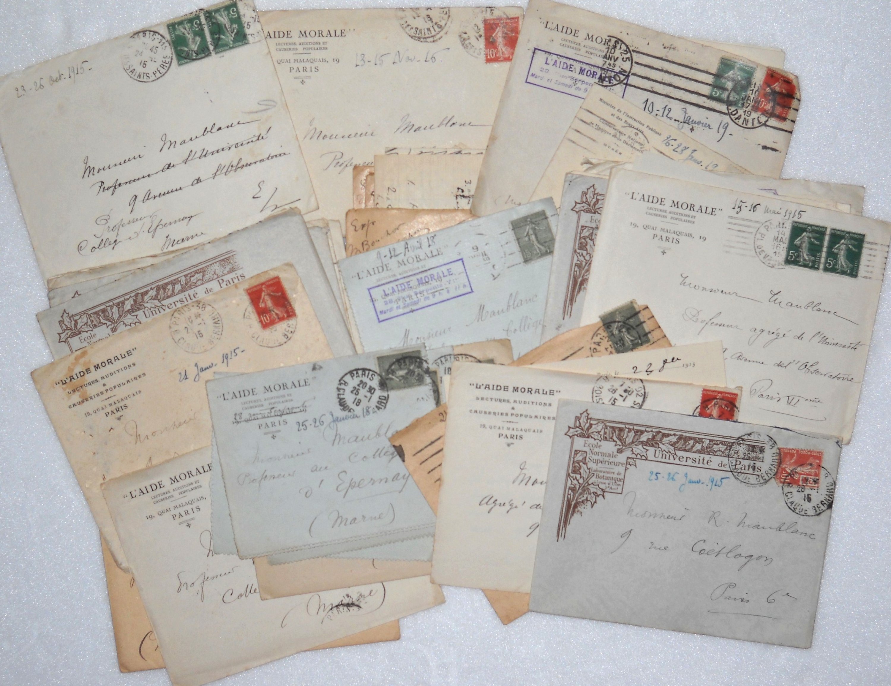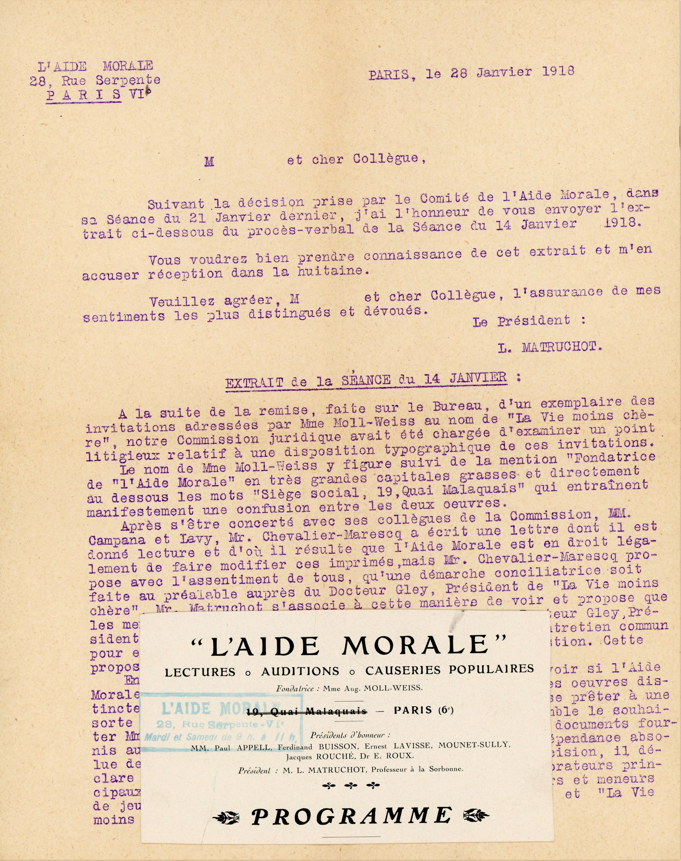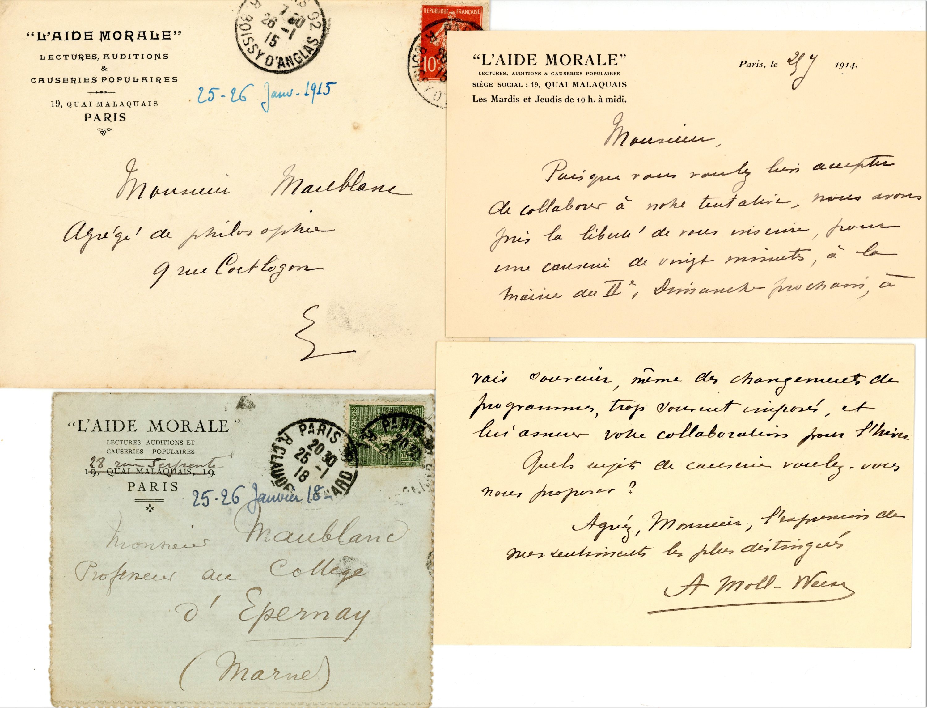 Correspondance adressée à Renée Maublanc, sollicité pour participer aux causeries (sujets choisis: Les secours de chômage, Les âmes des enfants, Lettres de Marcel Étévé), et pour l'organisation d'une journée conférence et audition en présence de Maurice Bouchor à Épernay: 2 P.A.S. et 2 L.A.S. Augusta MOLL-WEISS (1863-1946), féministe, fondatrice de lécole des Mères et de lAide Morale ; 12 P.A.S., 2 P.S. et 3 L.A.S. Louis MATRUCHOT (1863-1921), botaniste et professeur à lENS ; P.A.S. Jules TOUTAIN (1865-1961), archéologue et professeur à lENS ; 4 L.A.S. et 2 P.A.S. Maurice BOUCHOR (1855-1929), poète et auteur dramatique ; 2 P.A.S. et 4 L.A.S. de délégués d'arrondissements.